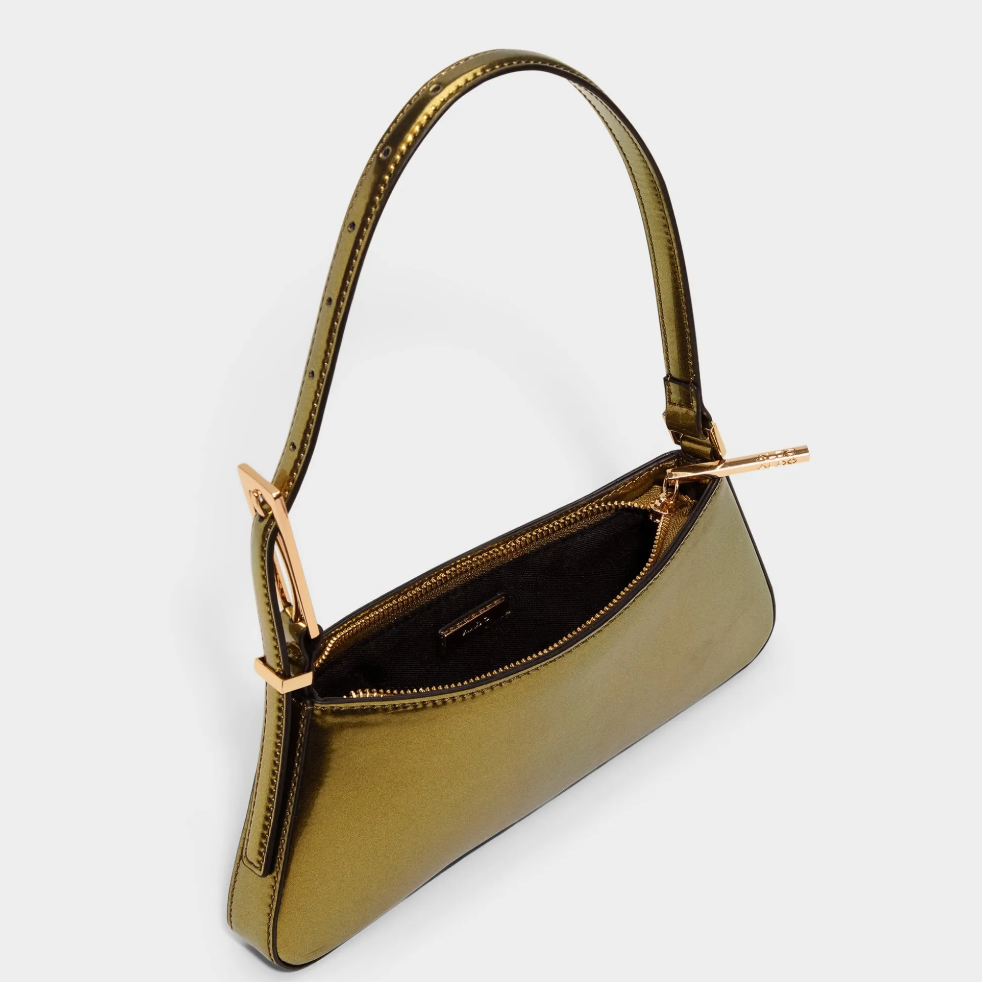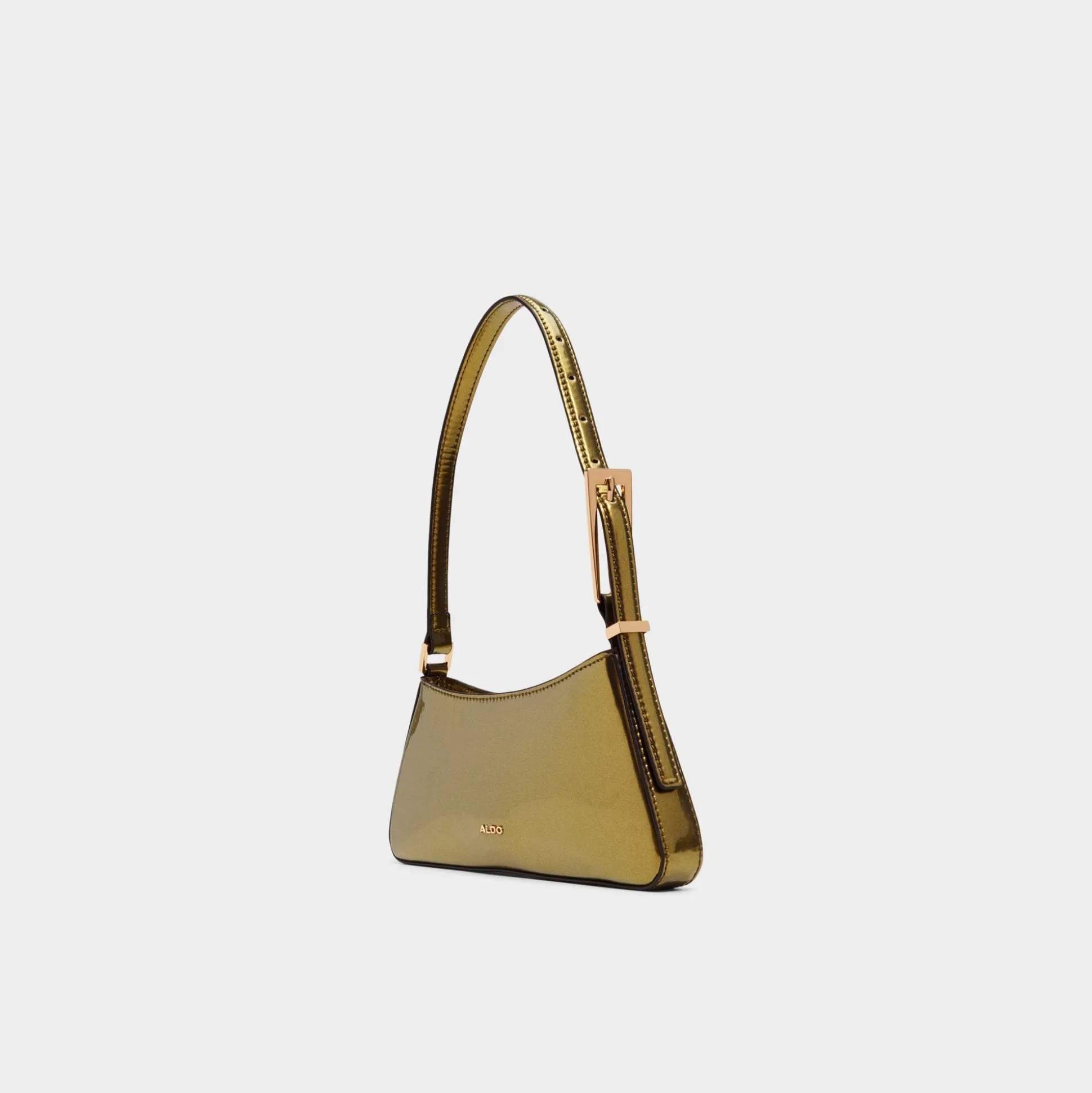 Molten-metal shine elevates this shoulder bag, hugging close under your arm as tonal stitching sculpts a sleek silhouette and a discreet zip keeps essentials secure, turning city moments into a small, radiant statement. Carry it with a silky slip for rooftop parties or sling it over denim after hours, finishing outfits with a confident, wearable glow.
