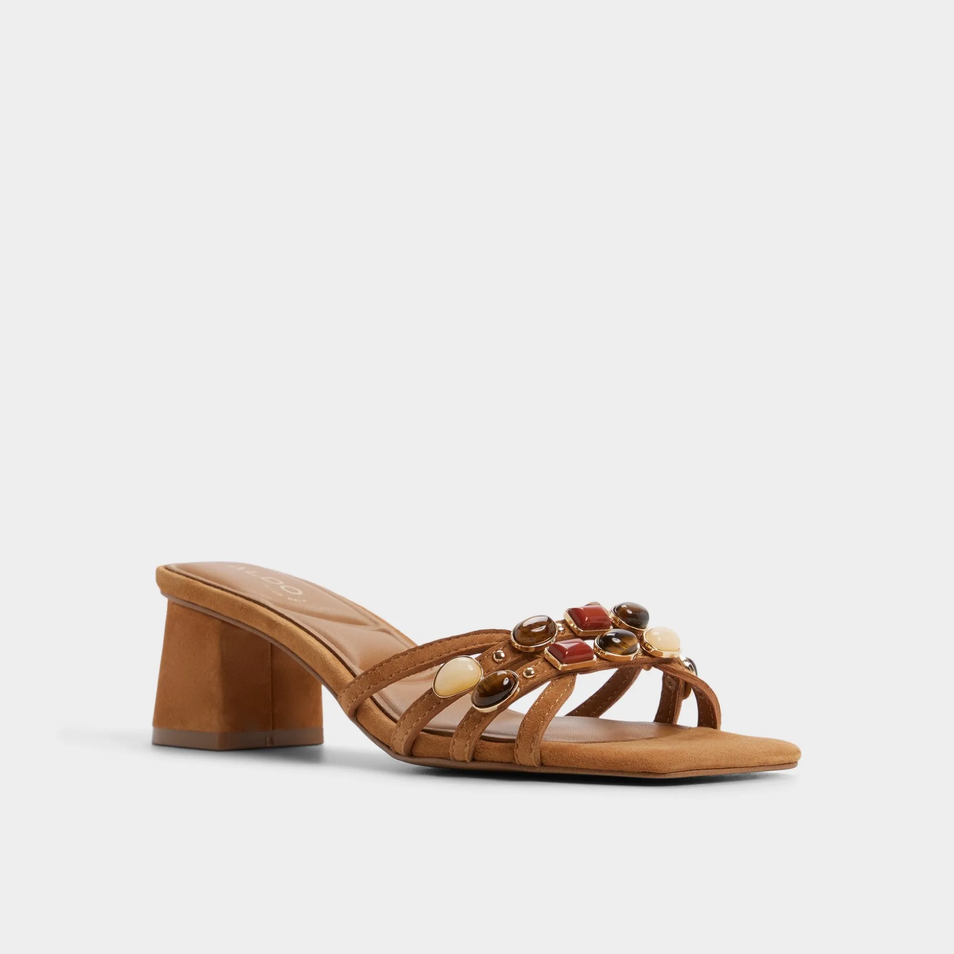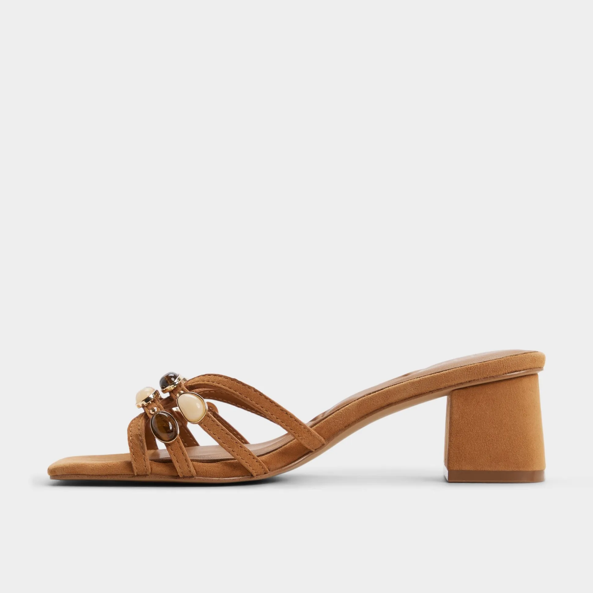 Elevate your vacation look with this caramel beige mule featuring shimmering gemstones on the front straps. The sturdy block heel offers all-day comfort while the sparkling embellishments add a touch of glamour to sundresses, linen pants, or resort wear. Easy to slip on and impossible to miss.