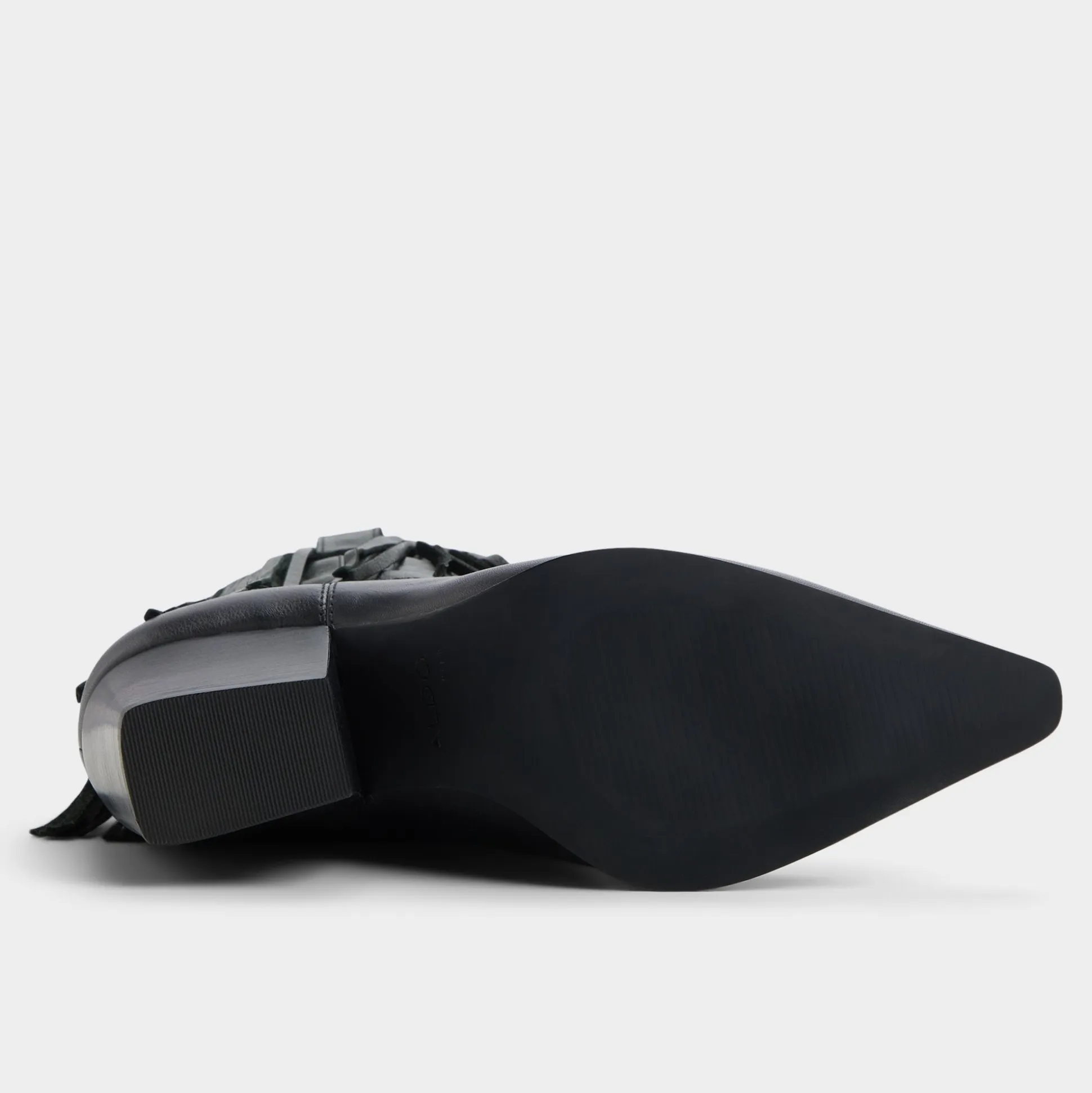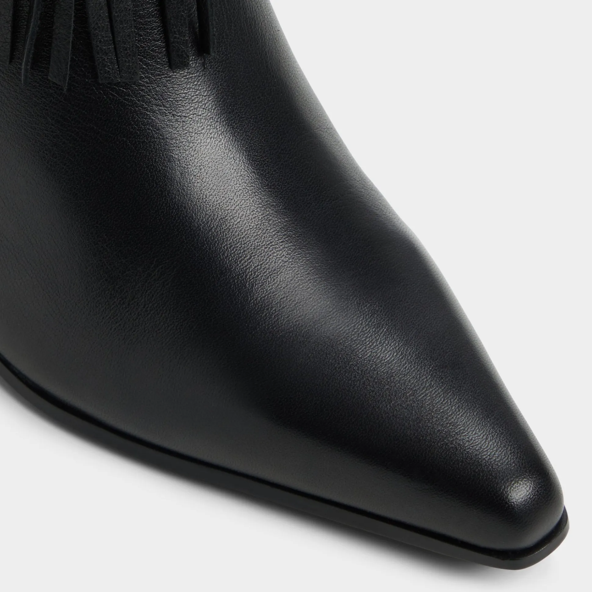 Fringe-trimmed supple black leather blooms around a pointed toe block heel, blending Western swagger with city polish in a statement silhouette that moves with you from street-ready errands to after-dark moments. Pair with cropped flares for record-store Saturdays, or swap in a swishy midi when festival nights call for extra rhythm.