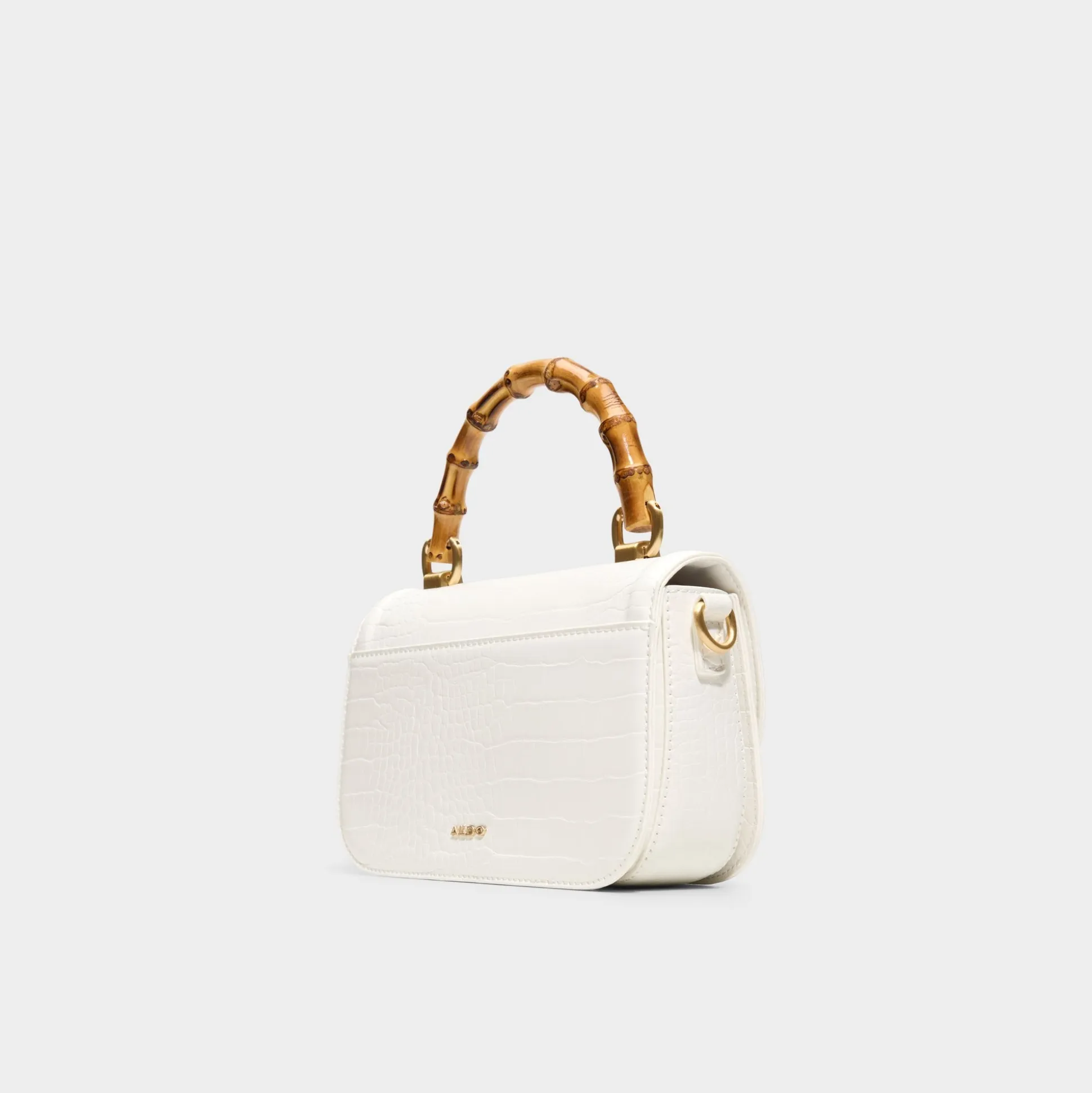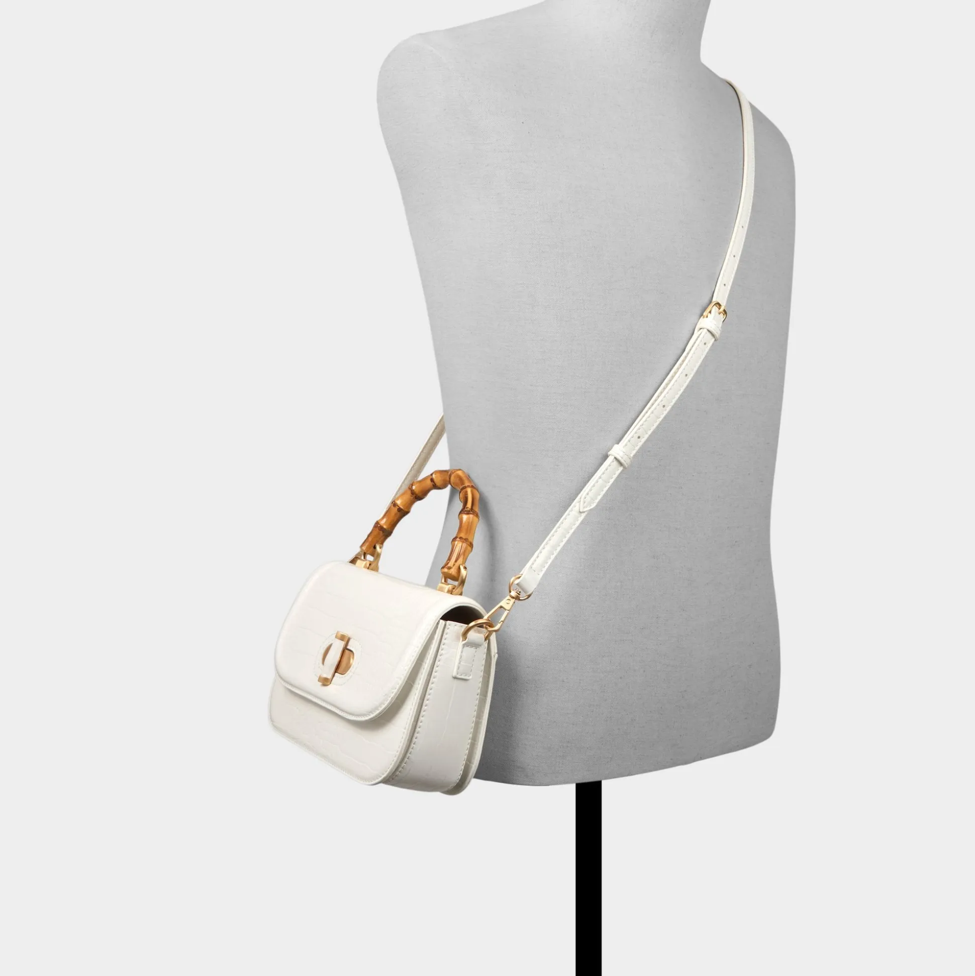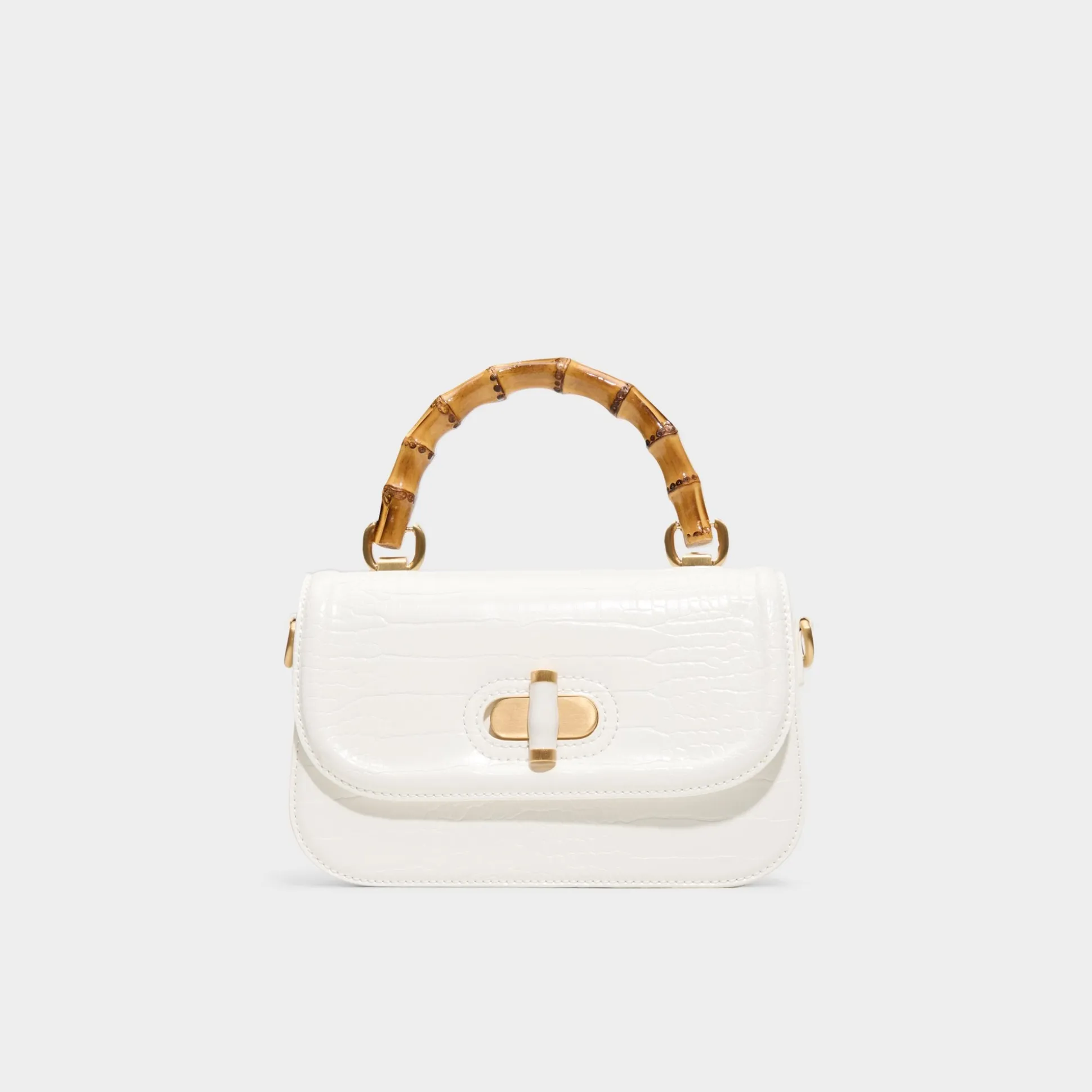 Crisp croc-embossed leather catches the eye as a chunky bamboo top handle steals the scene, finished with a turn-lock that hints at quiet luxury and everyday city polish. Carry it with tailored linen for office catch-ups, or tuck it under your arm with a sundress and sandals at cafe dates.
