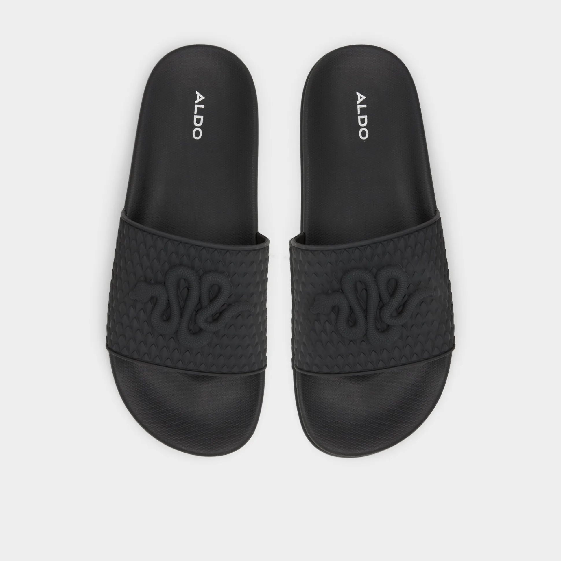 Spice up your laidback looks with these sleek slides adorned with a standout snake ornament.