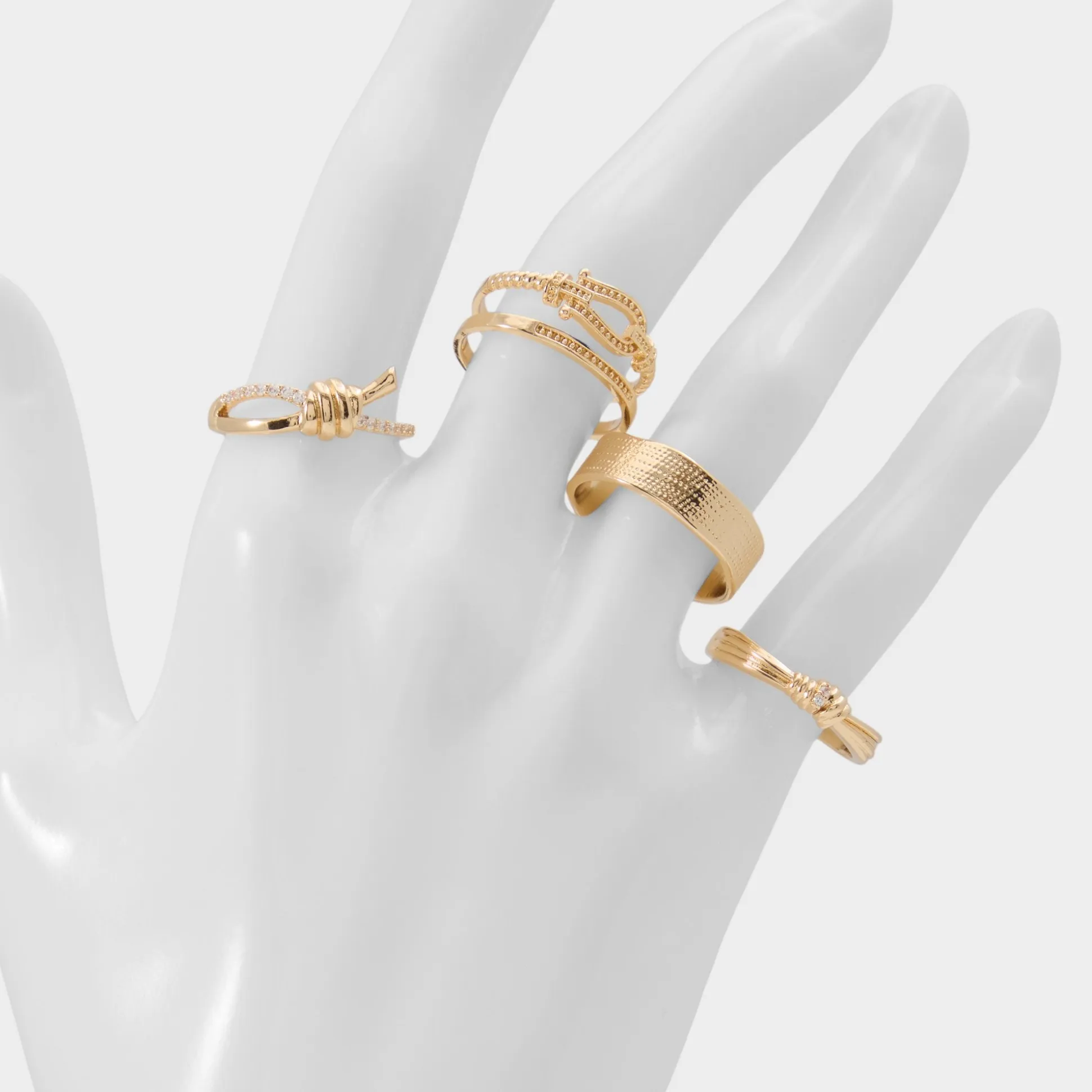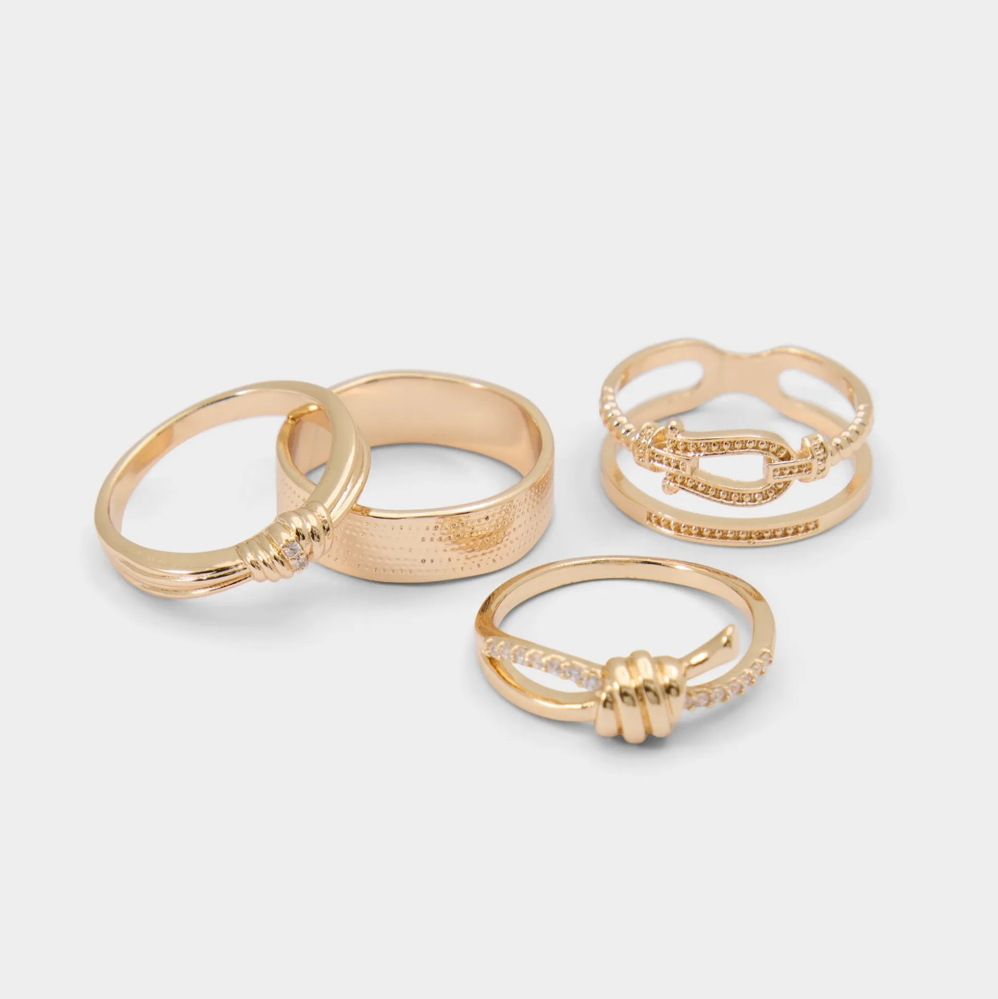Rope-knot texture threads through four gold-tone rings in a band lineup, with pave-lined chain lending stack appeal that feels collected yet carefree every day. Layer them with a latte blazer for presentation mornings, or stack beside a denim tee for sunset concerts.
