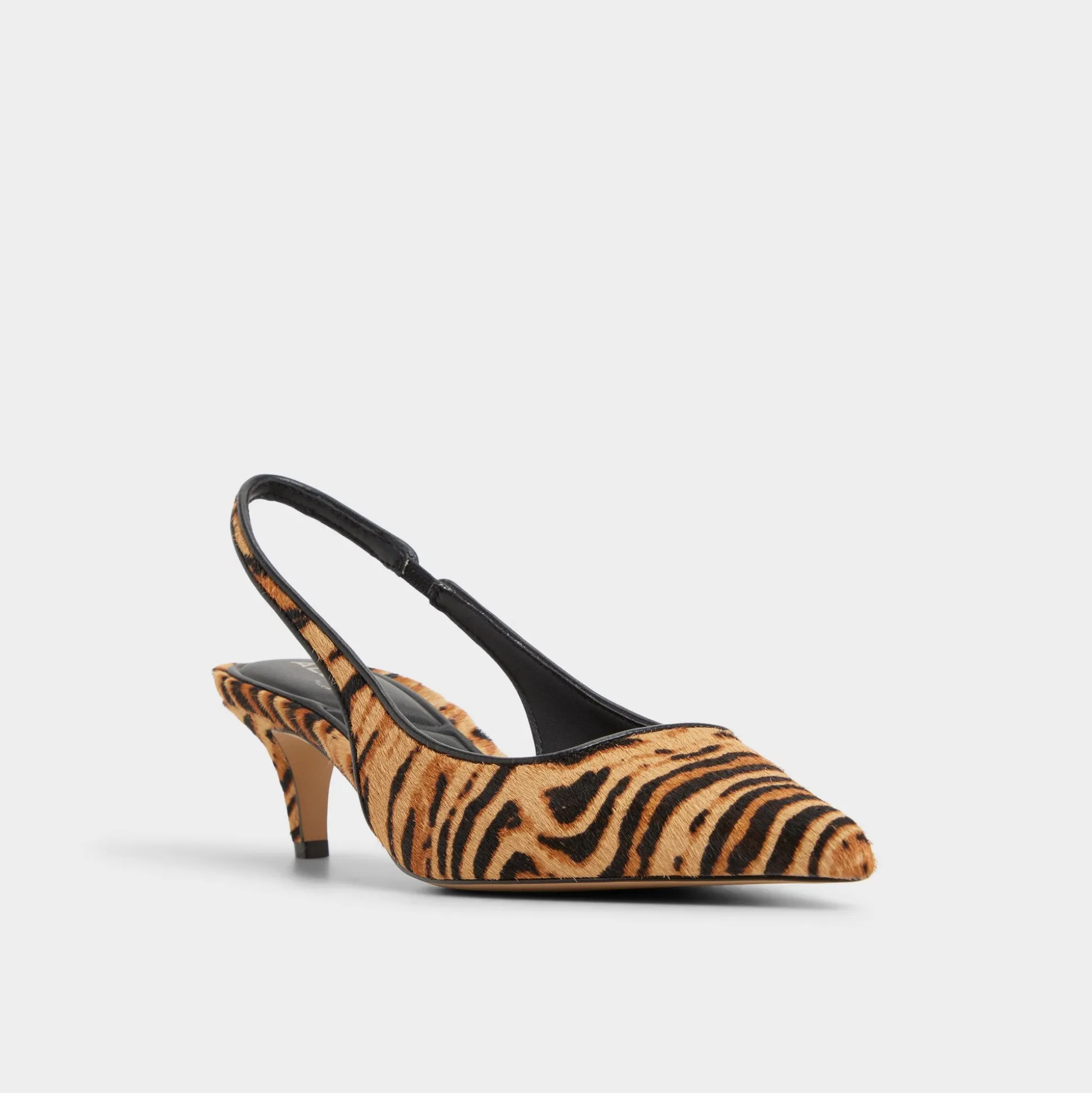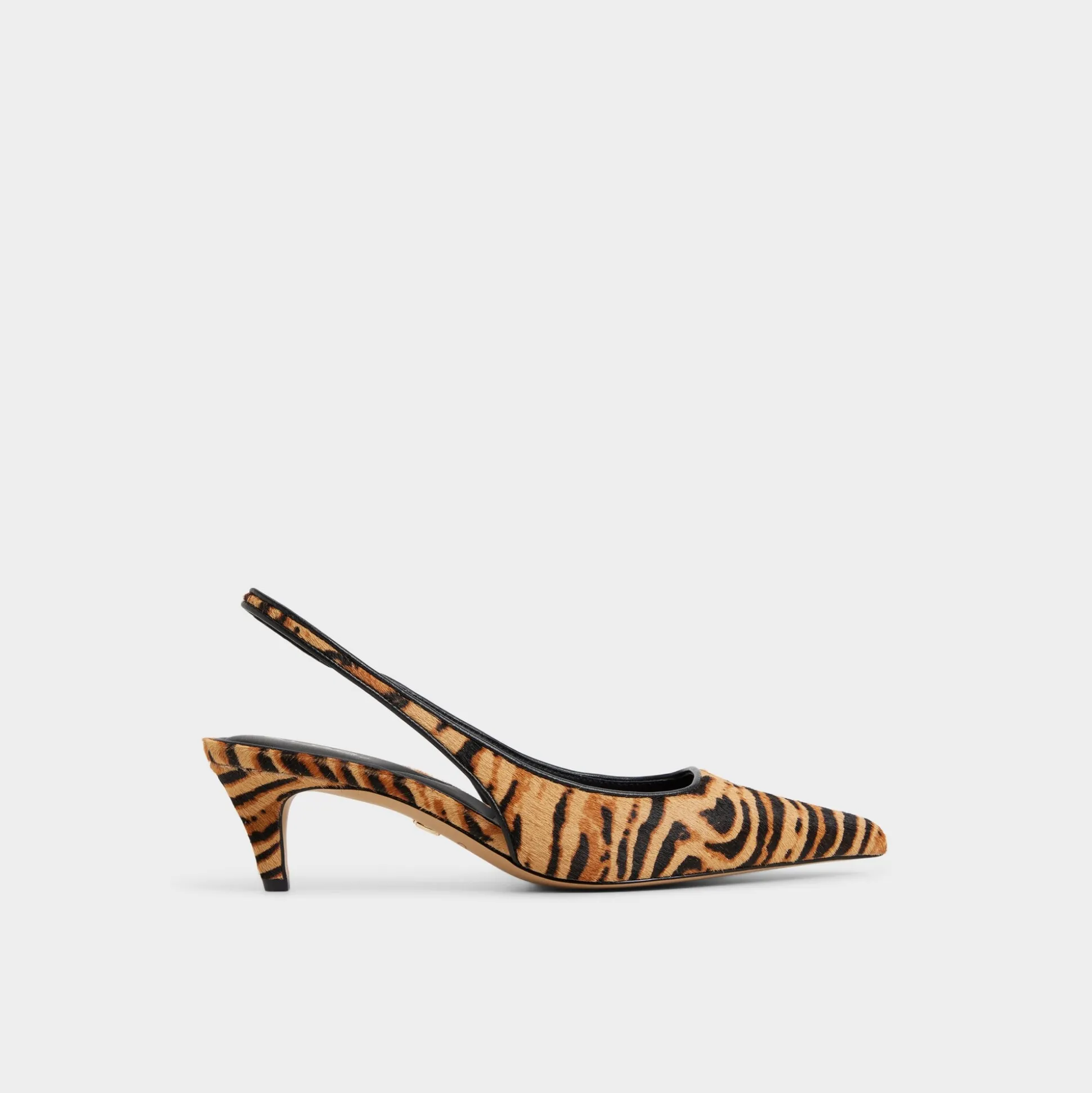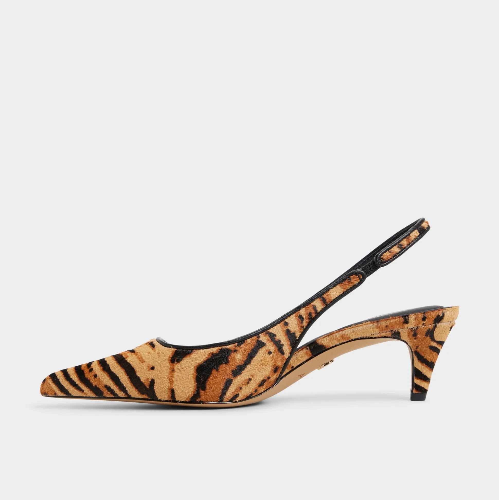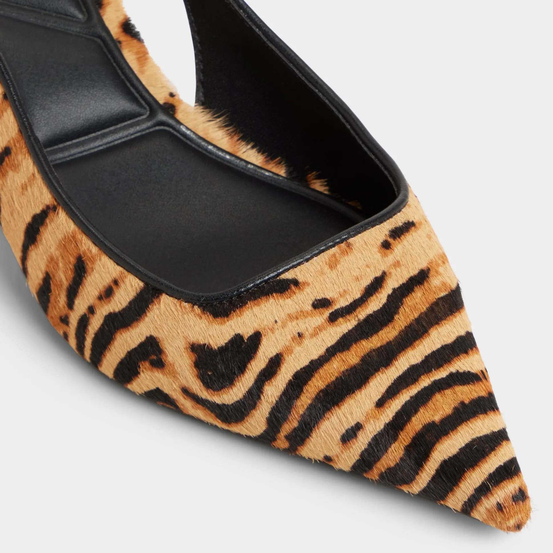 Tiger-print haircalf cloaks razor-pointed toes in a sleek silhouette, while elastic slingbacks keep the look easy from city sidewalks to after-dark dinners as you glide through morning meetings, coffee runs, and sunset strolls. Pair with tailored trousers for Monday briefs, or slip under a midi dress for rooftop drinks as dusk turns electric.
