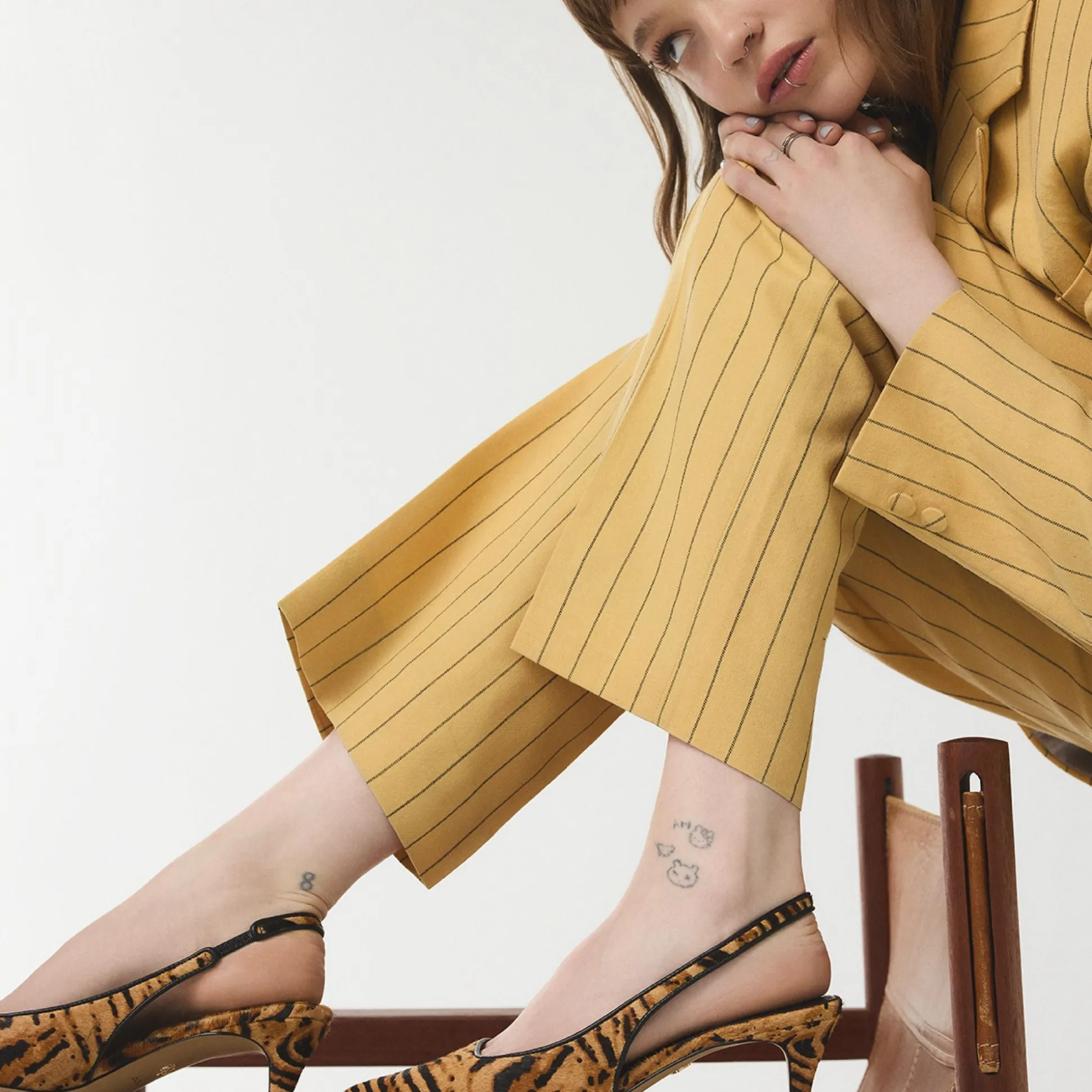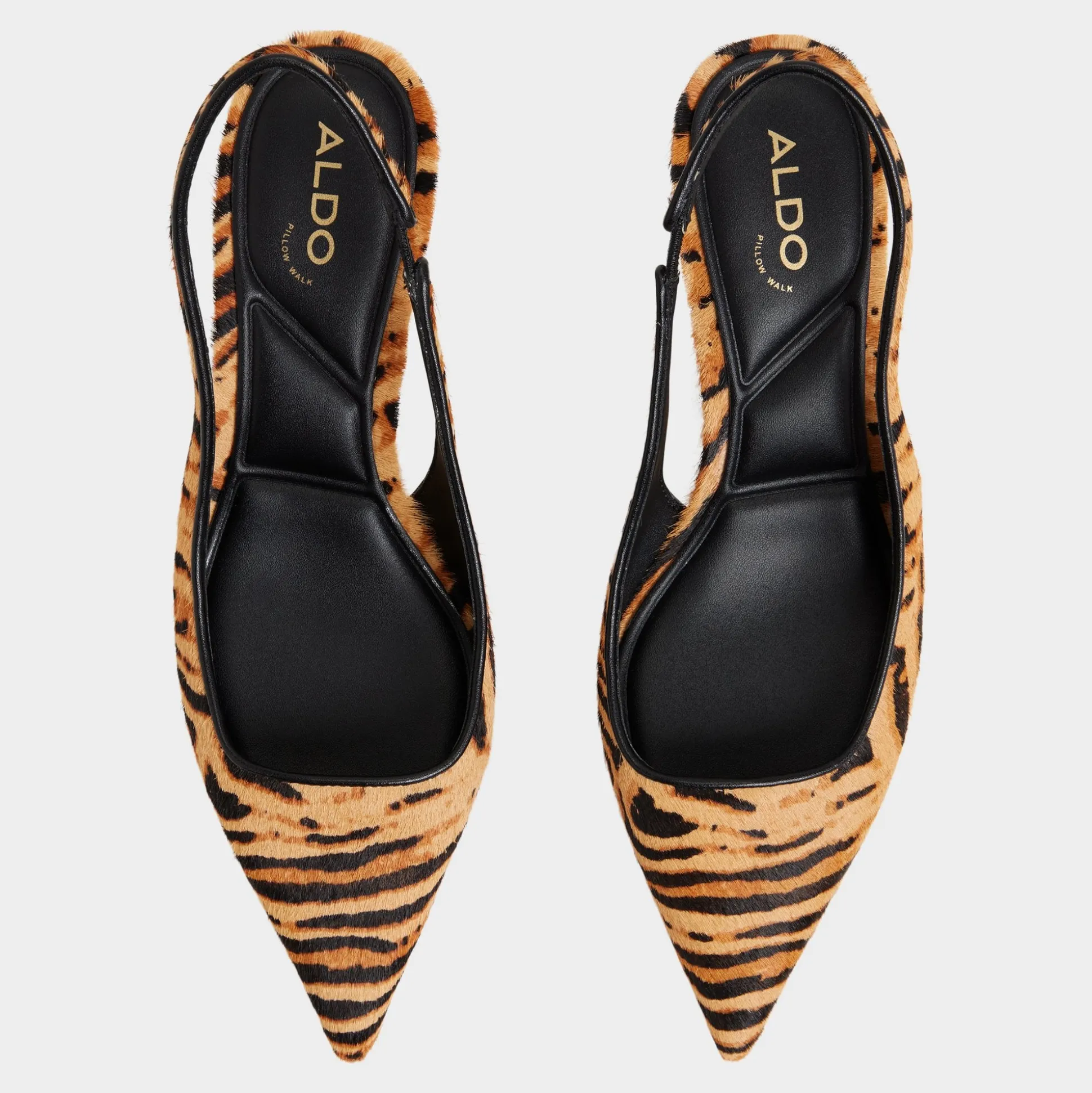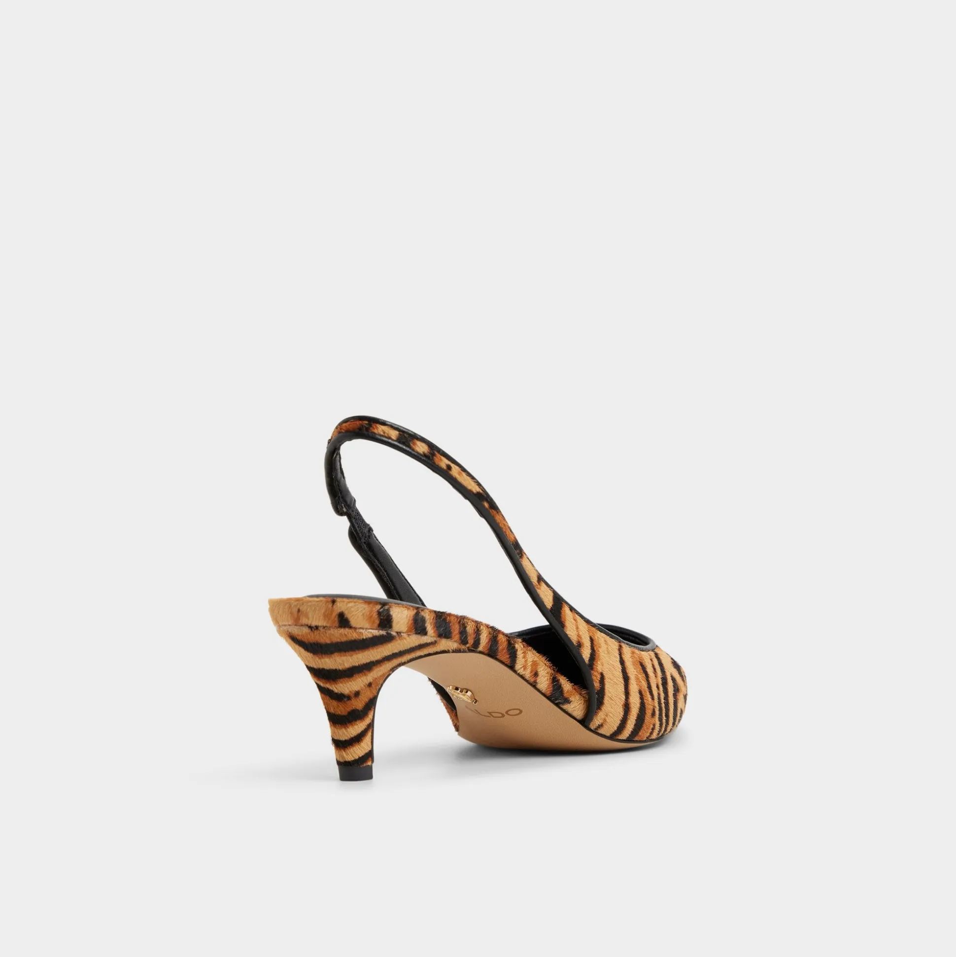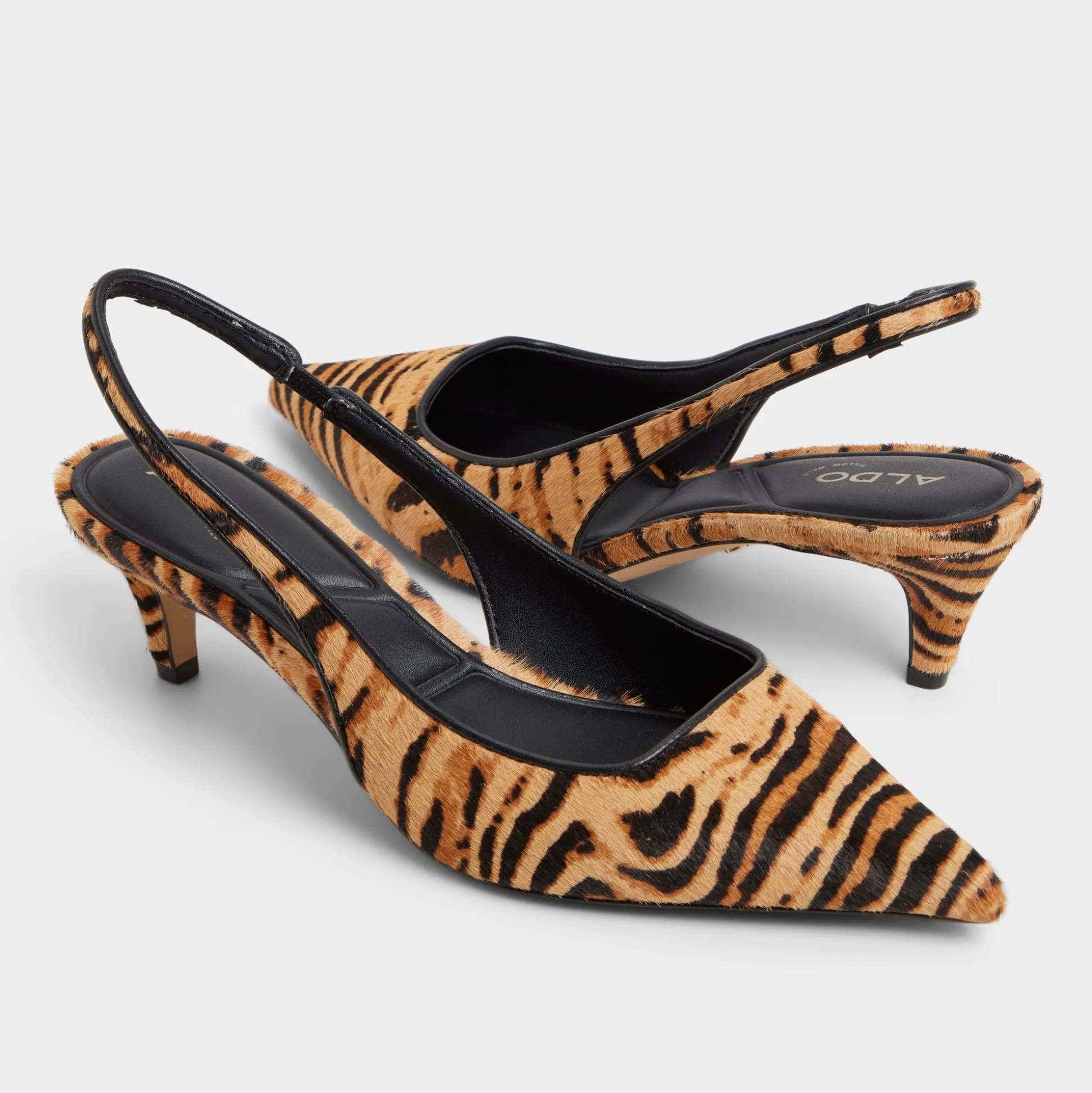 Tiger-print haircalf cloaks razor-pointed toes in a sleek silhouette, while elastic slingbacks keep the look easy from city sidewalks to after-dark dinners as you glide through morning meetings, coffee runs, and sunset strolls. Pair with tailored trousers for Monday briefs, or slip under a midi dress for rooftop drinks as dusk turns electric.