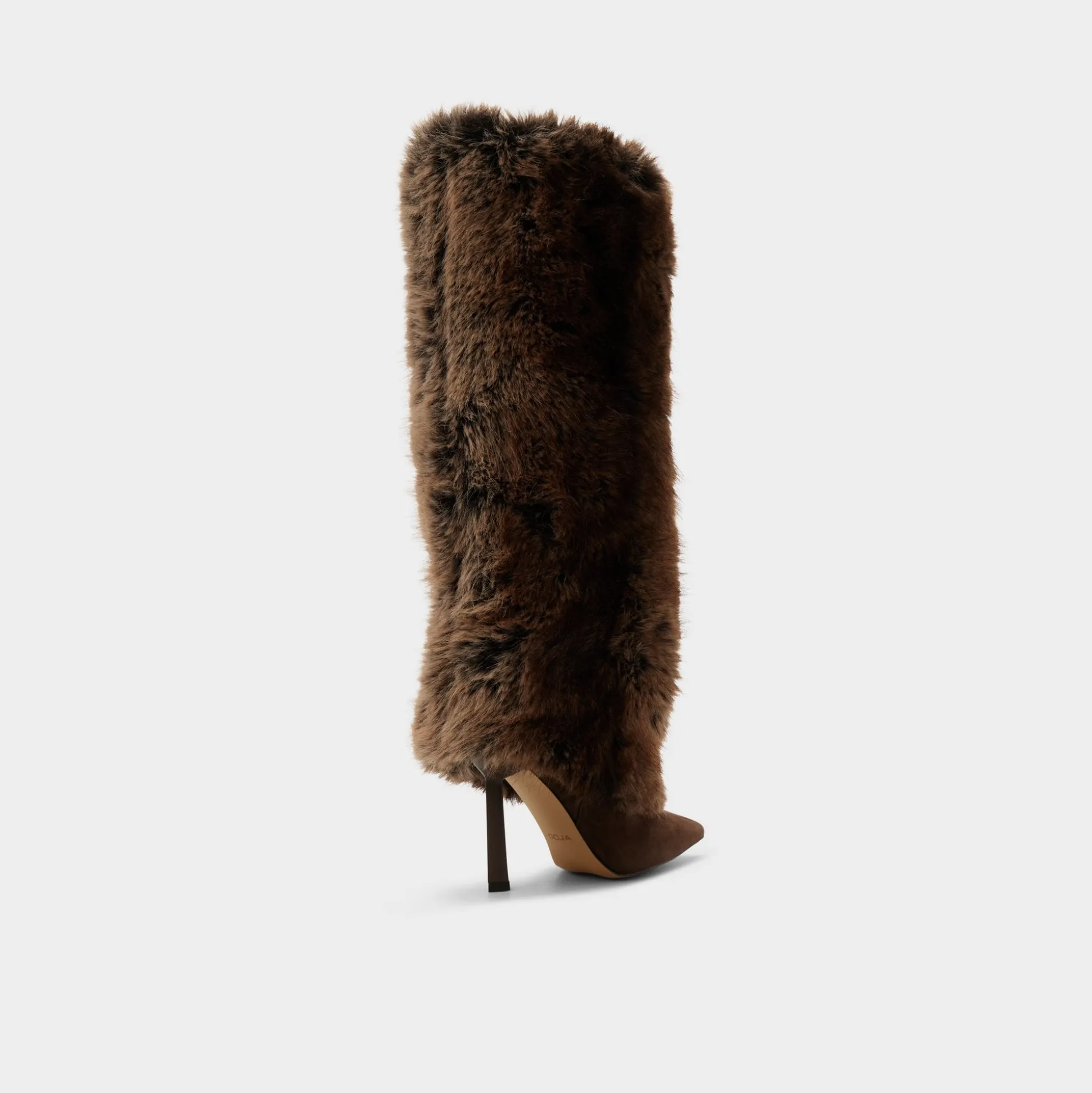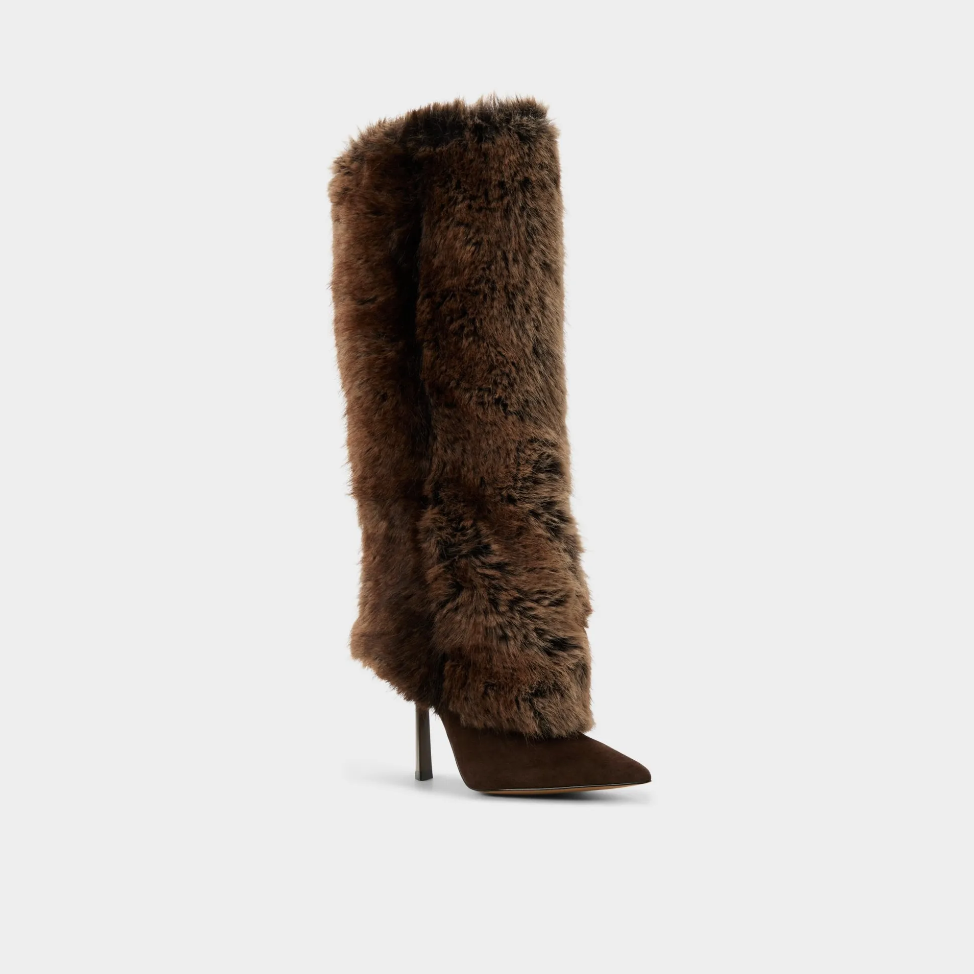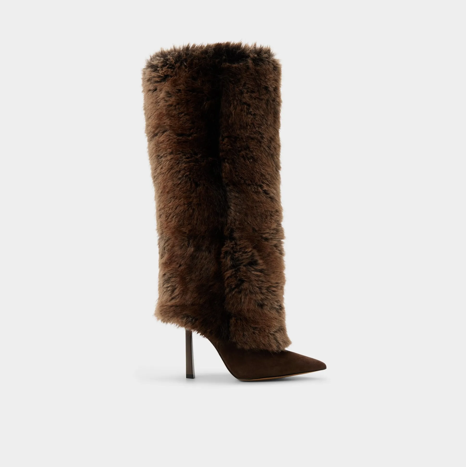 A plush runway-tall column of faux fur wraps this pointy-toe knee boot, while the suede vamp and slim stiletto keep things sleek, turning every sidewalk breeze into a personal photobooth. Pair with leather shorts for late-night gallery hops, or ground a sweaterdress when apres-ski cocoa turns into terrace cocktails.