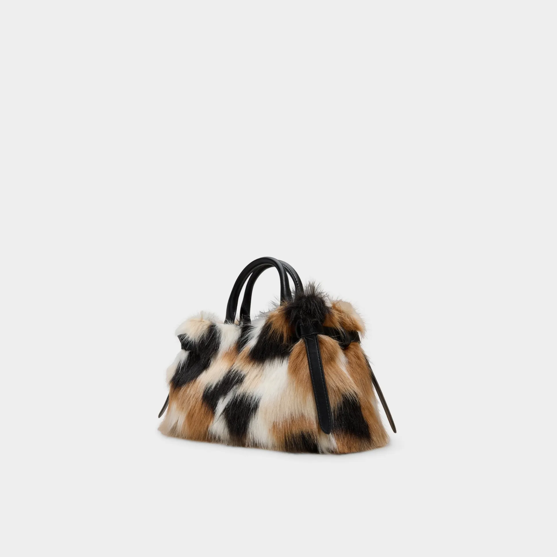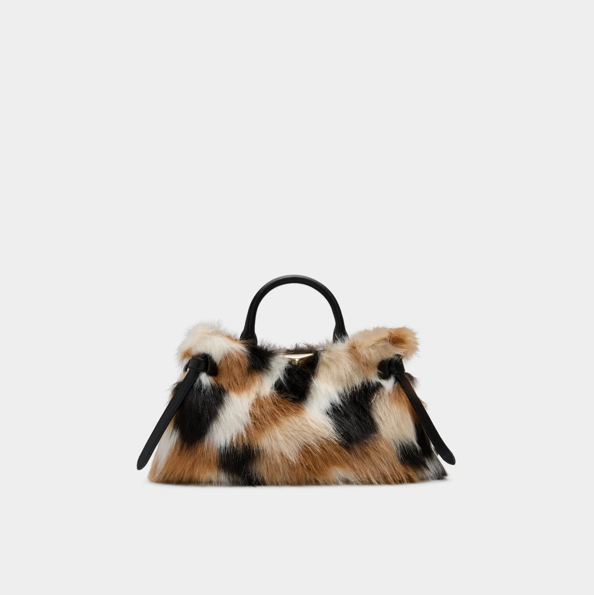 Patchwork faux fur wraps this top-handle bag in apres-ski charm, a super-soft texture catching the light as hidden drawstrings cinch the interior and gold hardware peeks through cozy layers. Carry it from coffee runs to evening plans, tucking a dress or cozy layer into the look for a warm finish you can wear everywhere.