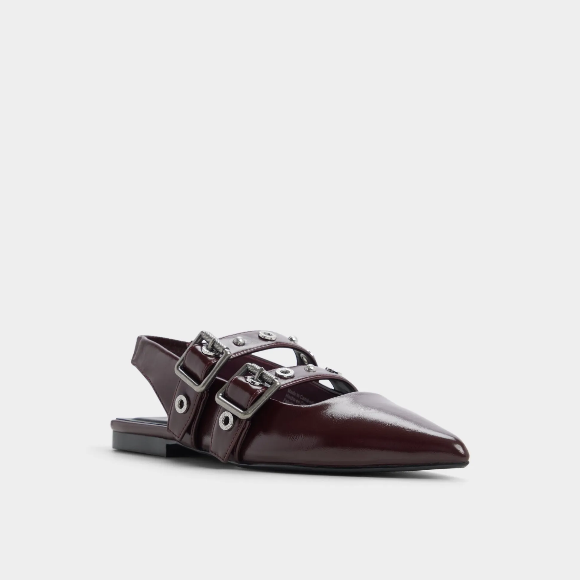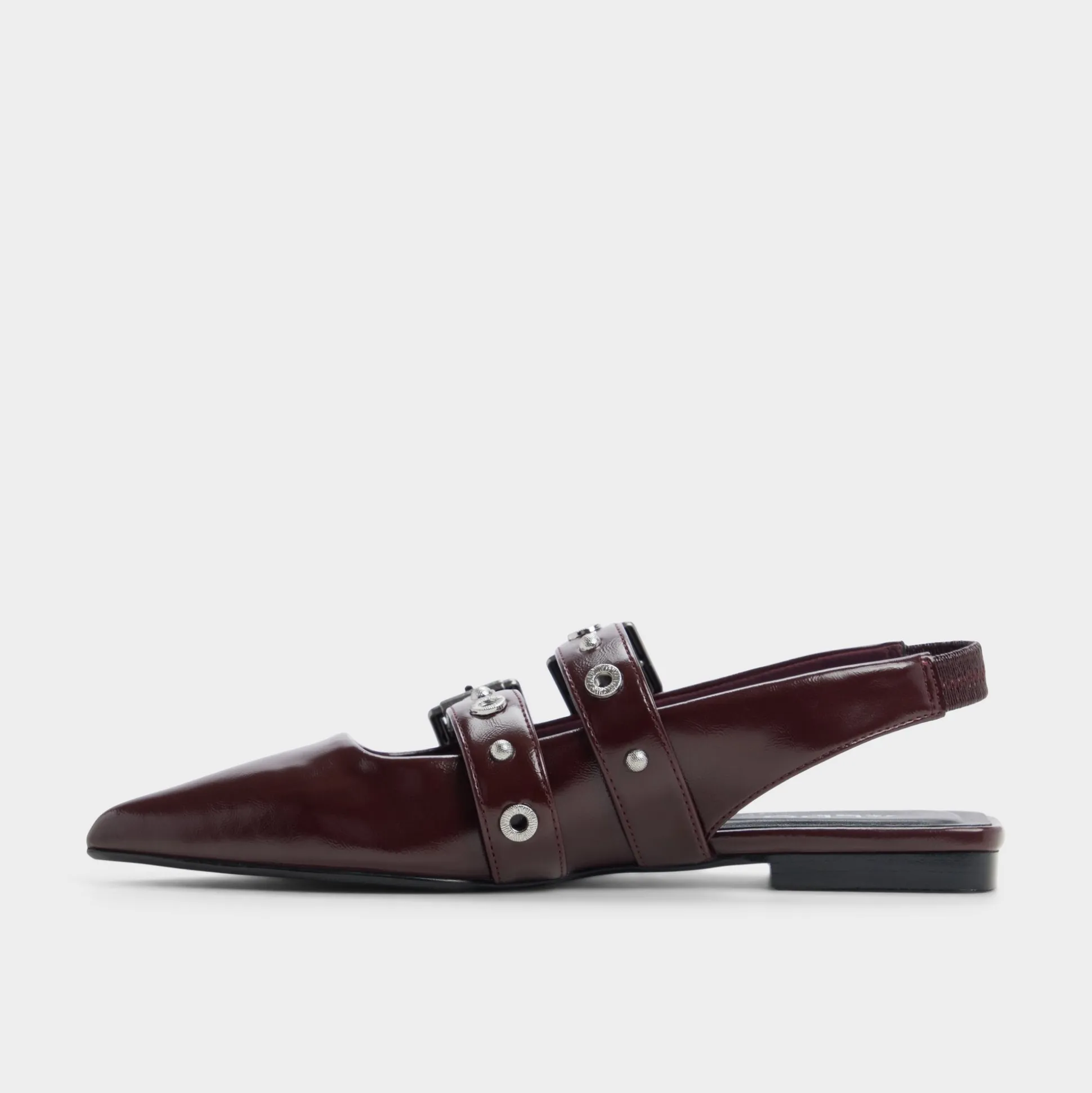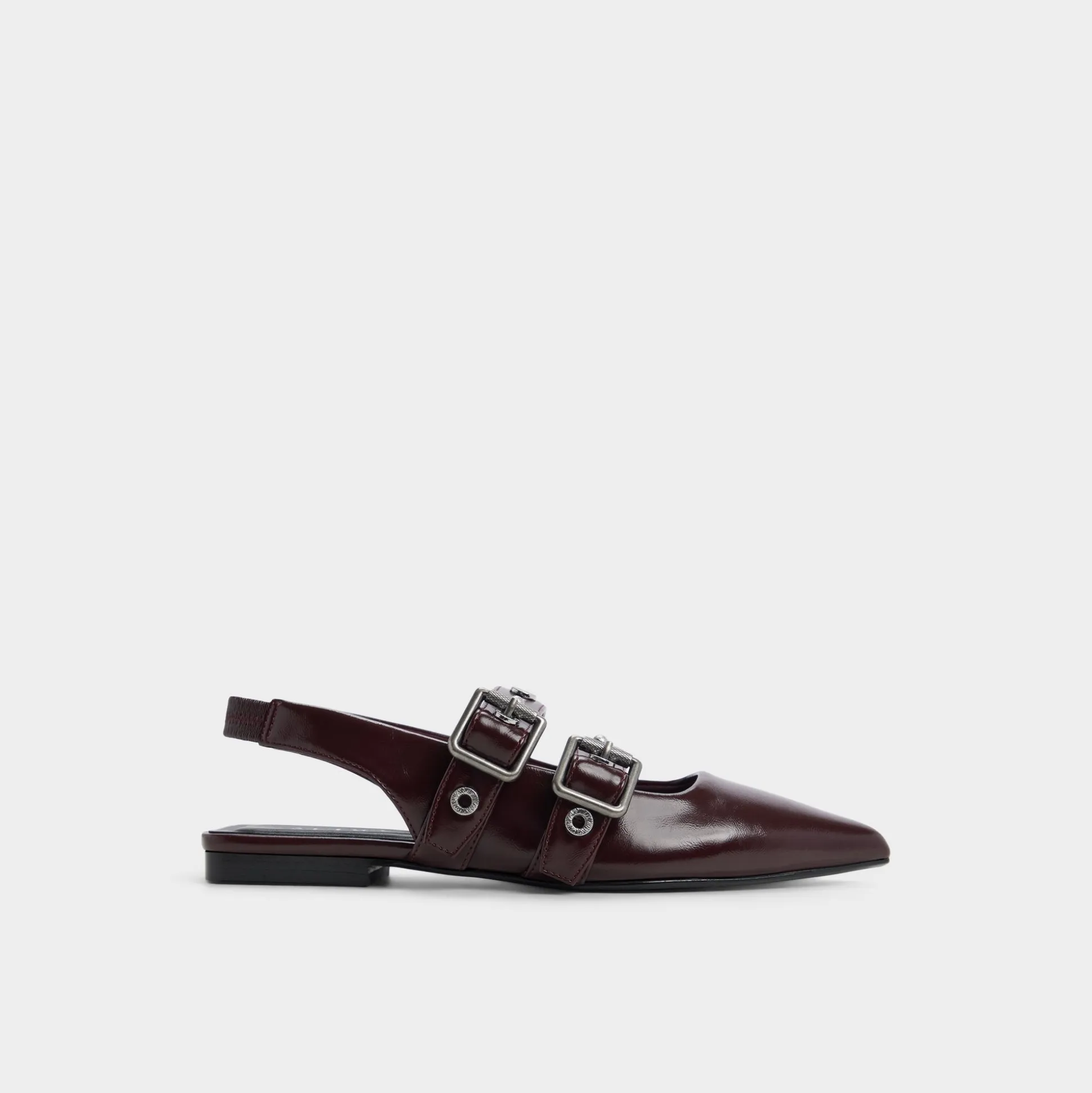 Sleek wine-hued leather meets twin polished buckles on a pointed slingback flat, offering quiet edge and day-long ease with cushioned lining and a barely-there heel that keeps strides smooth from brainstorm huddle to gallery detour. Pair with tailored trousers for pitch days, or slip in under a skirt when date-night streets call.