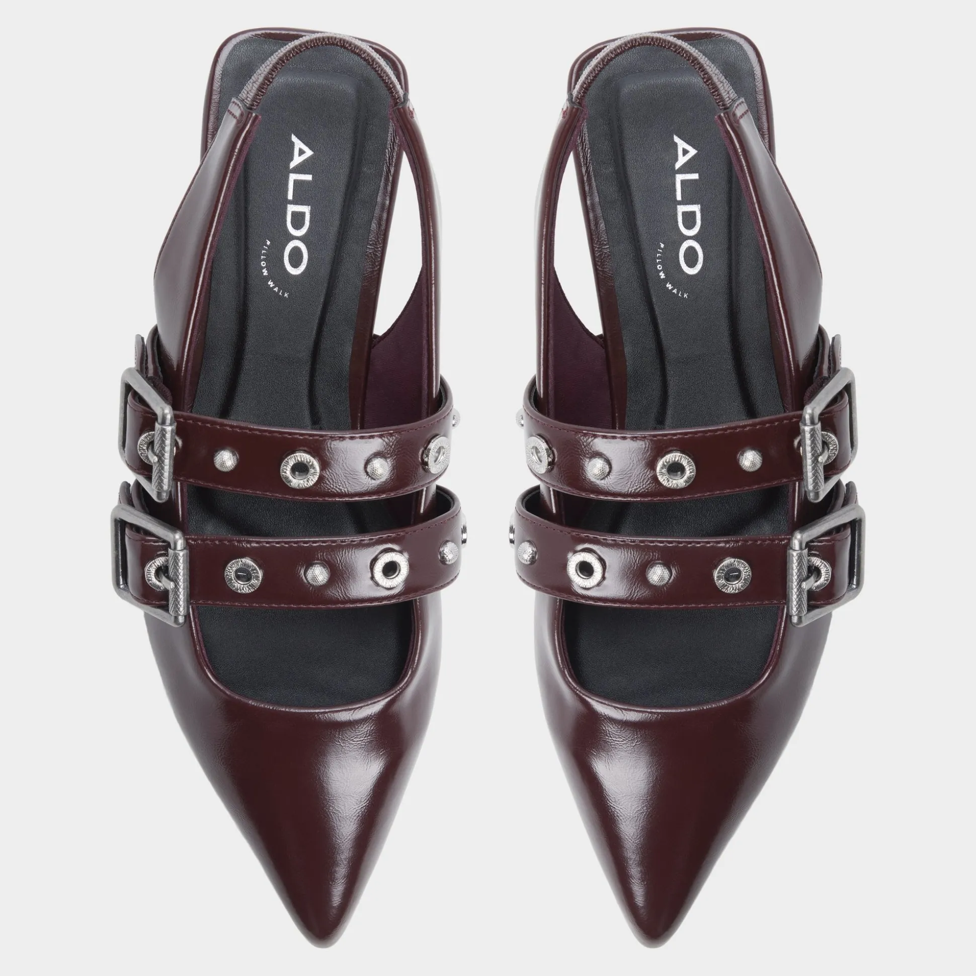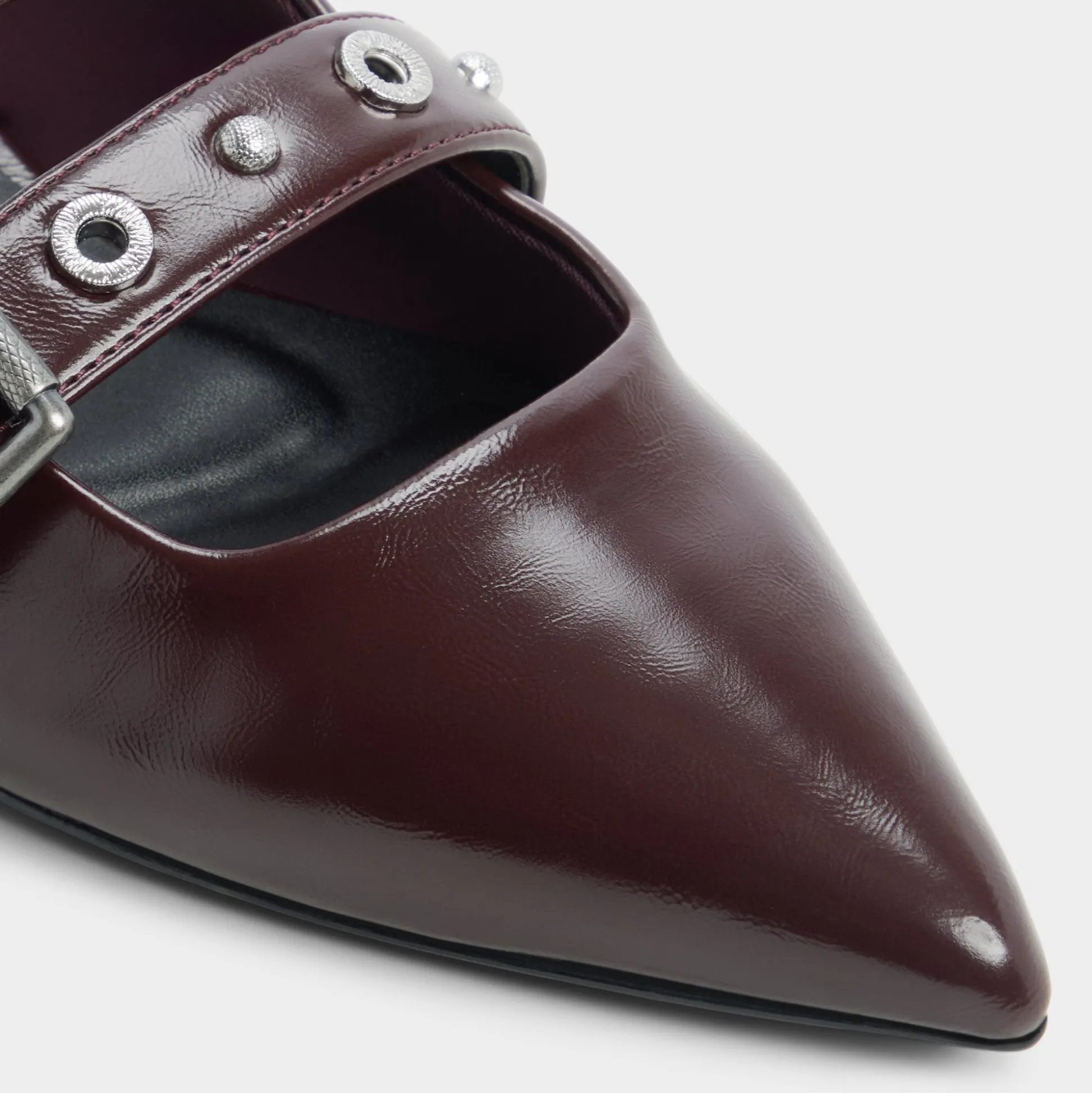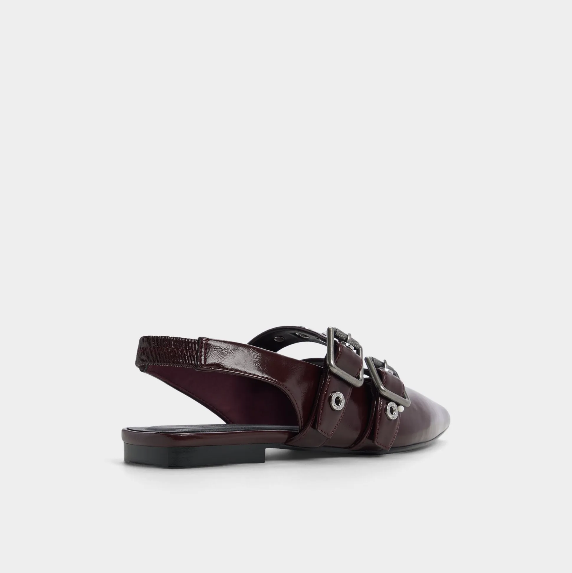 Sleek wine-hued leather meets twin polished buckles on a pointed slingback flat, offering quiet edge and day-long ease with cushioned lining and a barely-there heel that keeps strides smooth from brainstorm huddle to gallery detour. Pair with tailored trousers for pitch days, or slip in under a skirt when date-night streets call.
