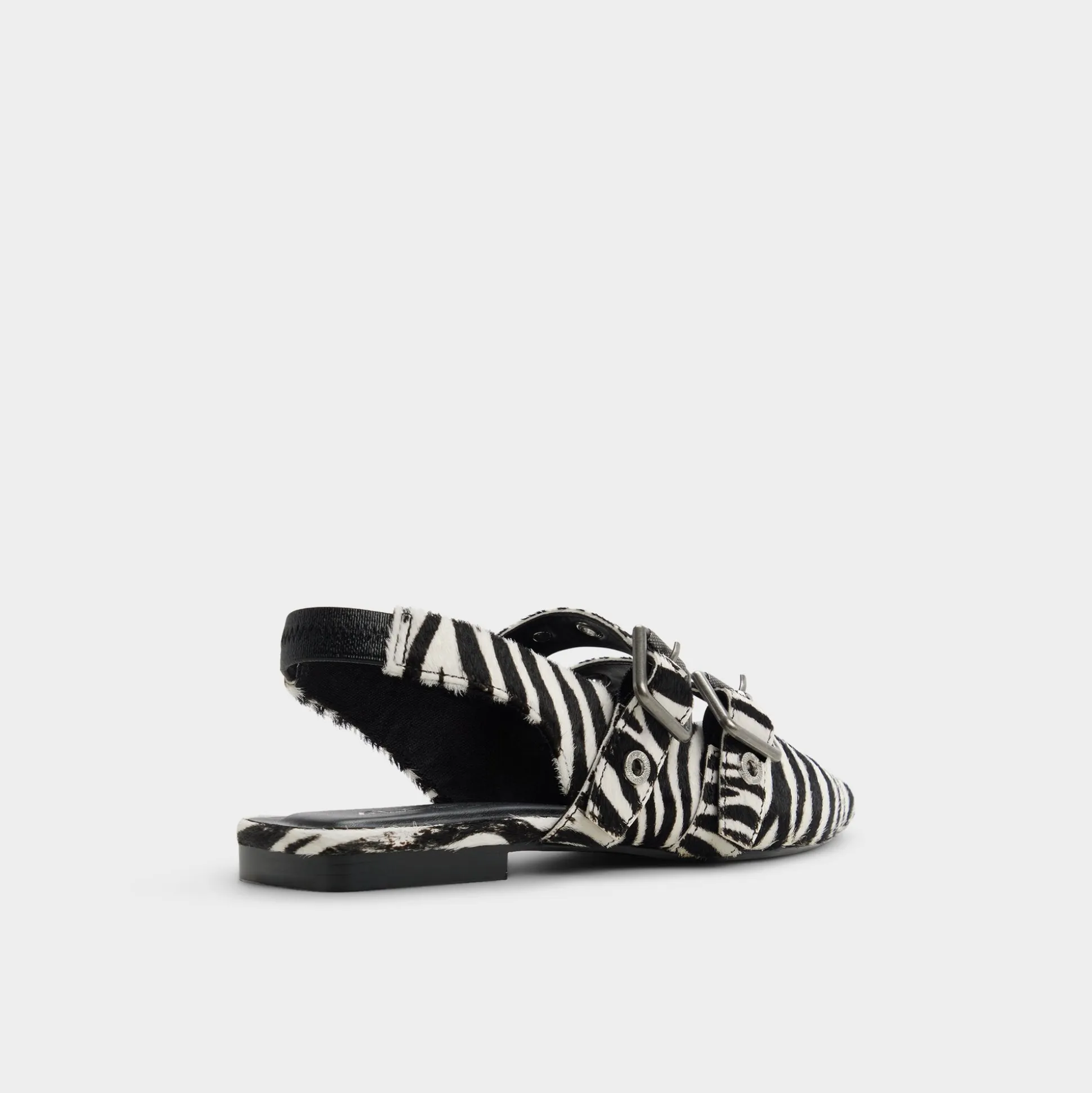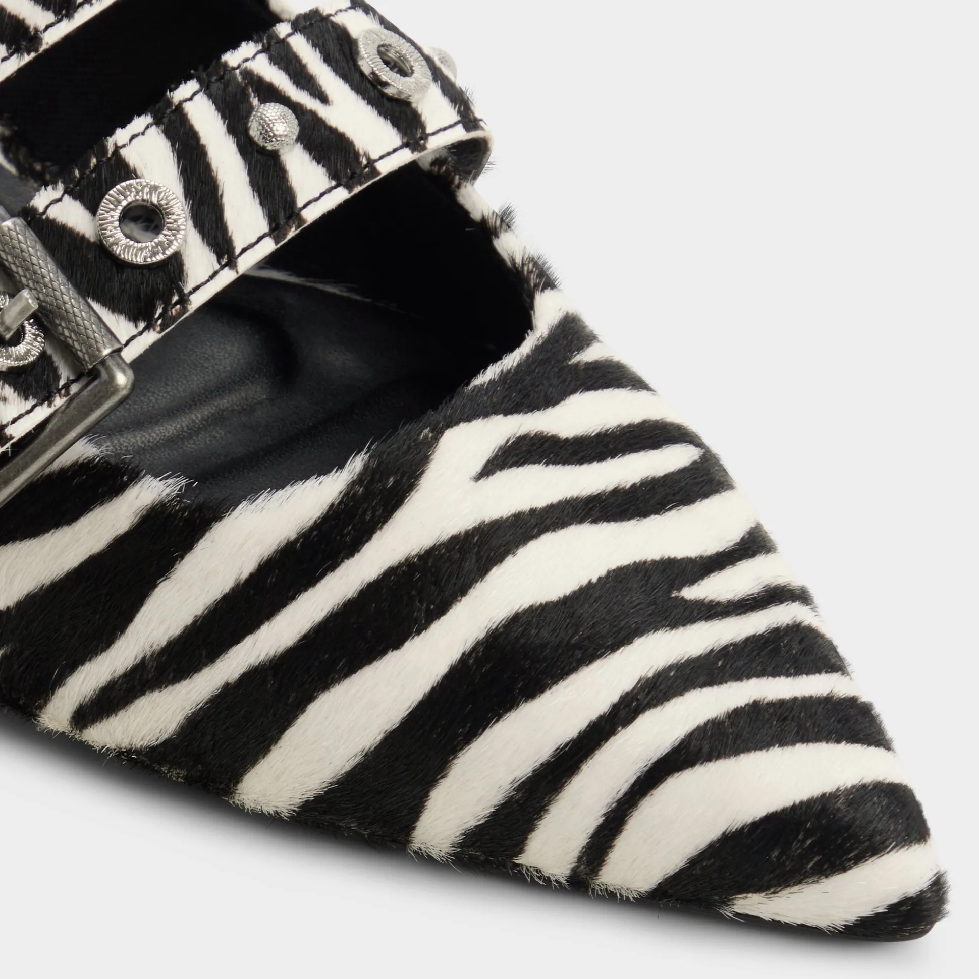 Wild zebra stripes in soft faux fur meet two polished buckles on this pointy slingback, turning the classic flat into a conversation starter that walks easy from sidewalk huddles to after-dark detours. Pair with cropped black denim for midday brainstorms, or ground a satin slip dress when gallery openings blur into midnight ramen.