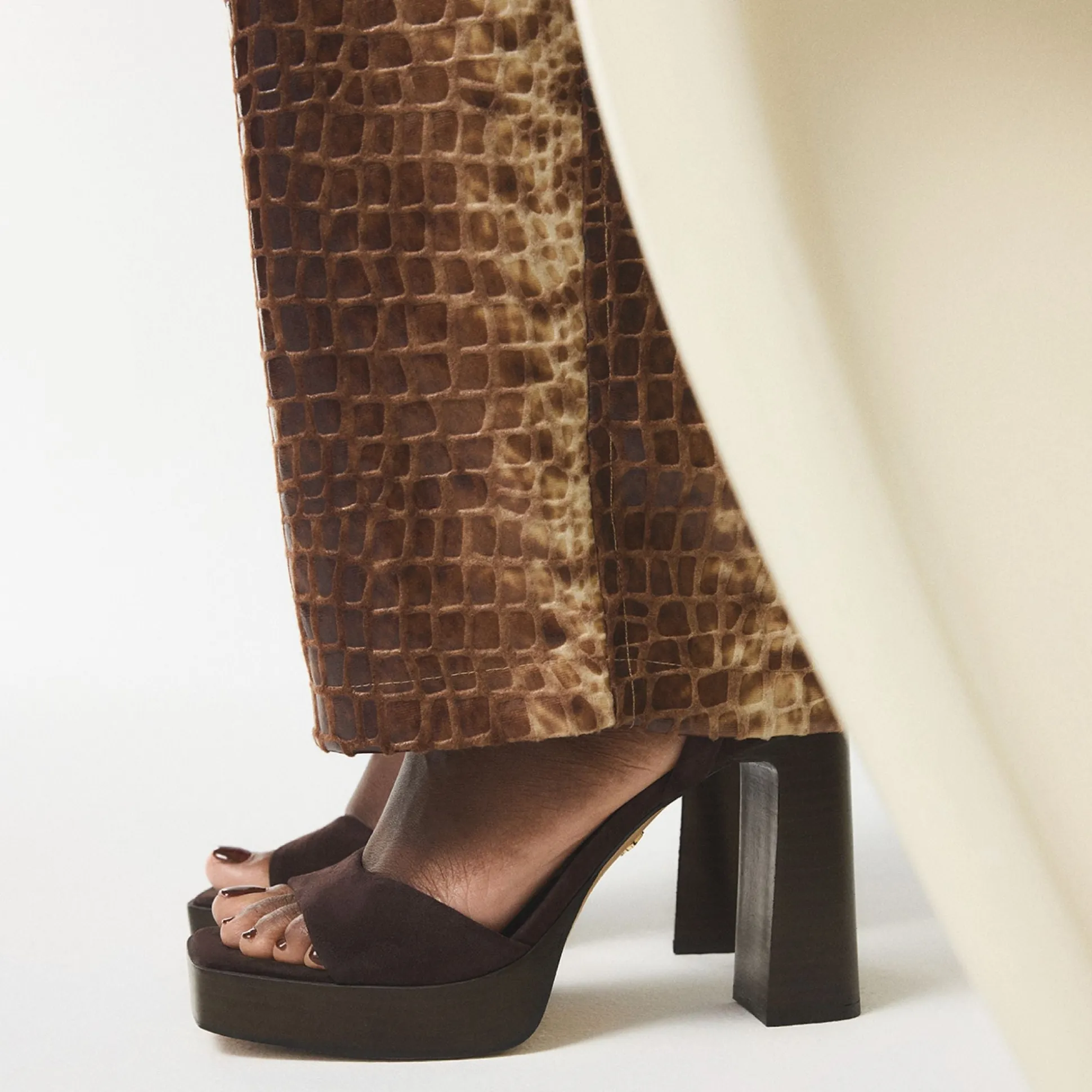 Velvety suede wraps the foot in dusk-toned calm, while a sky-high block heel and cushy platform stretch every stride, offering dance-floor confidence without losing that grounded feeling all night long. Pair with flared denim for rooftop dates, or anchor a satin mini when wedding receptions roll into sing-along finales.
