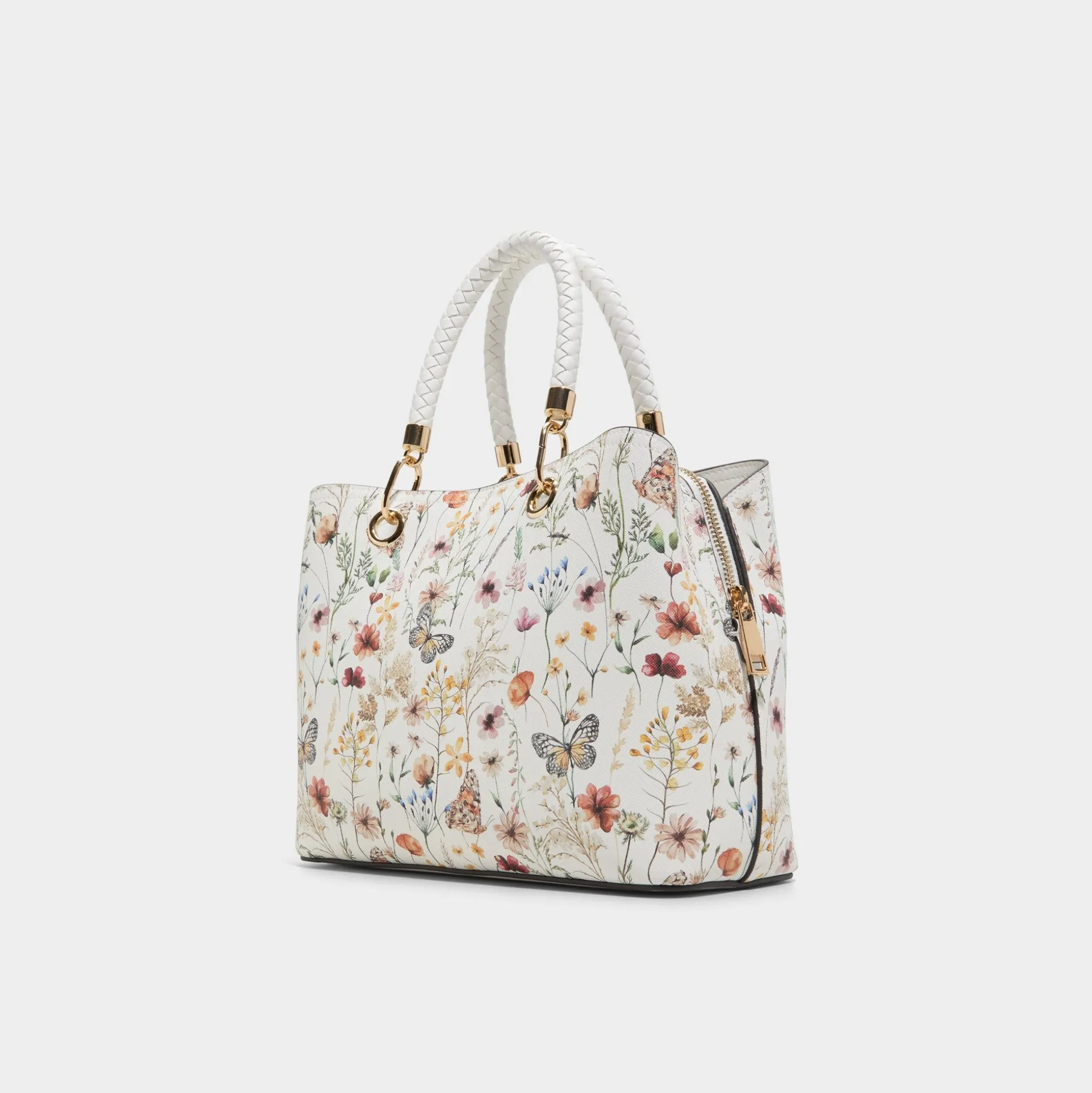 Wildflower illustrations crown this structured tote, where woven handles meet gleaming gold key-fob accents for a visually dominant accent that shifts everyday practicality into a statement piece you carry with ease. Carry it with a pastel suit for office coffee runs, or sling it over a sundress for weekend market strolls, letting the floral print finish the look.