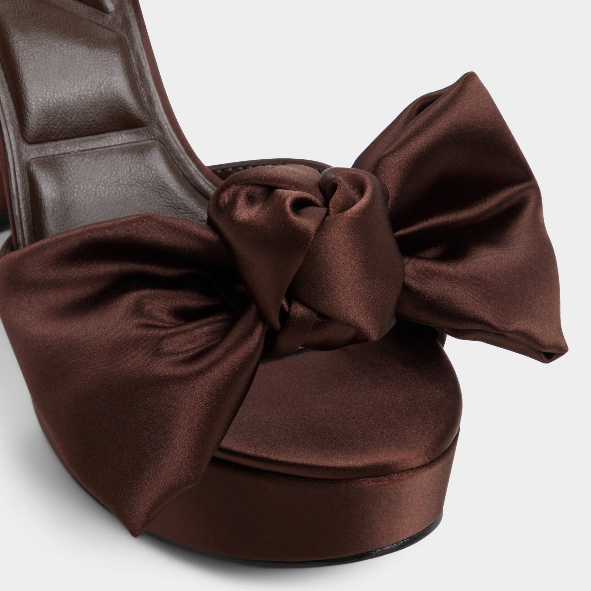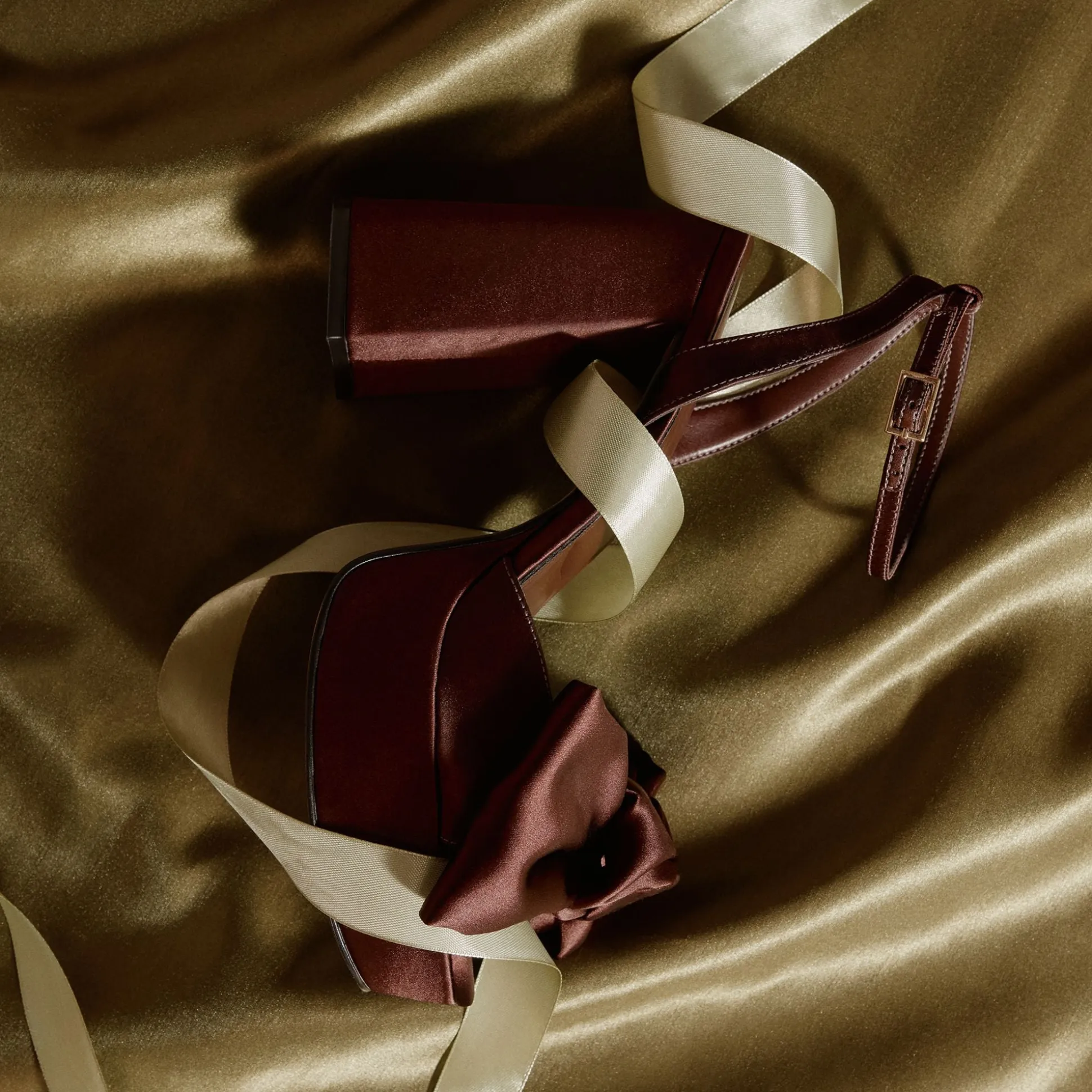 Glossy satin drapes over towering platforms, while dramatic bows crown the vamp, giving a statement silhouette that gleams on every step and makes city nights feel like a catwalk you can actually own. Pair with a sleek tuxedo-inspired suit for black-tie nights, or ground a floaty dress with these for garden-party glamour.