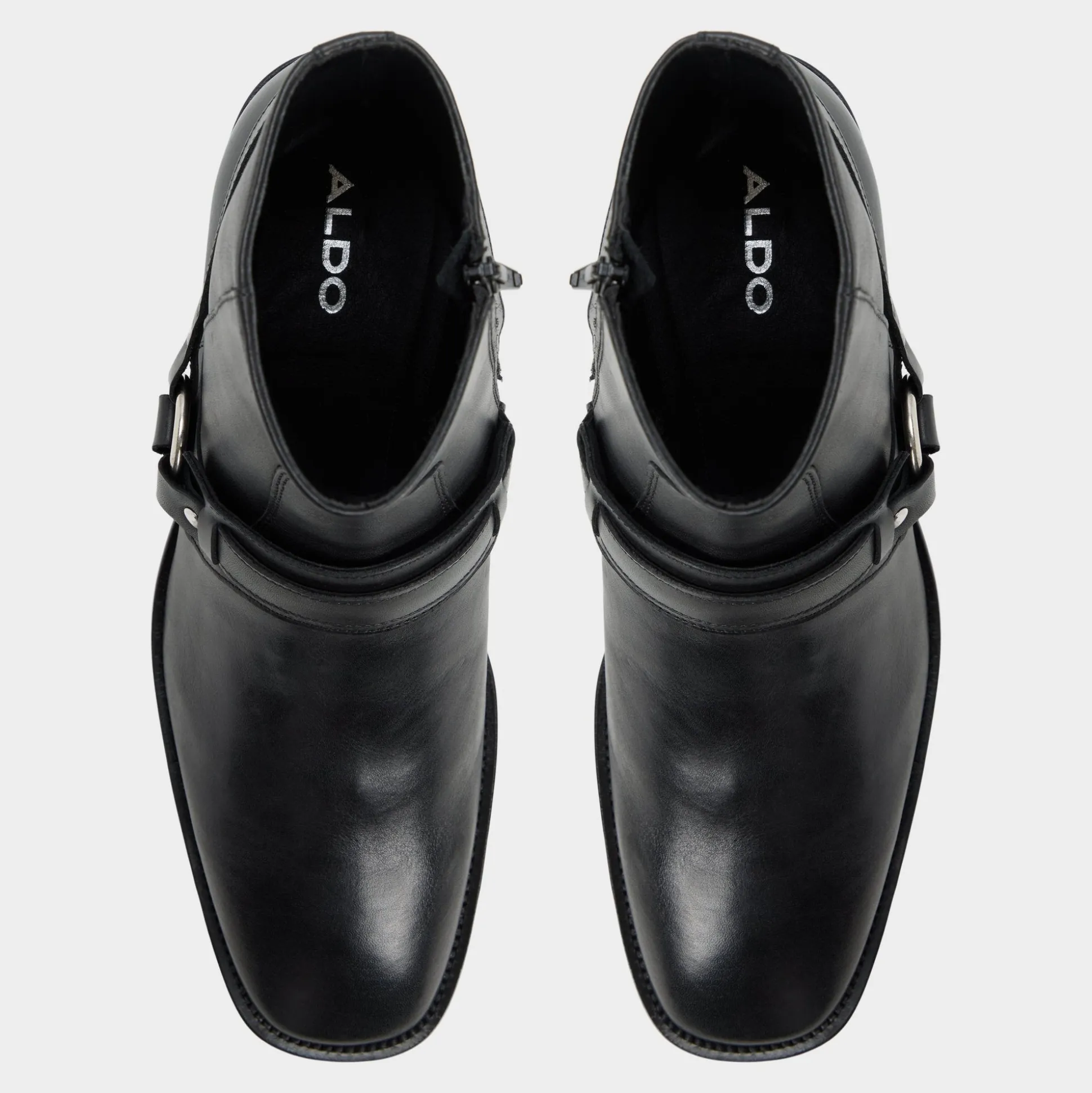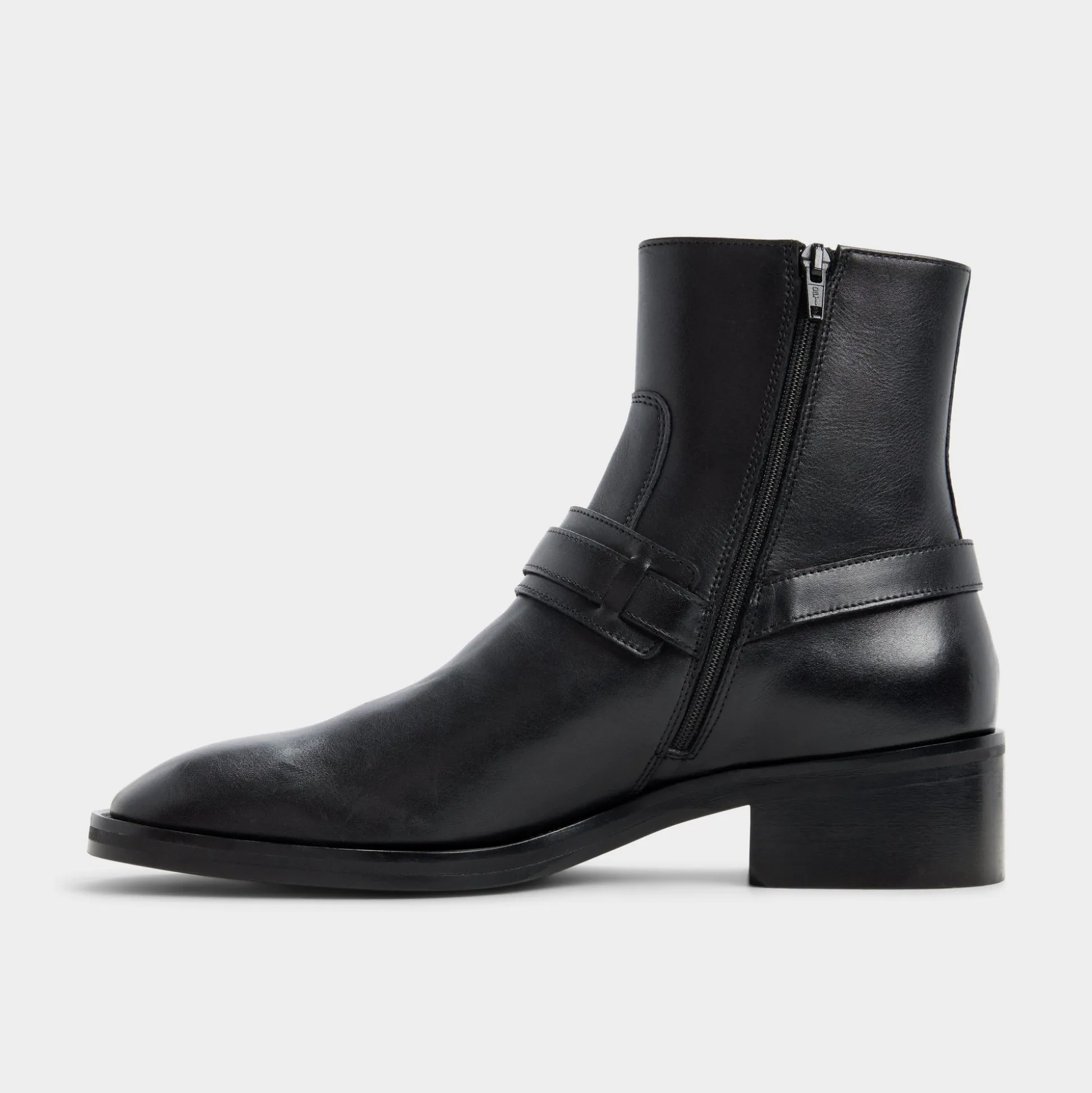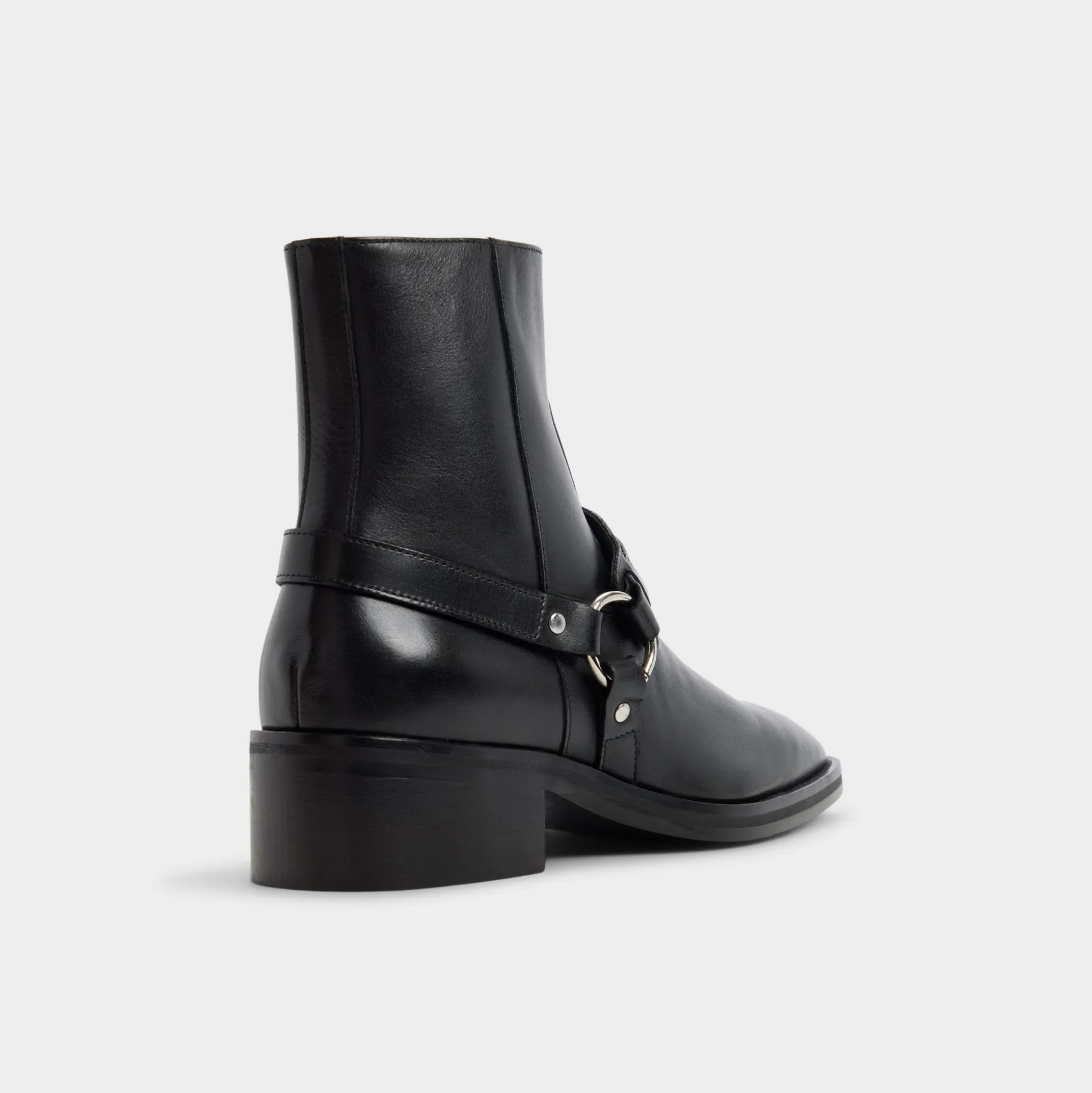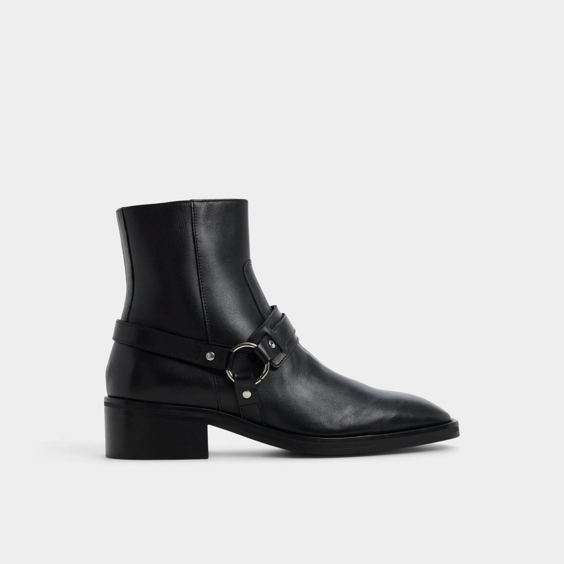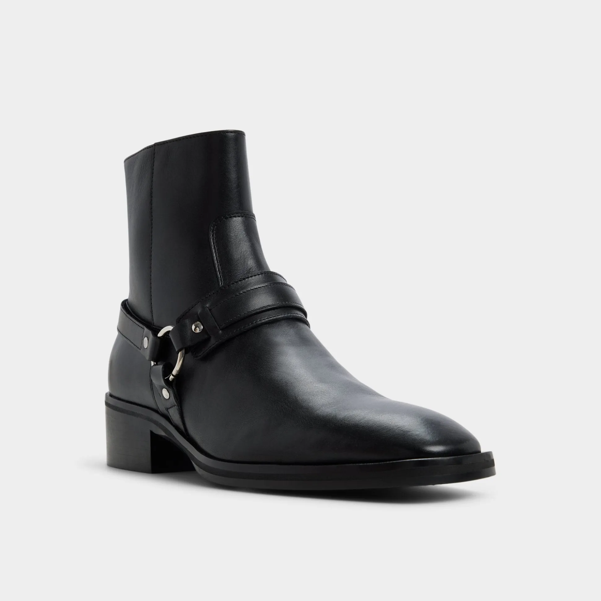 Black leather rides high on attitude thanks to a harness-style strap cinched by a ring, while side zip and block heel keep the ankle boot easy on the go. Anchor slim black denim for gigs or sharpen a charcoal suit at work-its confident edge never blinks.