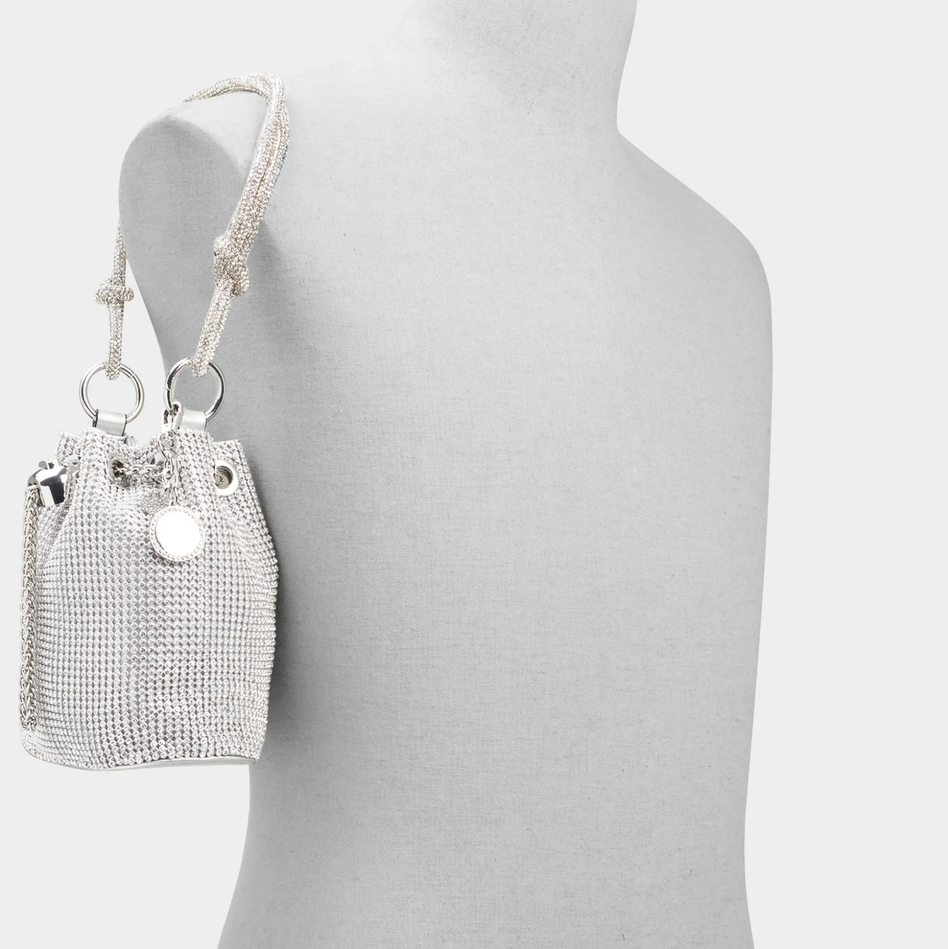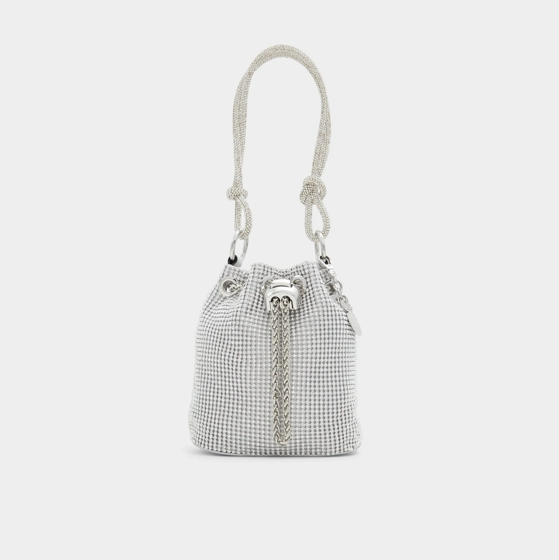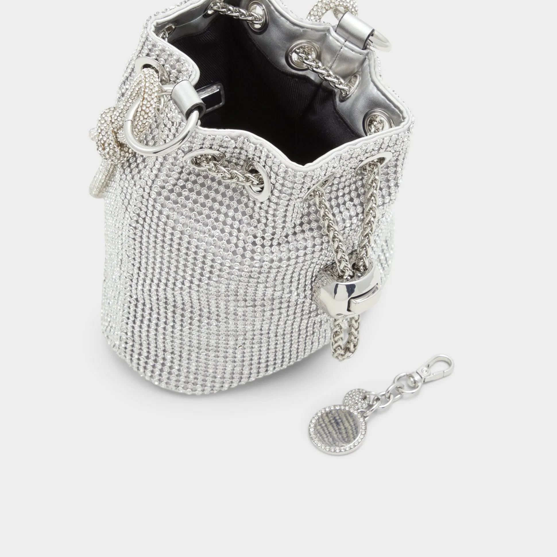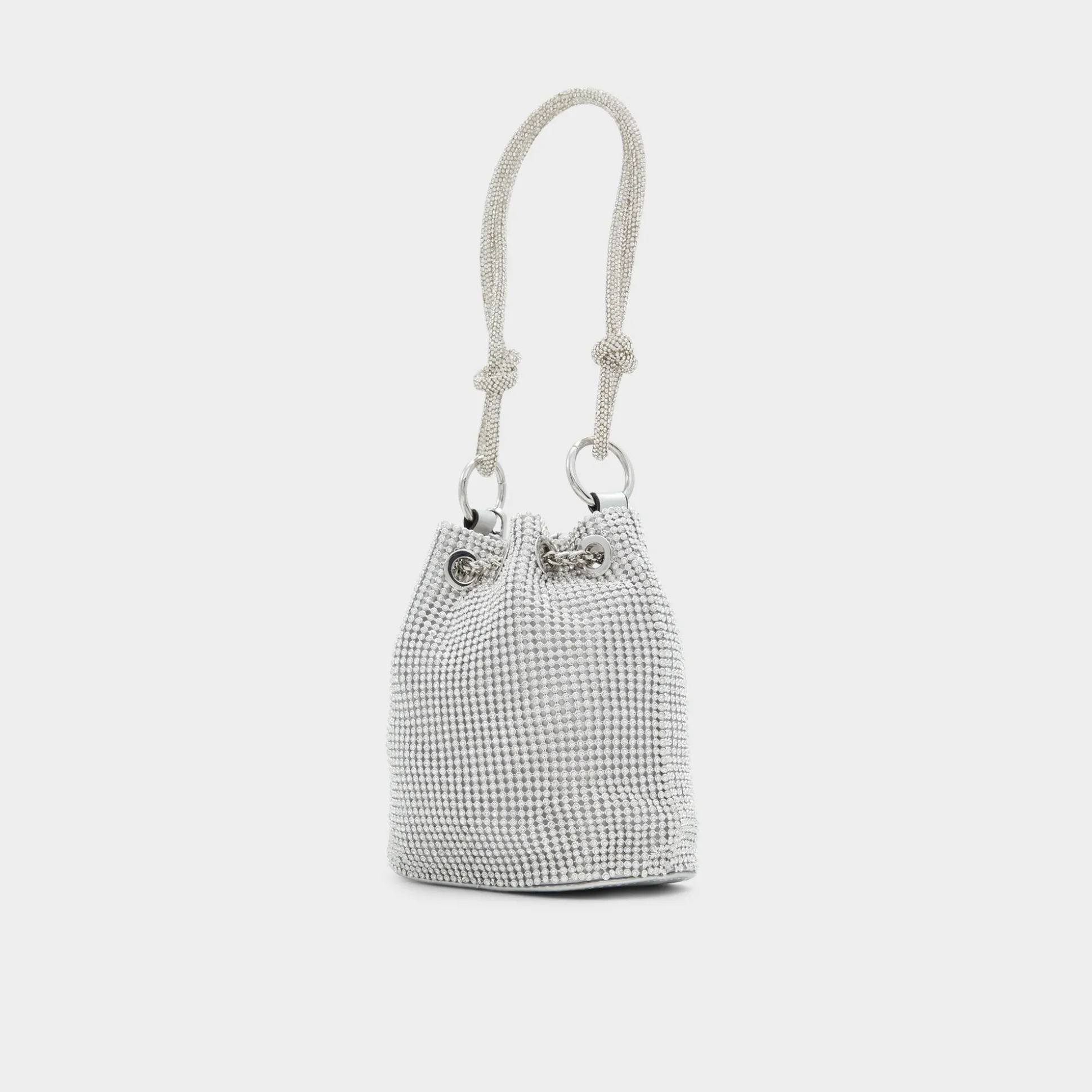 Marvel at this beautiful, rhinestone encrusted bucket bag designed to shine bright.