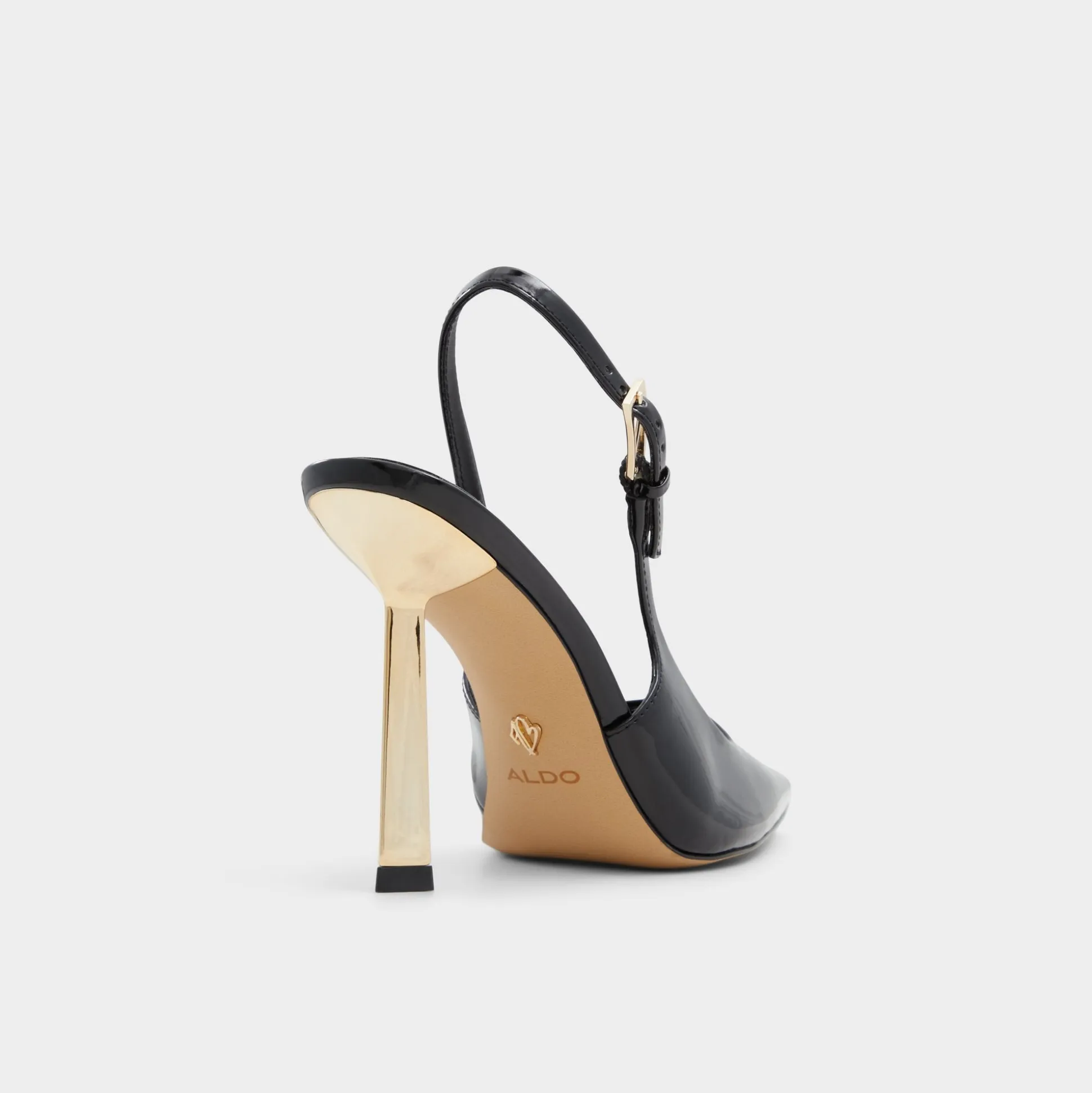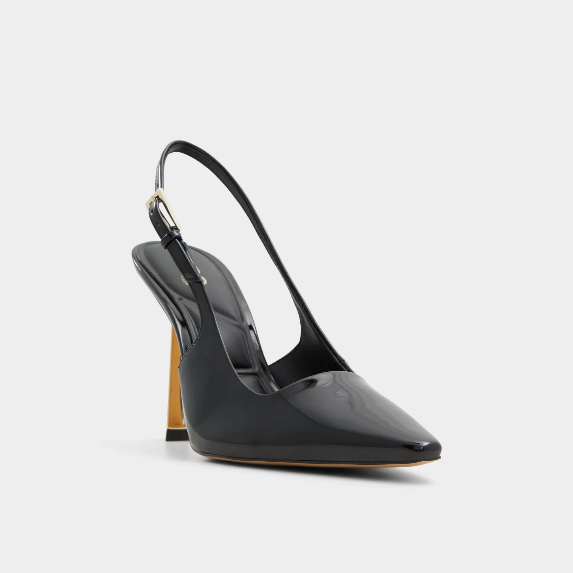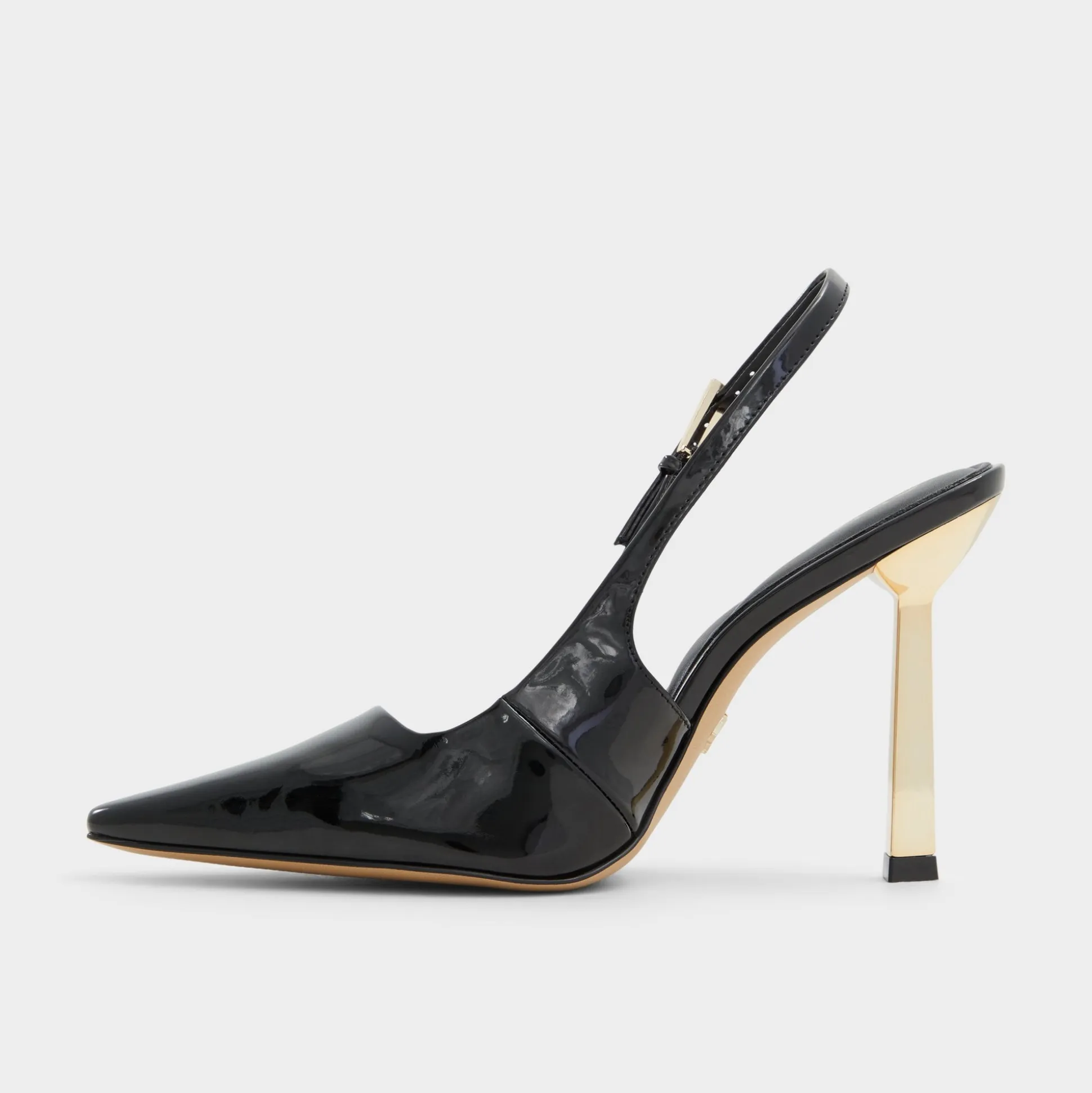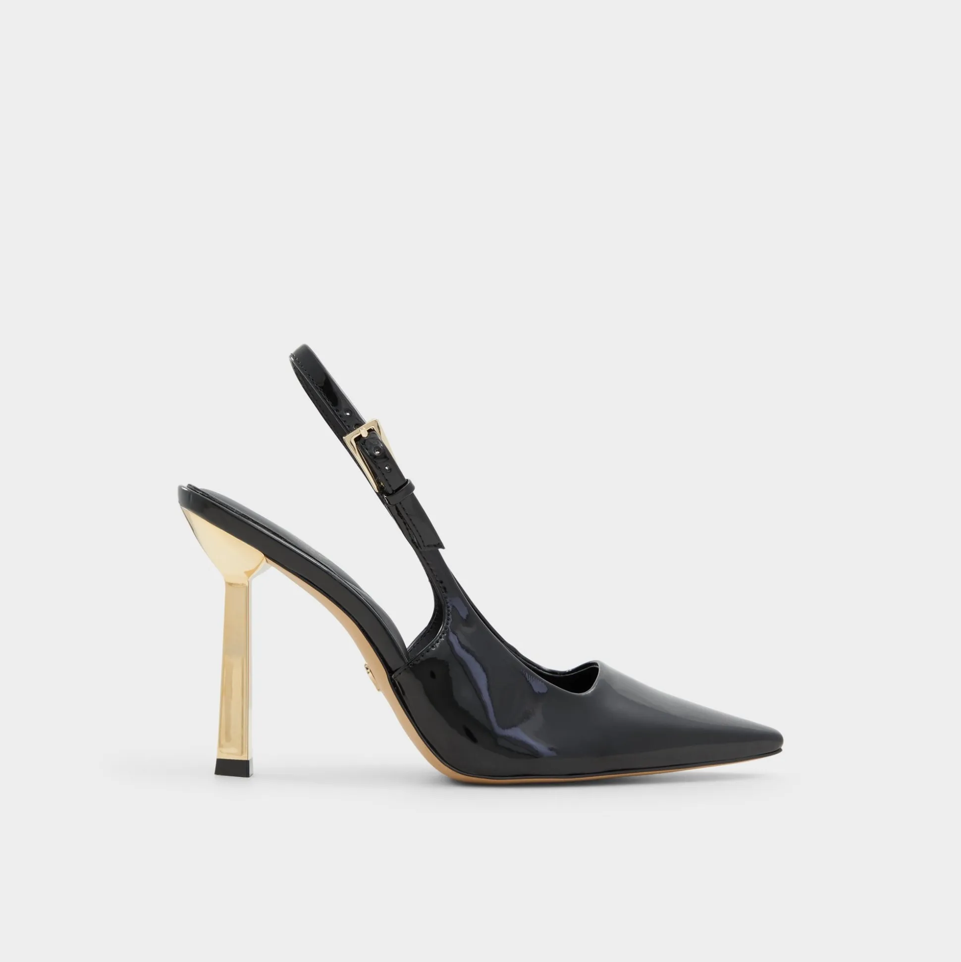 Liquid-black patent wraps a bold after-dark silhouette, where sculpted mirror-gold stilettos catch light and promise instant confidence as you glide from lobby tiles to late-night taxis through neon nights and crowded streets. Pair with sleek trousers for gallery openings, or swap in a satin midi for rooftop cocktails and city-date nights.