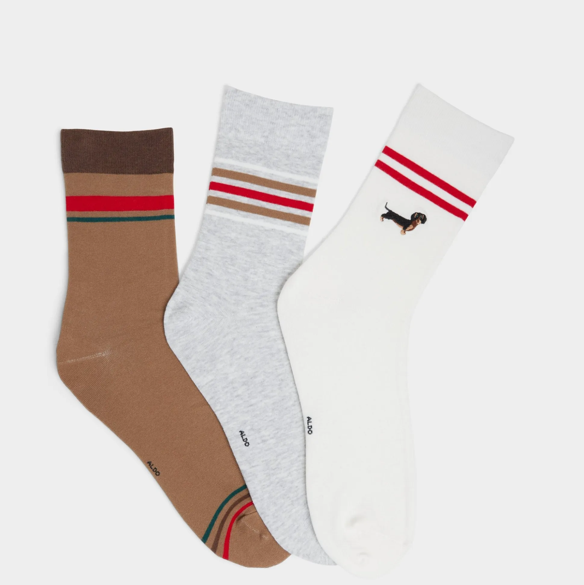 Dachshund embroidery peeks from cotton sock cuffs, a playful stripe-taped detail that adds character to everyday basics and begs a second glance during coffee runs and city strolls. Layer them with cropped cardigans and sneakers for casual cool, or cinch a midi skirt and loafers for weekday polish.