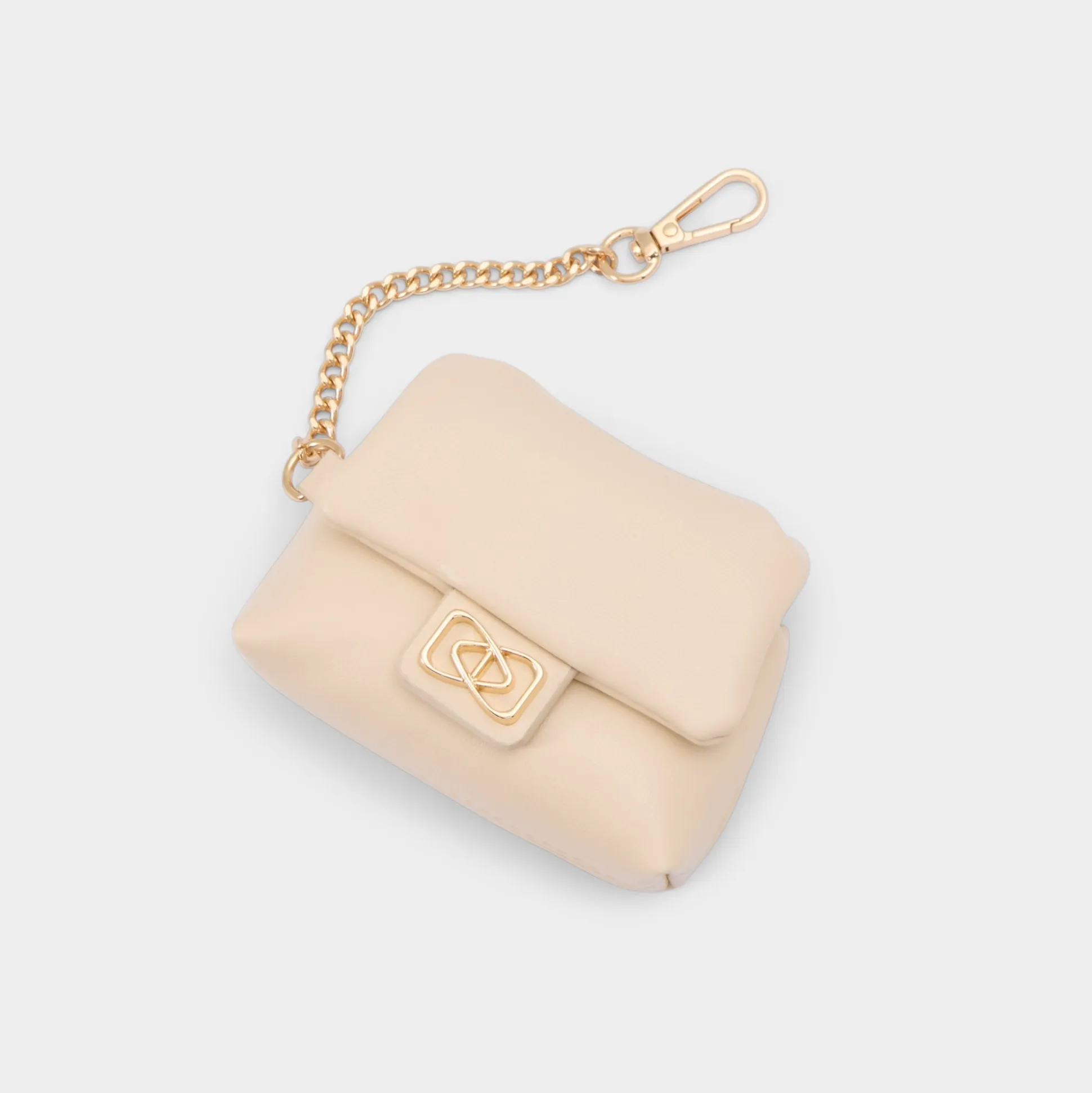 Pocket-sized pillow-soft micro bag feels plush in creamy leather, with gleaming turn-lock hardware and a clip-on gold chain that lets it slip from handheld to crossbody in a heartbeat. Carry it tucked under a blazer on quick coffee runs, or sling it over a sun-dress for sunset parties, letting the soft silhouette seal every effortless, city-ready moment.