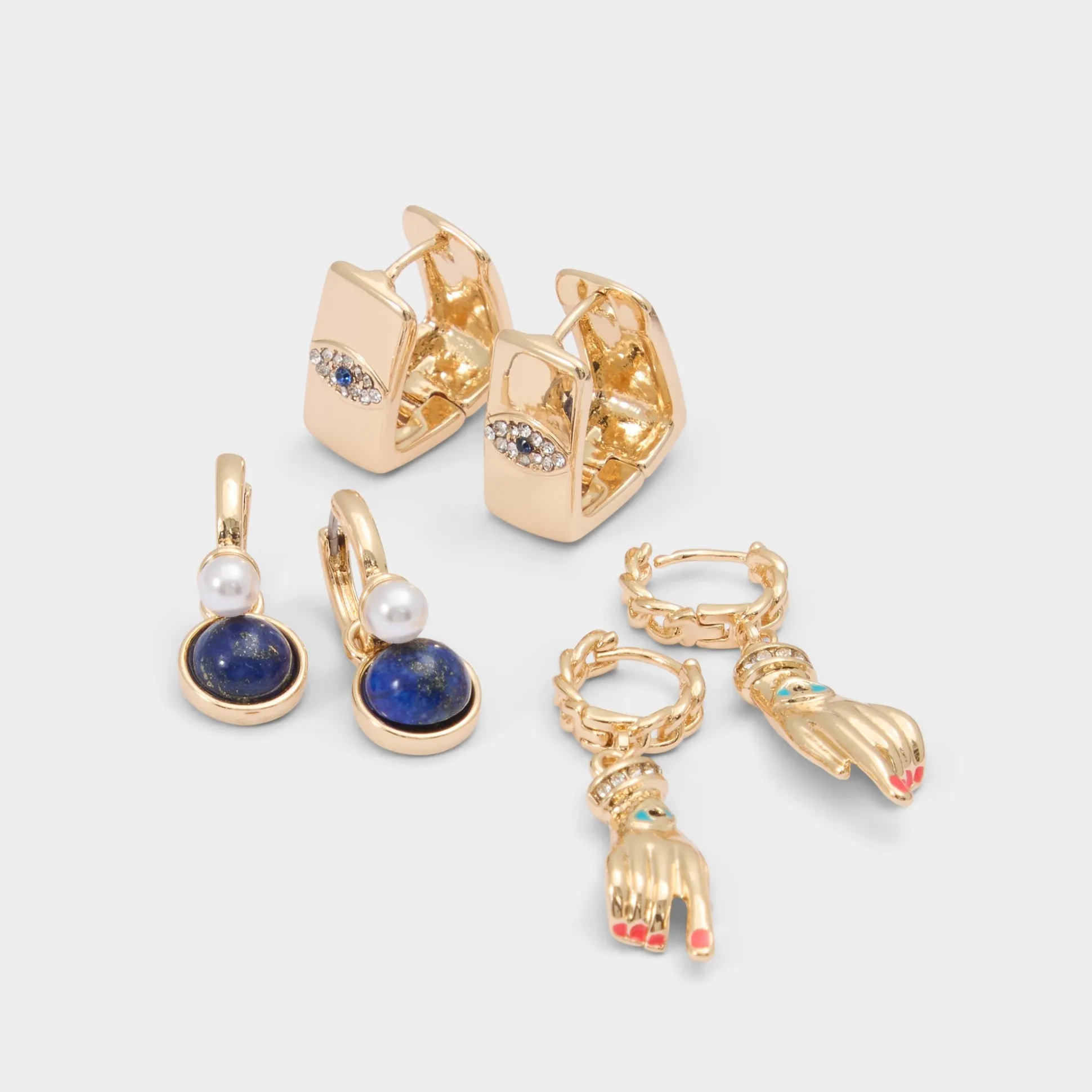 Evil-eye huggies meet pearl-topped lapis drops in a sculpted earring trio, turning the ear into a talisman you can wear from sunrise to late-night. Layer them with a blazer for cocktails, or let the pearls glow under a knit at coffee catch-ups.