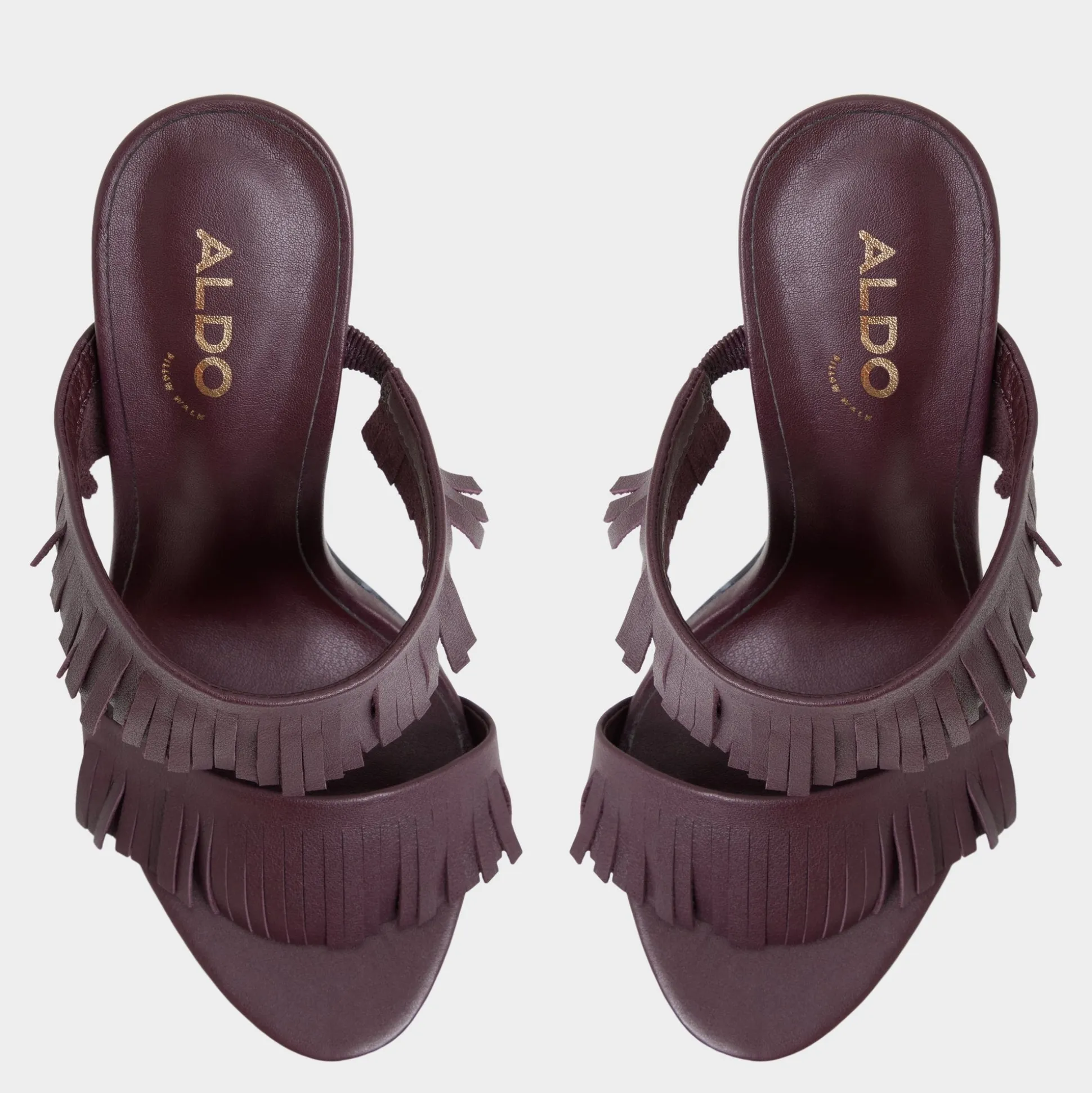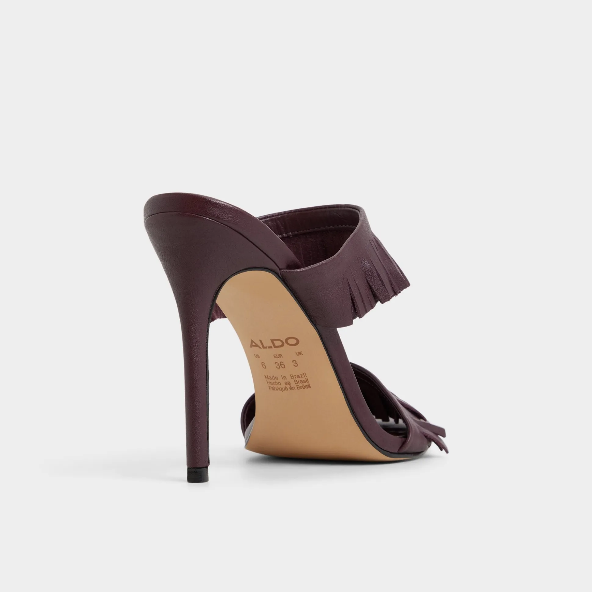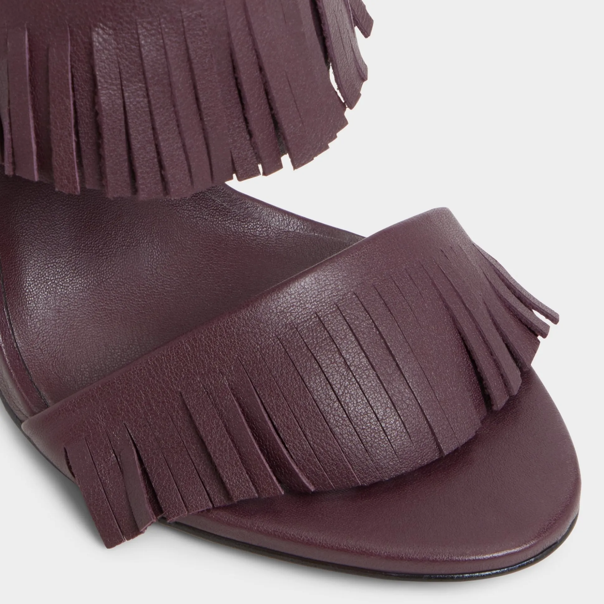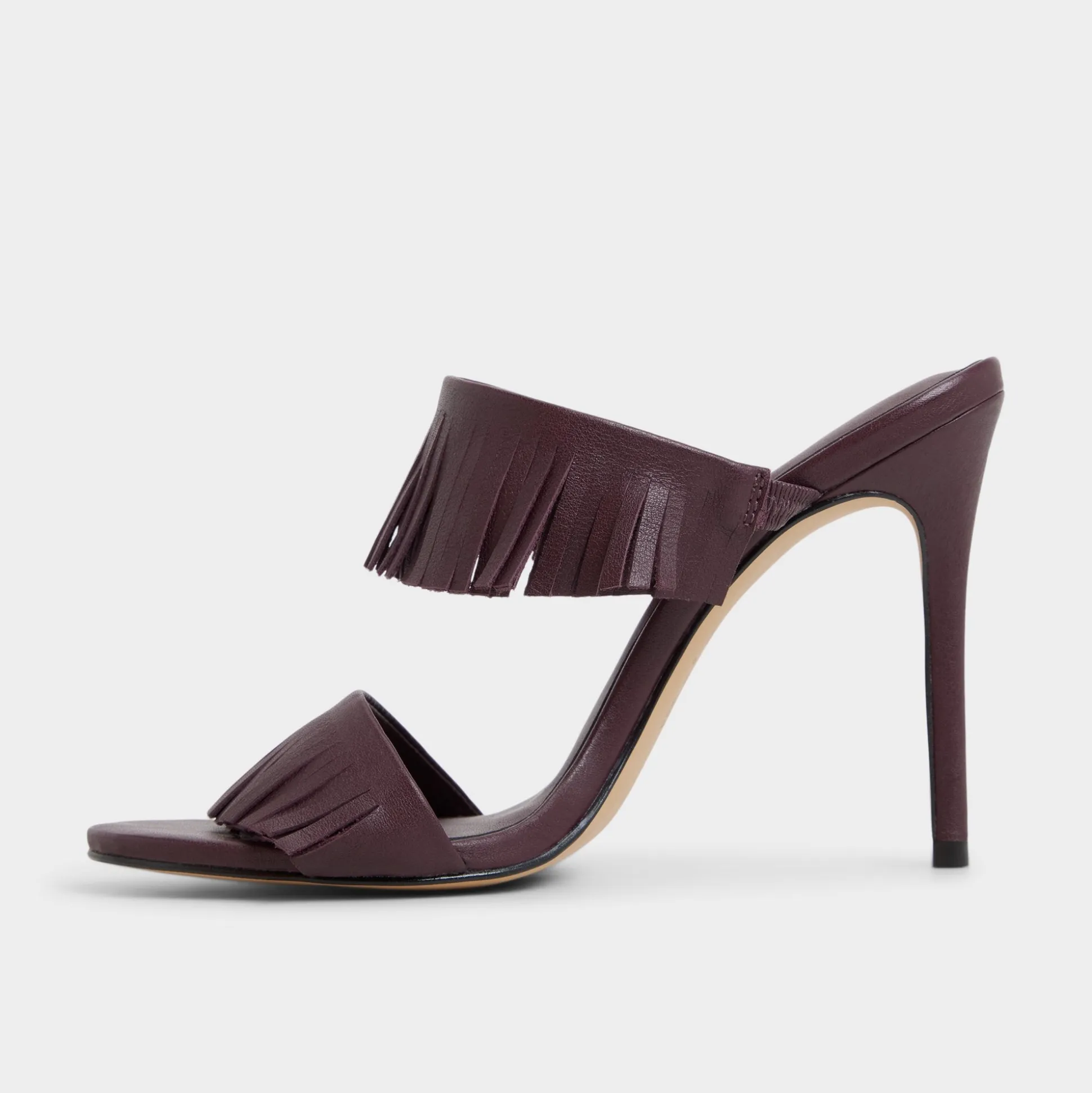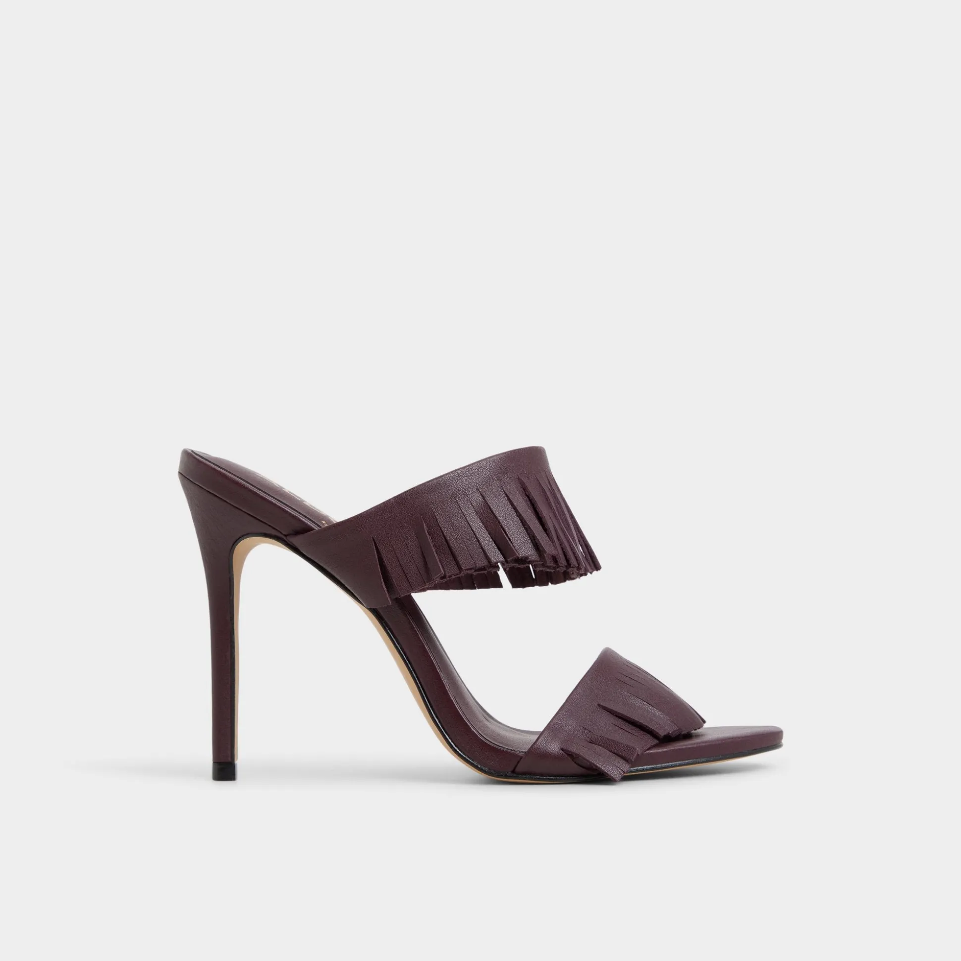 Fringe sways along twin straps in burgundy, a stiletto mule with a slender pointy toe and a supple footbed that lets you glide from after-hours galas to gallery openings and city strolls. Pair with tailored pants for pitch days, or slip under a sleek dress for cocktails.
