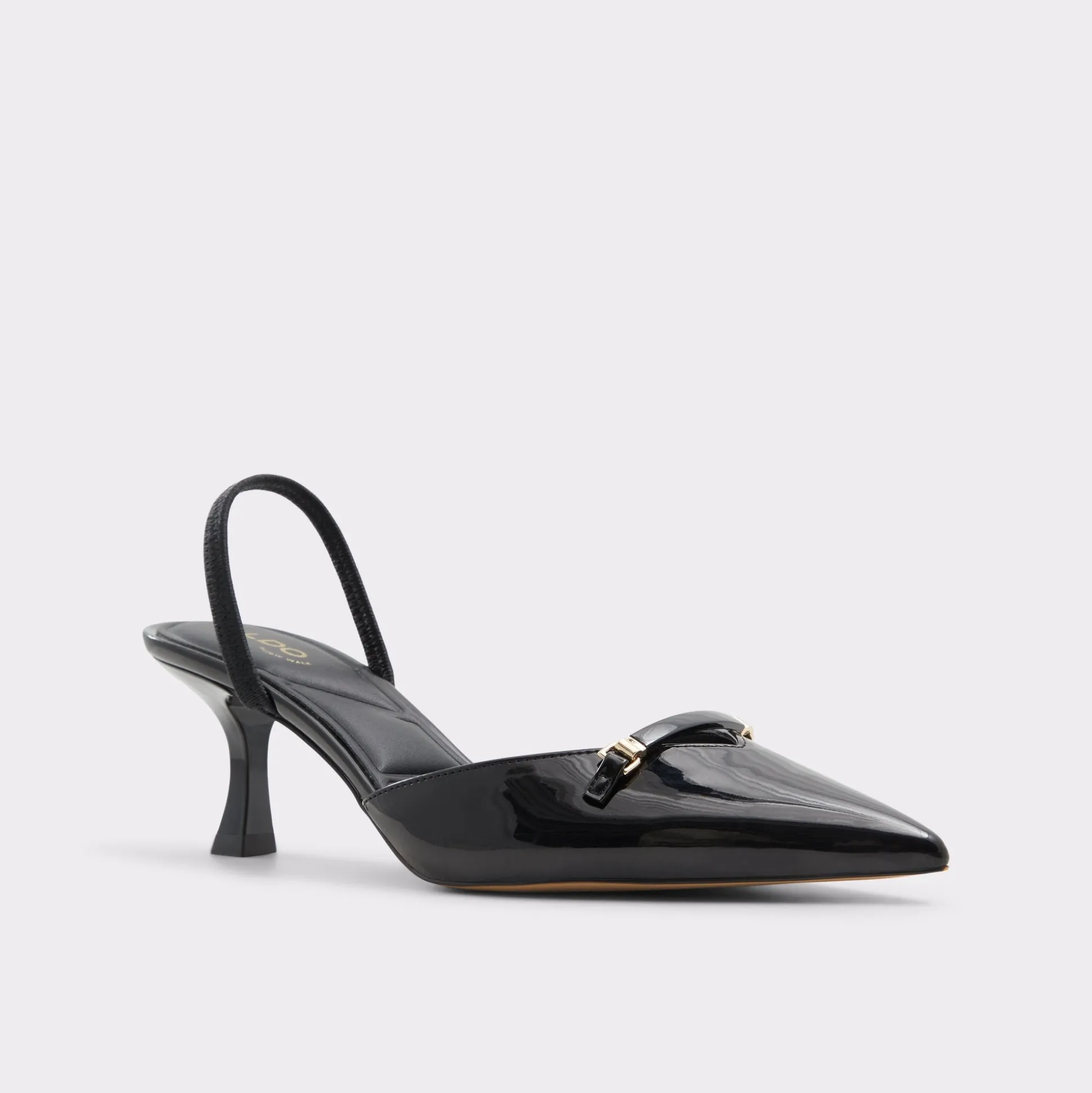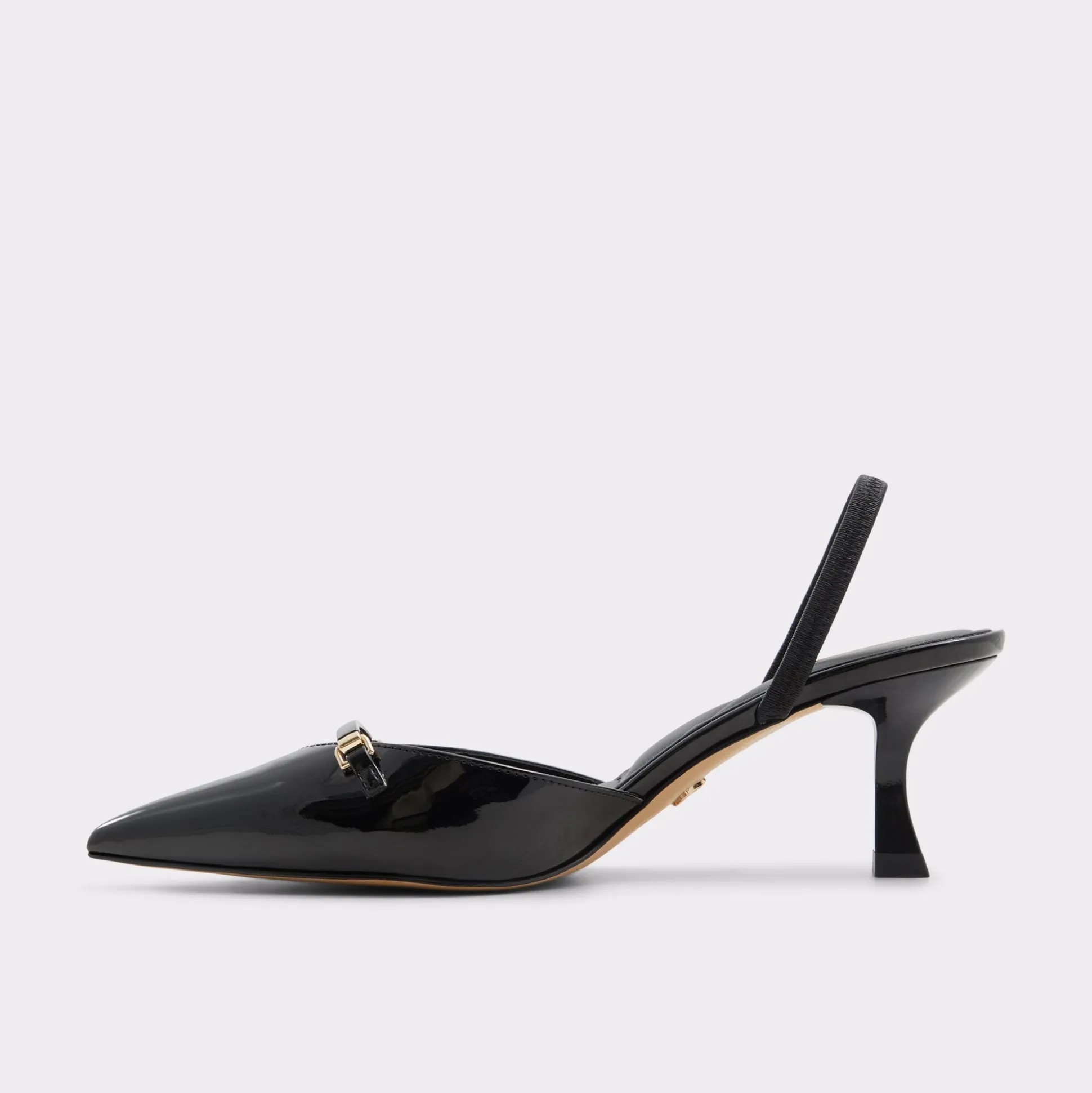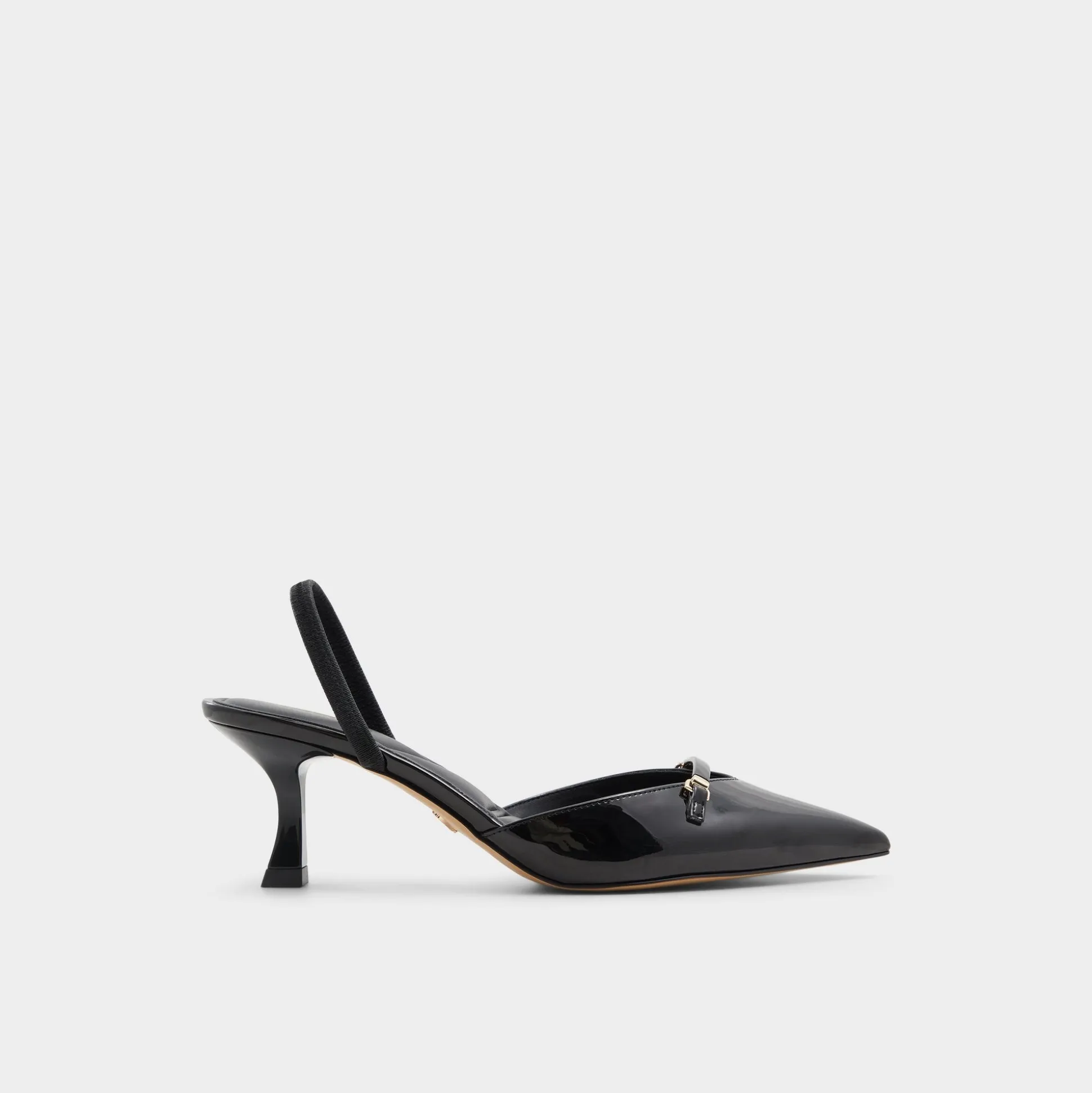 Midnight-gloss patent leather forms a sharp point on a poised kitten heel, with a metal charm bridging the vamp for film-noir confidence and a smooth leather lining that cushions every stride. Pair with tailored joggers for after-hours city nights, or slip on with a sleek jumpsuit when rooftop gatherings glow under starlight.