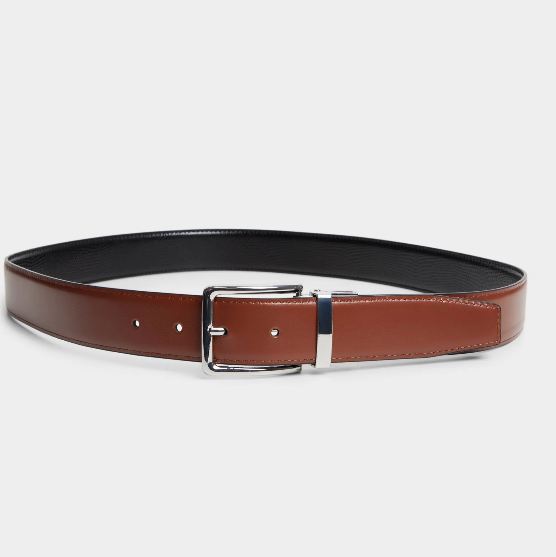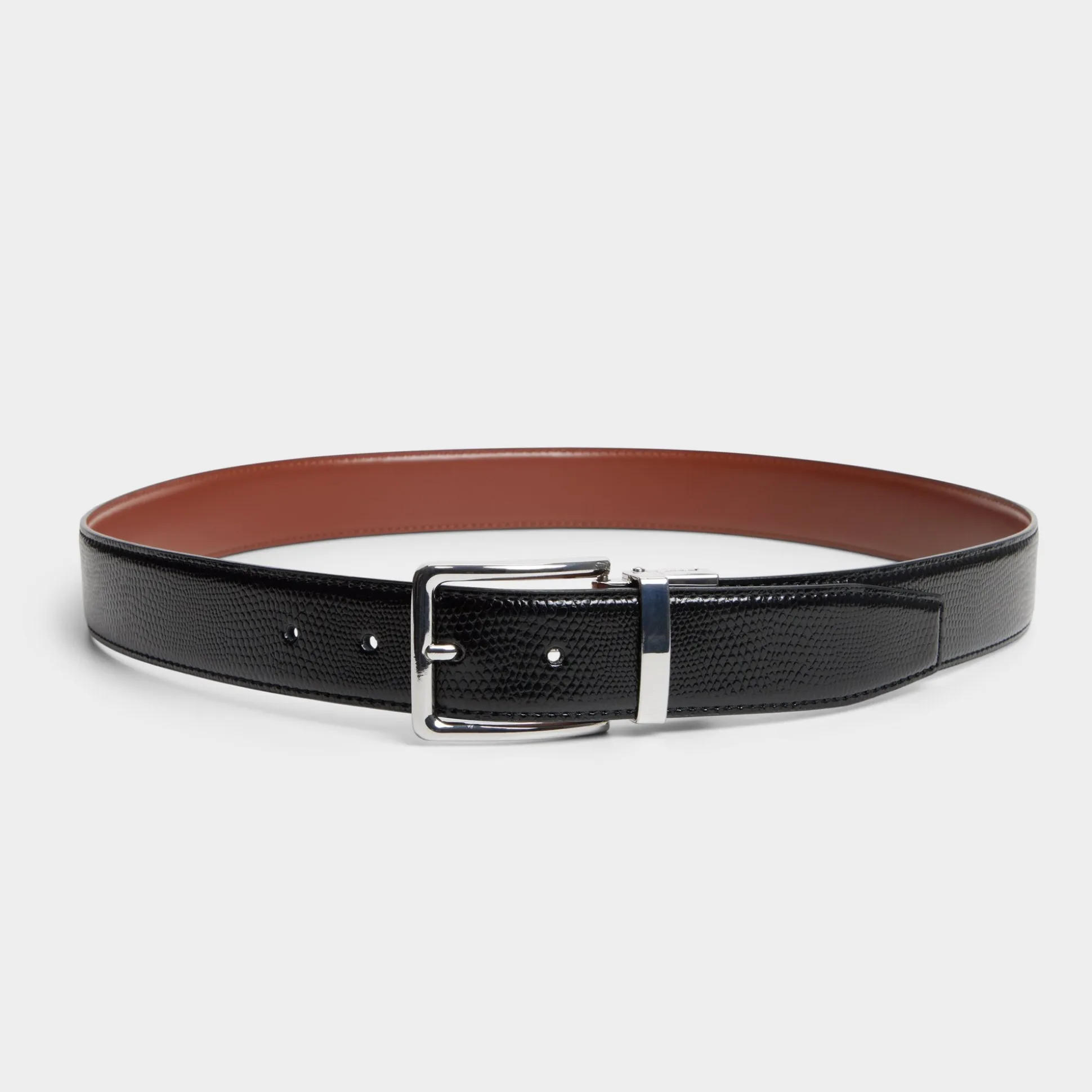 Lizard-embossed leather shines with a subtle gloss, and a polished silver buckle keeps the look sleek, offering a luxe finish with quiet confidence. Cinch a tailored blazer for work polish or anchor high-waist jeans at weekend coffee runs, sealing every look with balanced edge.