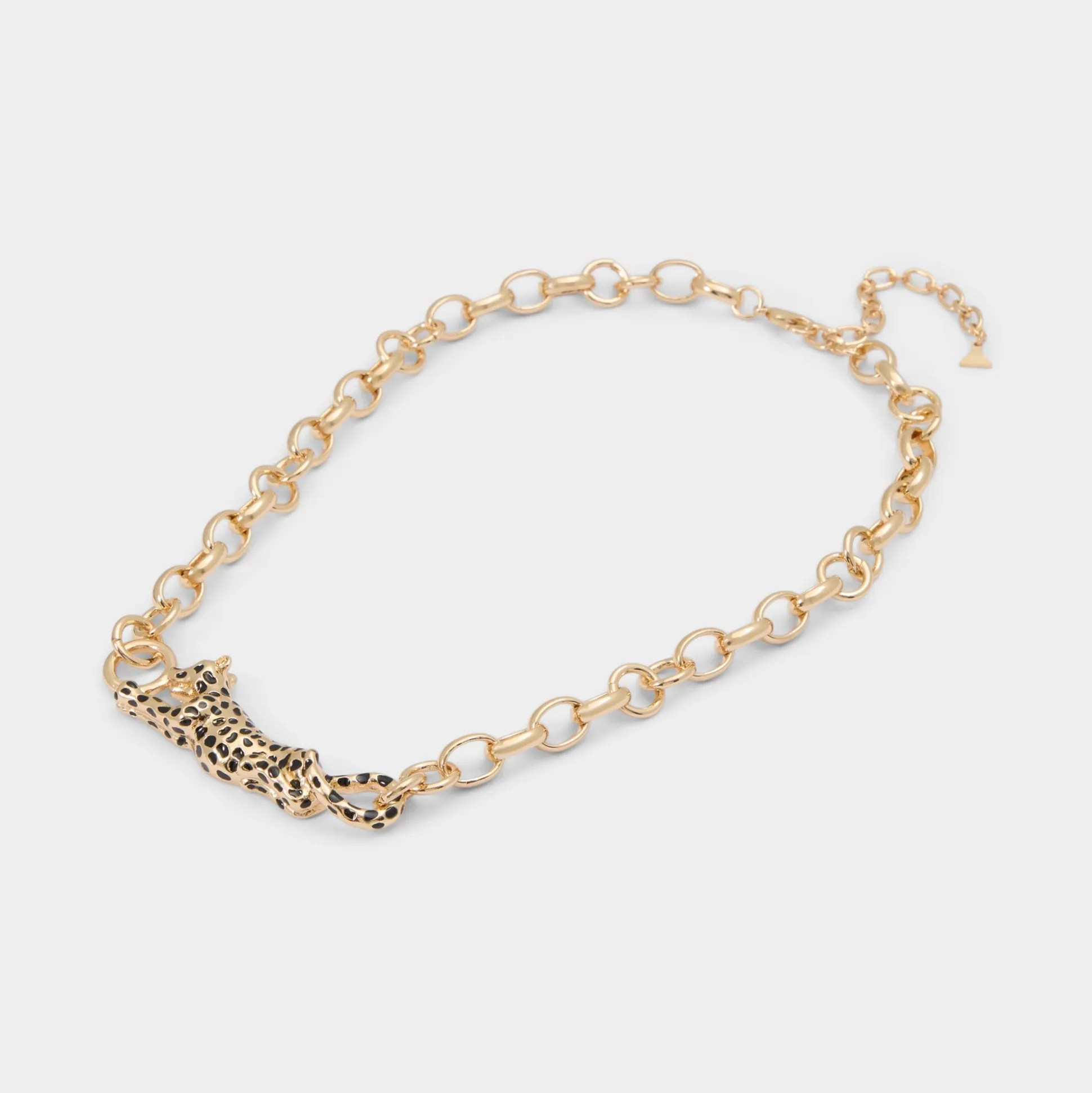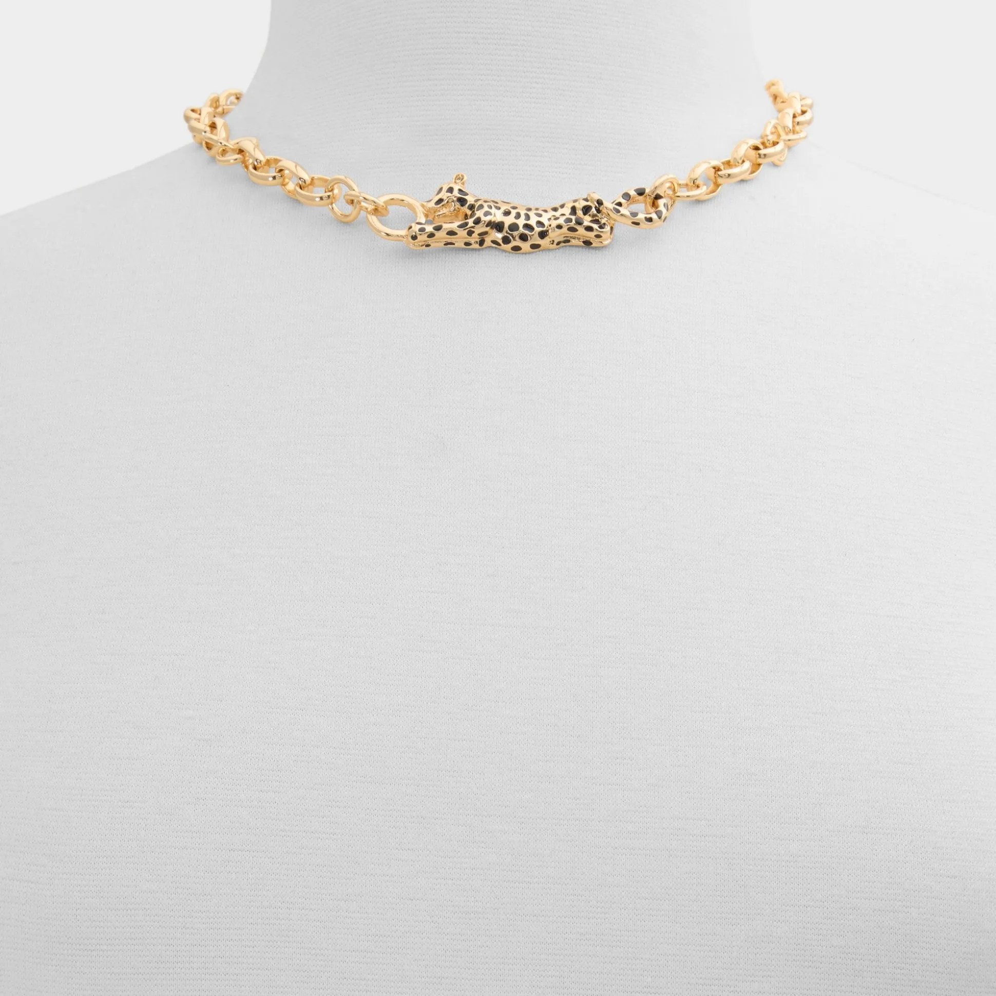 Panther-shaped hardware stretches between bold open links, with sculpted spots and a glossy finish turning this chain necklace into a wearable prowl of confidence that snaps closed with one easy click. Layer it over a satin slip for rooftop cocktails, or frame a graphic tee and blazer on presentation days for subtle edge.
