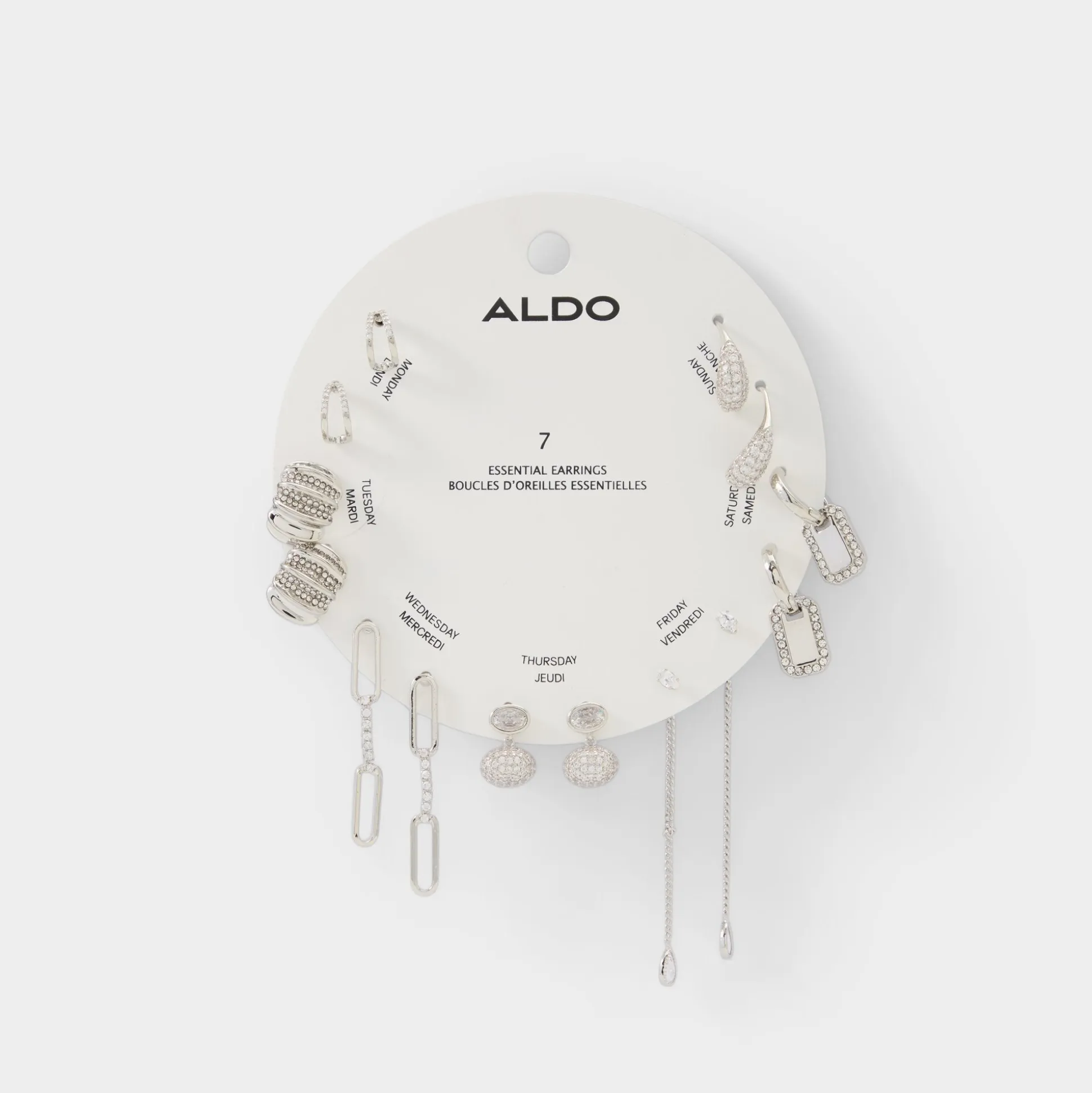 Seven shimmering silhouettes-from pave huggies to shoulder-skimming chain drops-circle this earring set, giving you pre-planned sparkle in one sleek card. Layer Monday studs with a crisp blazer for presentations or swing Saturday drops beside tousled waves and a slip dress for rooftop parties.