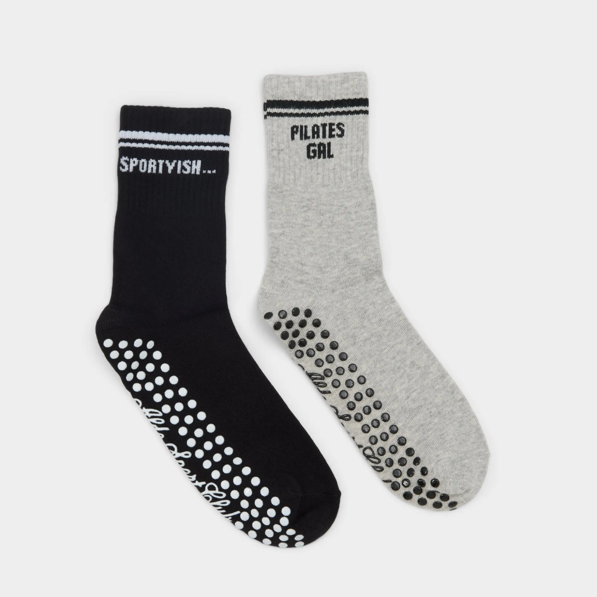 Mismatched cotton crew socks wink with bold slogans—“SPORTYISH” meets “PILATES GAL”—and a polka-dot grip sole that keeps every stride steady from studio sprints to campus errands. Layer them with leggings for gym or coffee runs, or let them peek above sneakers to finish the look.