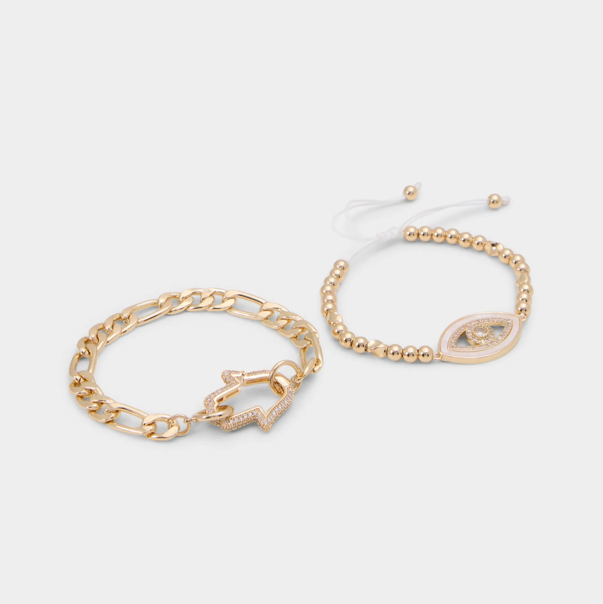 Pave-trimmed evil eye floats on shimmering gold beads beside a chunky link chain with a crystal-studded clasp, giving this bracelet set instant good-vibes energy and built-in layering ease. Stack them with a satin slip at rooftop dinners or split the duo-chain for work blazers, beads for festival tees-for effortless finishing touches.