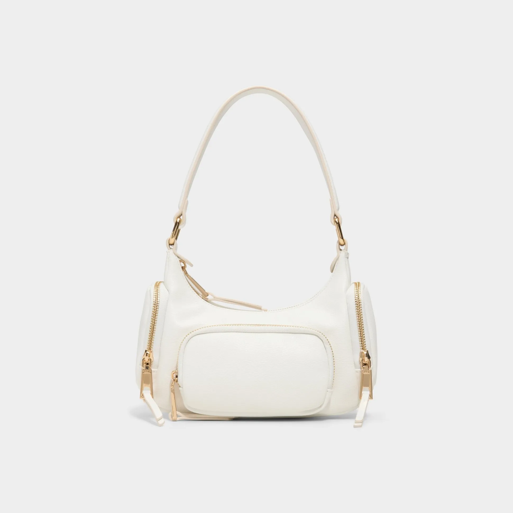 Soft white leather meets liquid-gold hardware in a curved hobo silhouette, with three exposed zippers and a front pouch plus twin side pockets that help sort cards, earbuds, and small essentials without digging. Carry it with a linen blazer for Monday meetings, or sling it with biker shorts for weekend coffee runs.