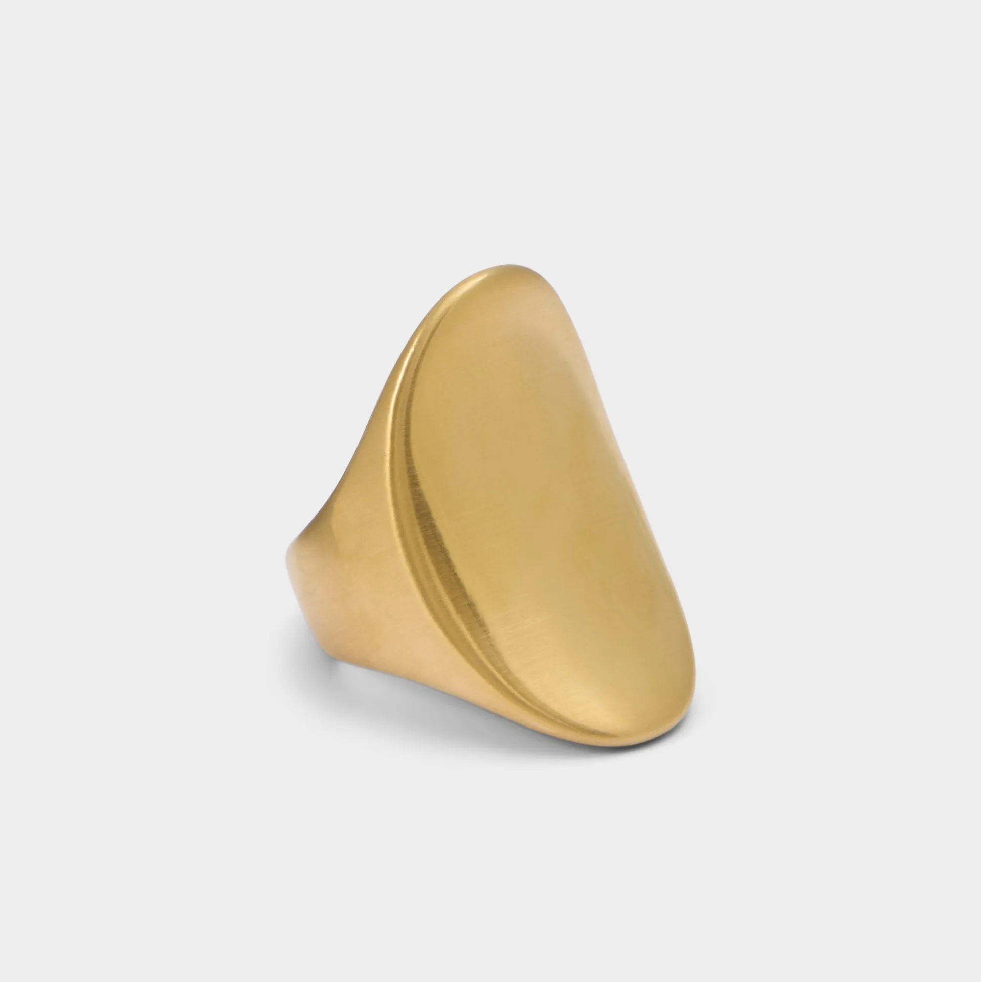 A mirror-smooth dome rises from an asymmetric band, creating an uninterrupted curve that captures the eye. Stack it with rings for errands, wear it solo with slips at gallery openings, and mirror the look with a chain or bracelet as the day shifts to evening.
