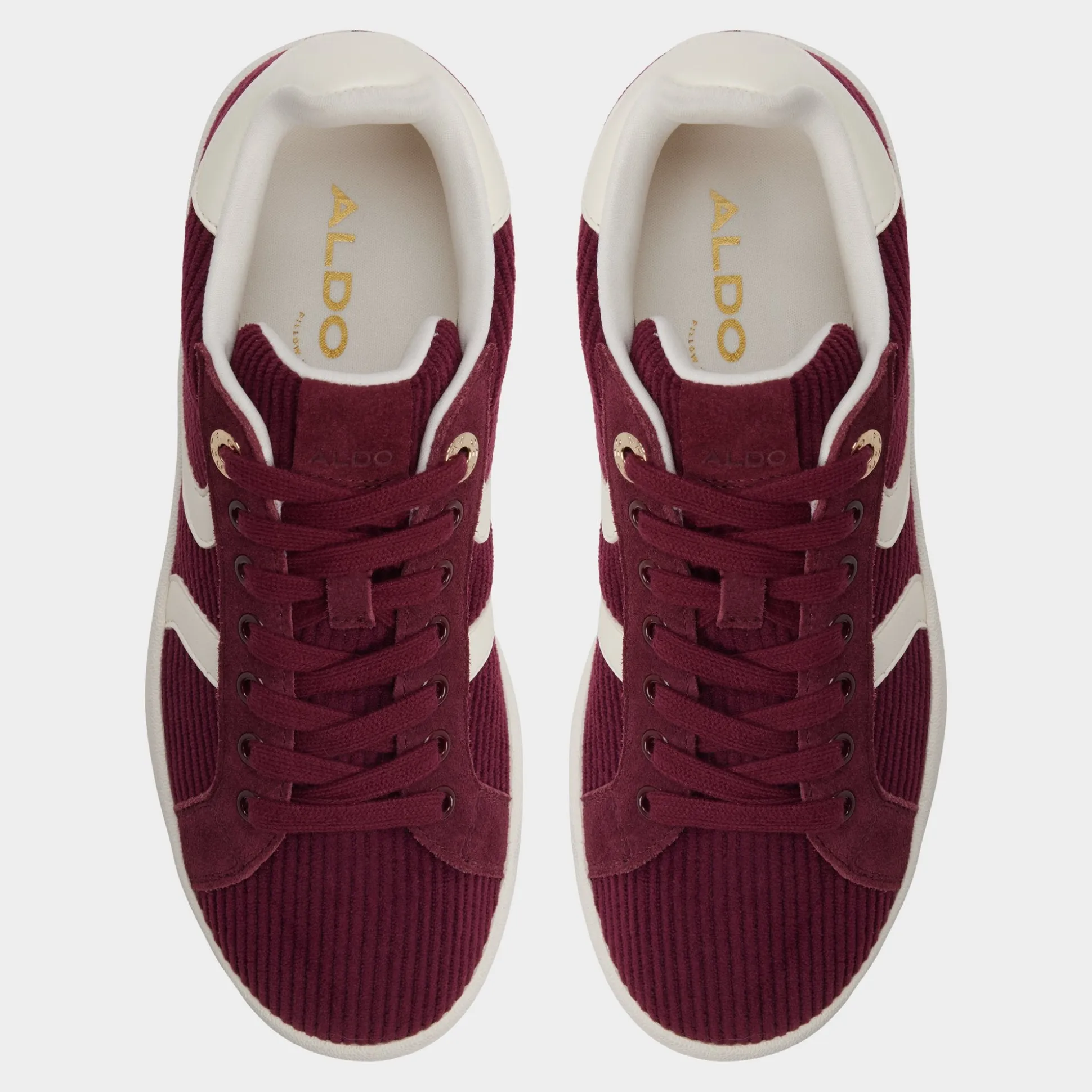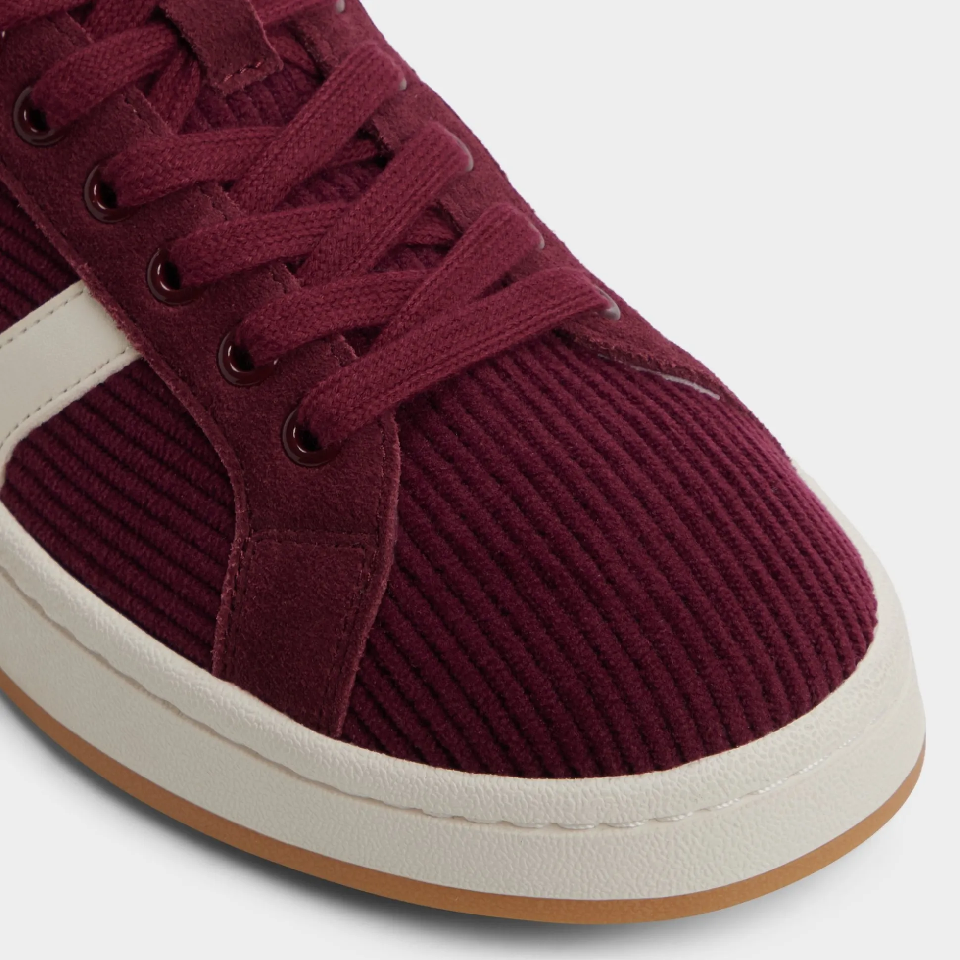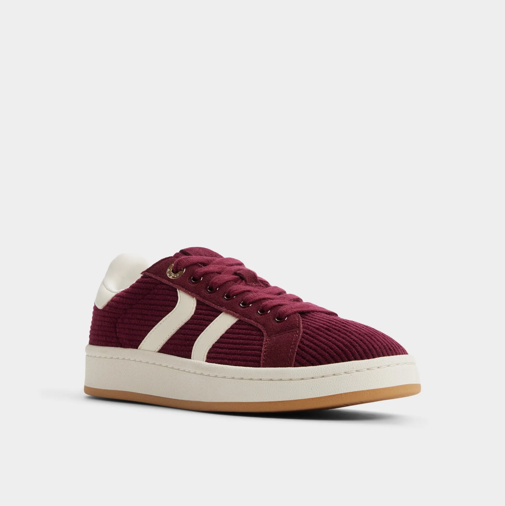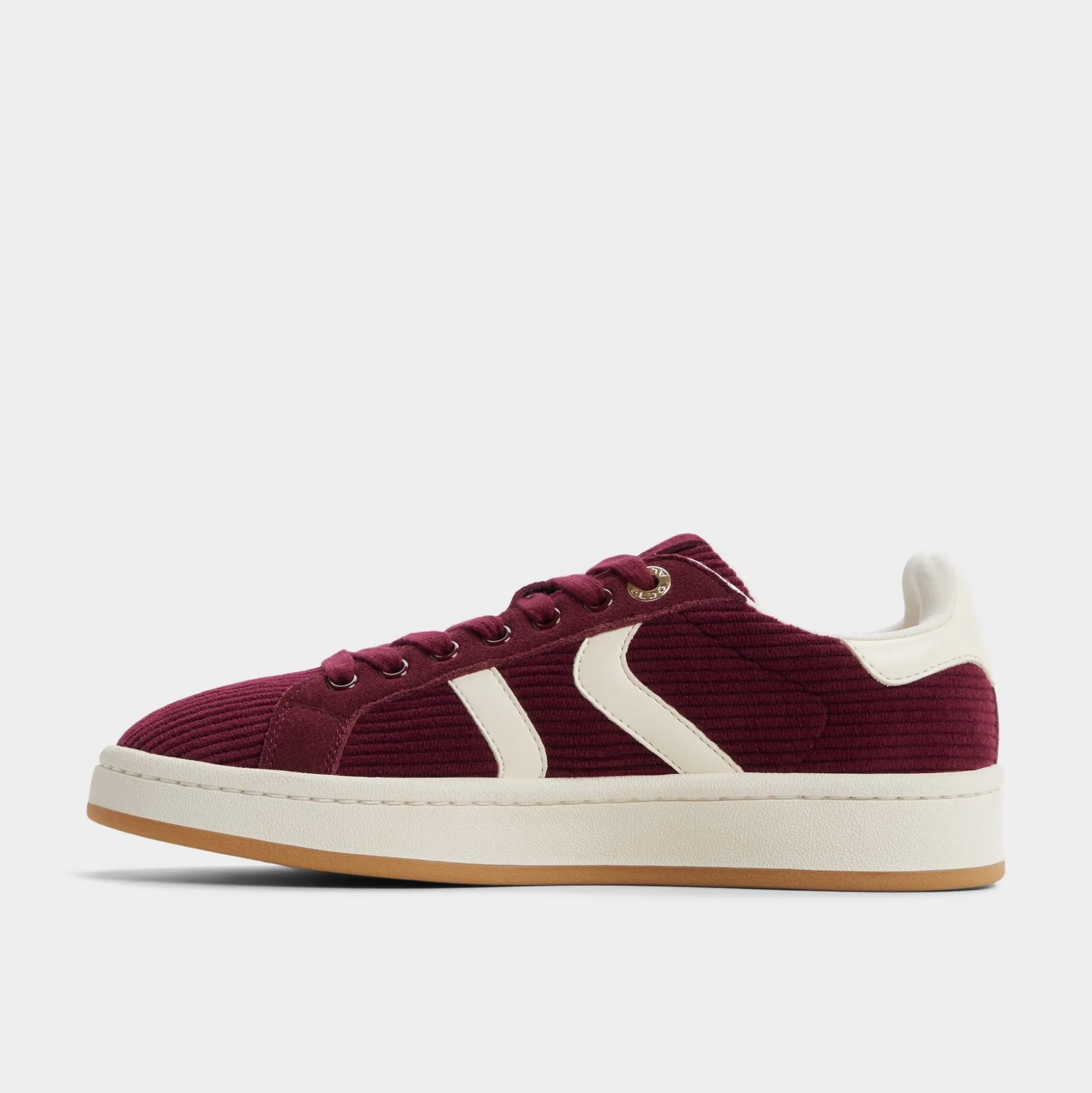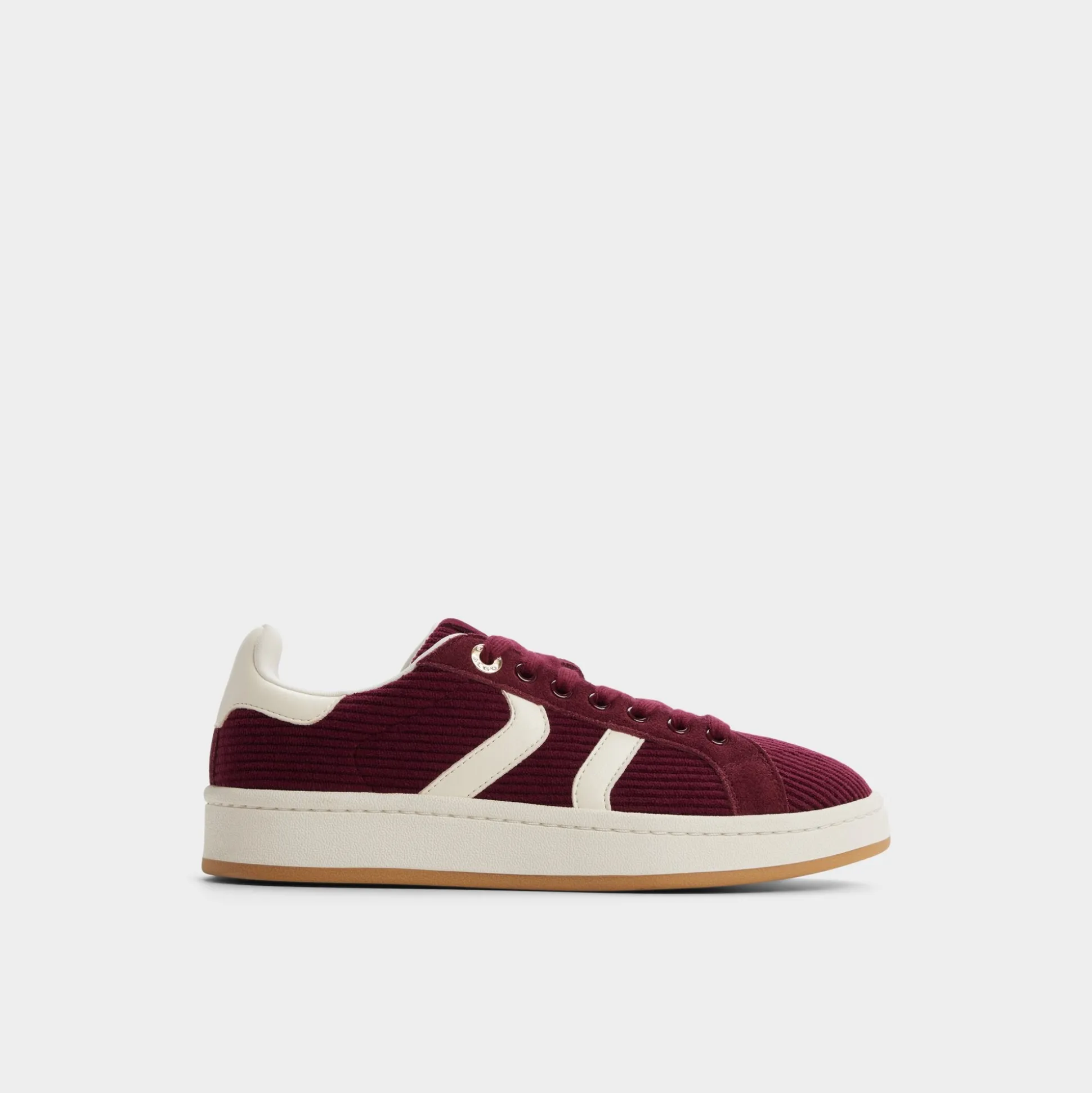 Rich corduroy in deep merlot wraps this retro sneaker, while creamy chevron stripes and soft padding make campus dashes or coffee detours cushioned flexes. Pair with ripped jeans for record-shop wandering, or swap in a floral skirt when rooftop trivia calls.