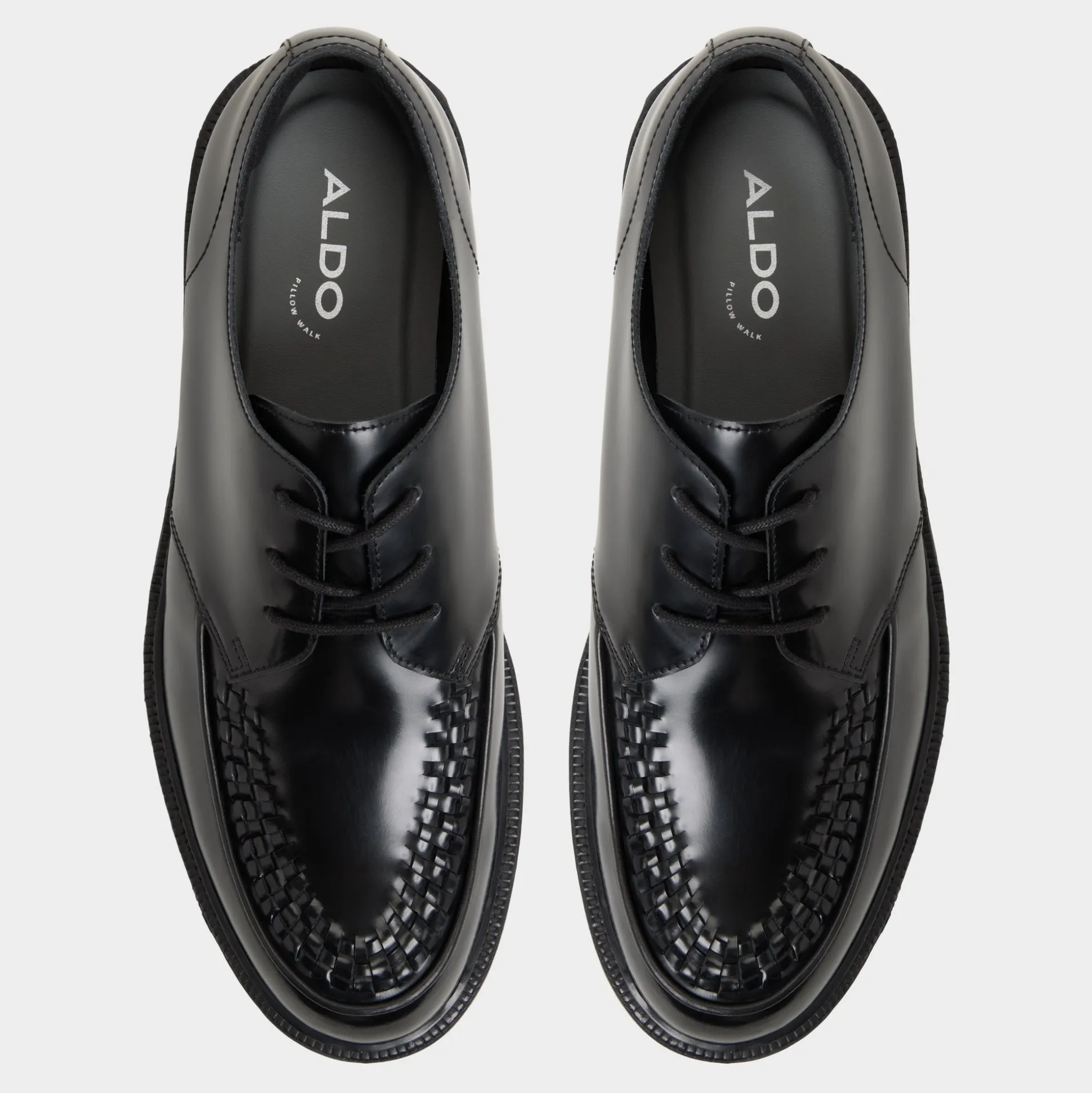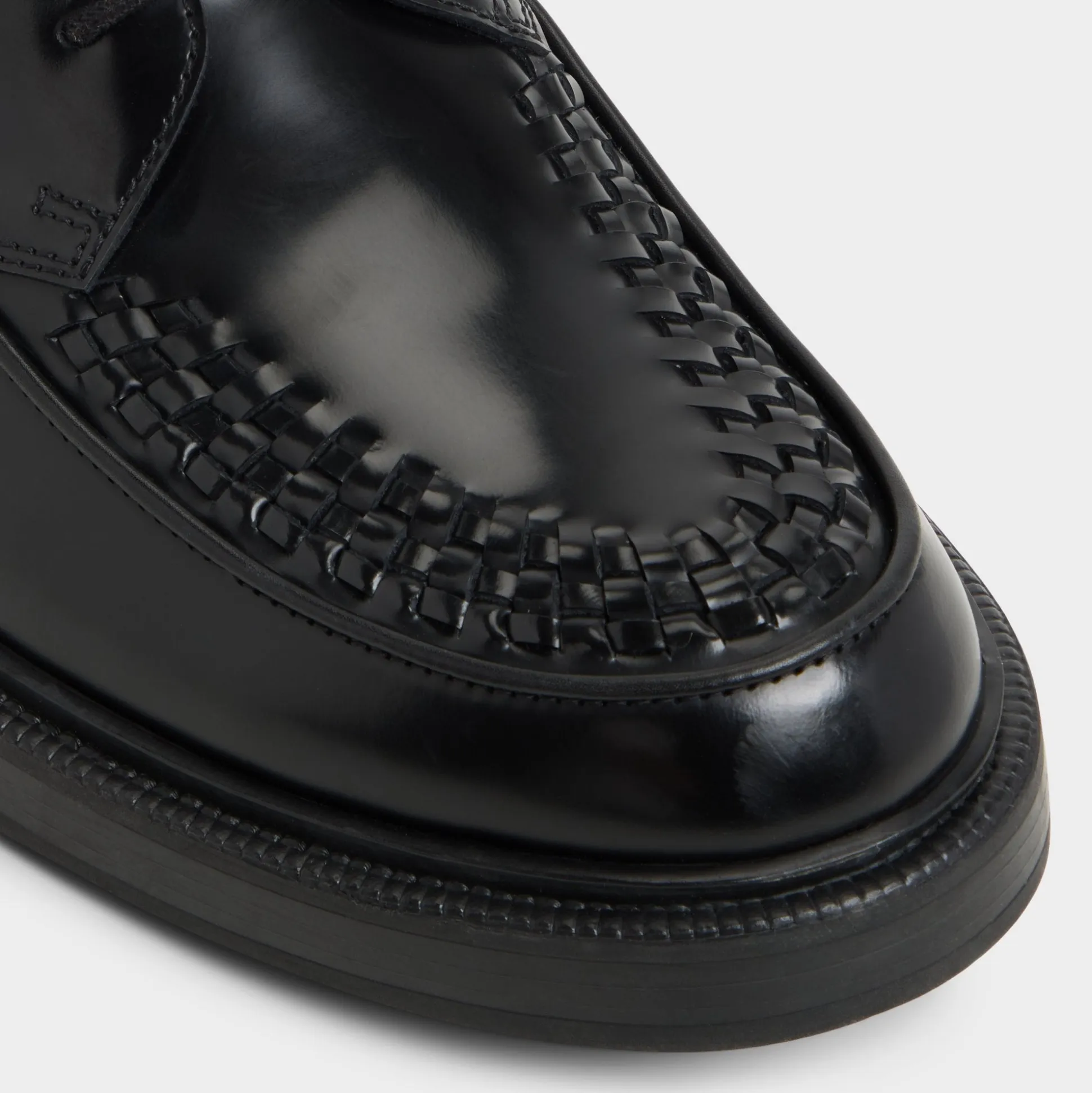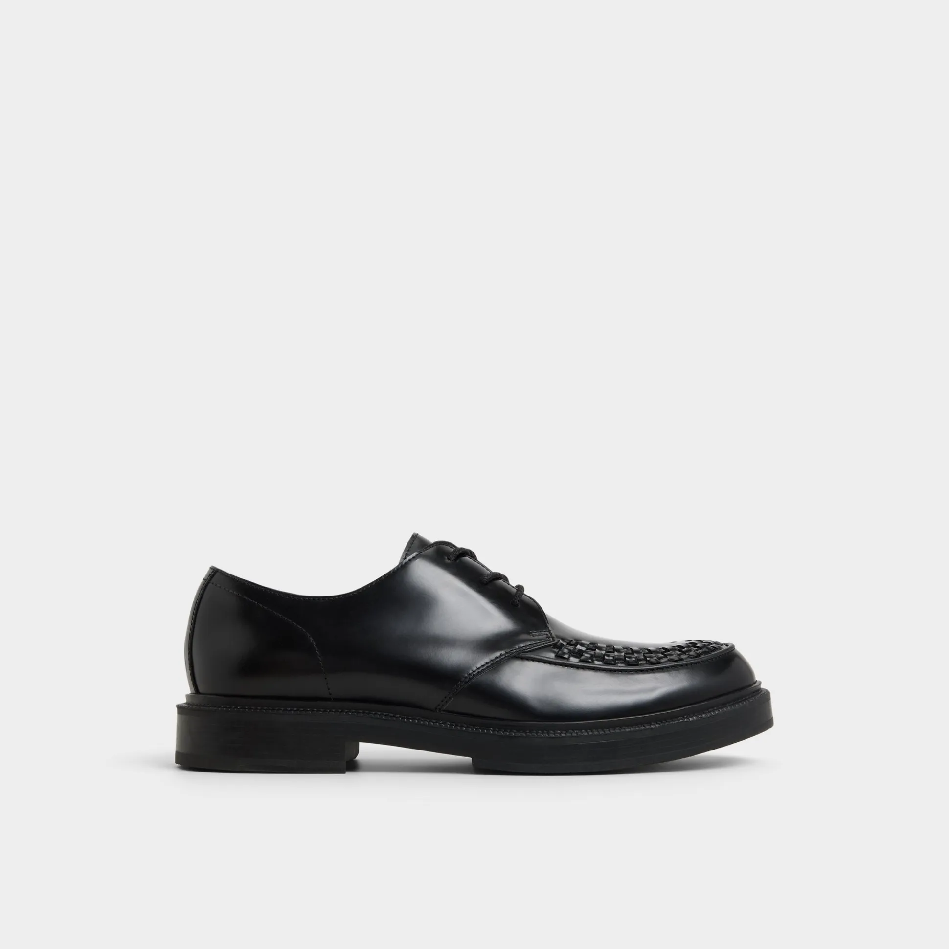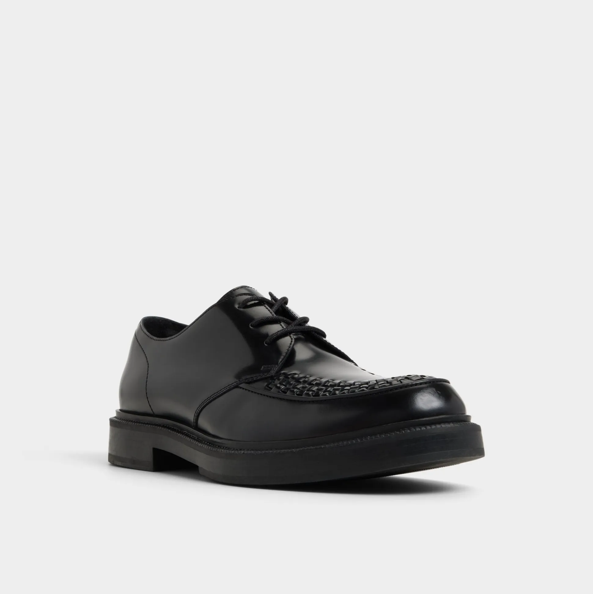 High-shine leather meets a woven apron on this Oxford, giving classic lines a fresh edge, while a rubber lug sole cushions the rush from boardroom briefings to midnight gigs. Anchor slim charcoal suiting for client pitches or roll with cuffed black jeans at after-dark sets—the vamp sparks conversation effortlessly.