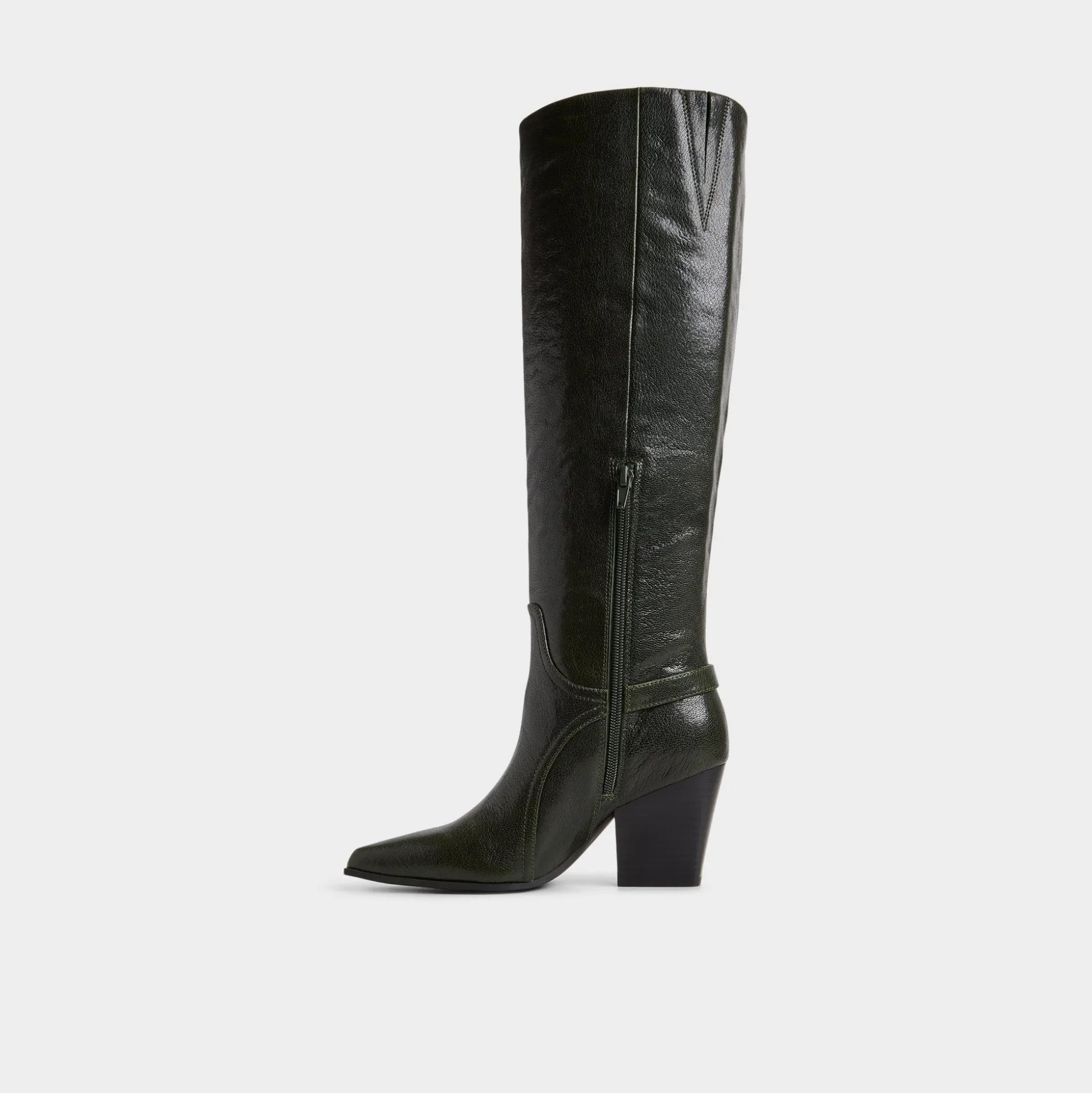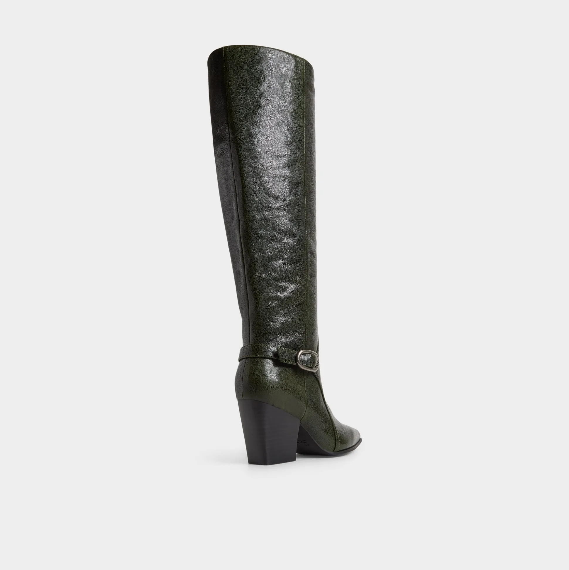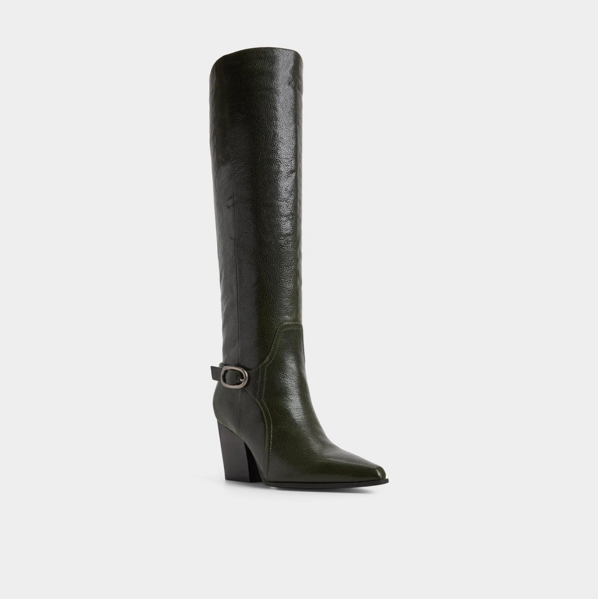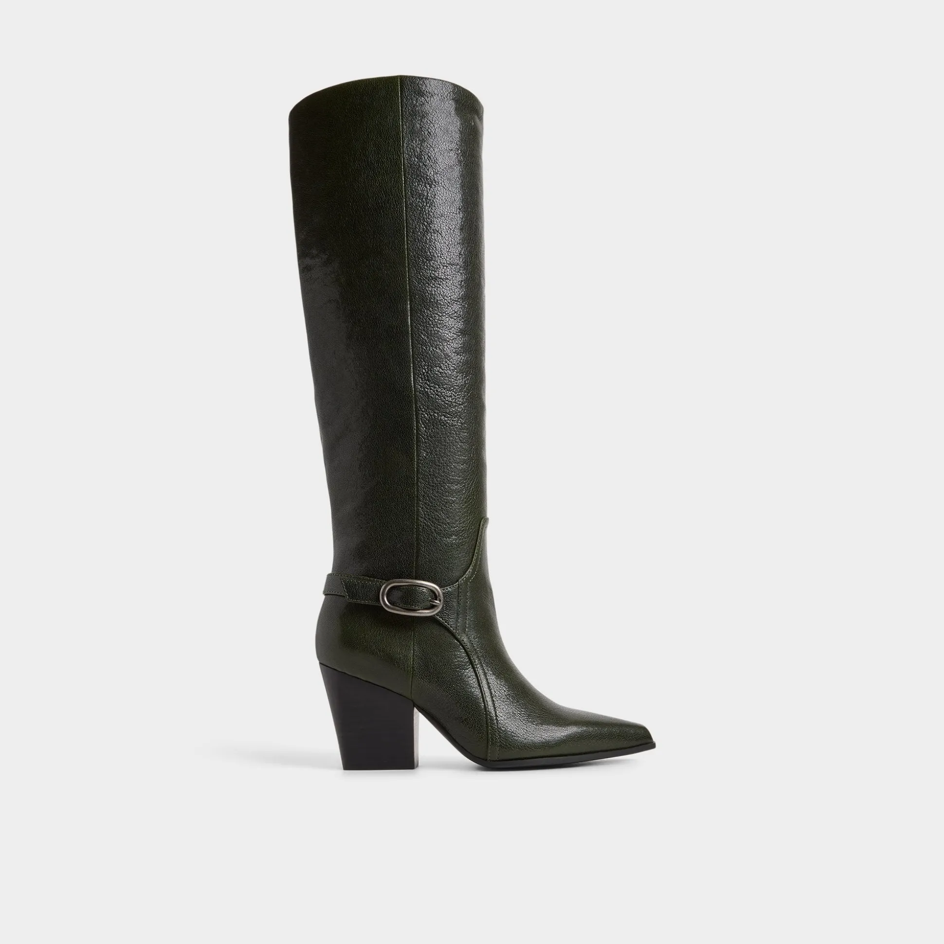 Deep forest leather wraps knee-high boots with a sculpted block-heel silhouette and buckle detail, channeling road-trip freedom and city polish, while a cushioned lining keeps each step confidently on track. Pair with ribbed dresses for gallery afternoons, or ground tailored shorts at rooftop mixers for all-day city style.