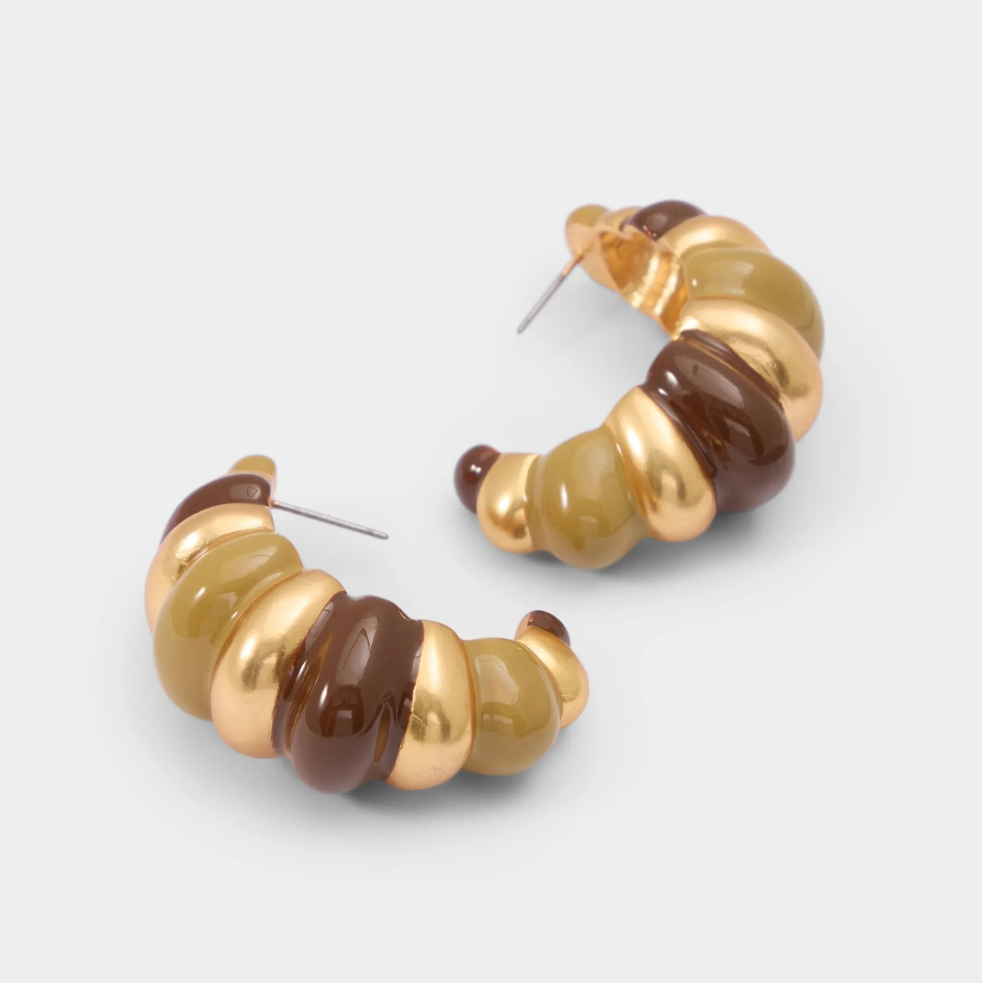 Swirled resin segments coil around metal, forming a croissant-shaped hoop that feels polished. Frame linen separates at brunch, stack them with studs beside a blazer for rooftop plans, or wear the set with sandals to finish a day-to-night transition today.