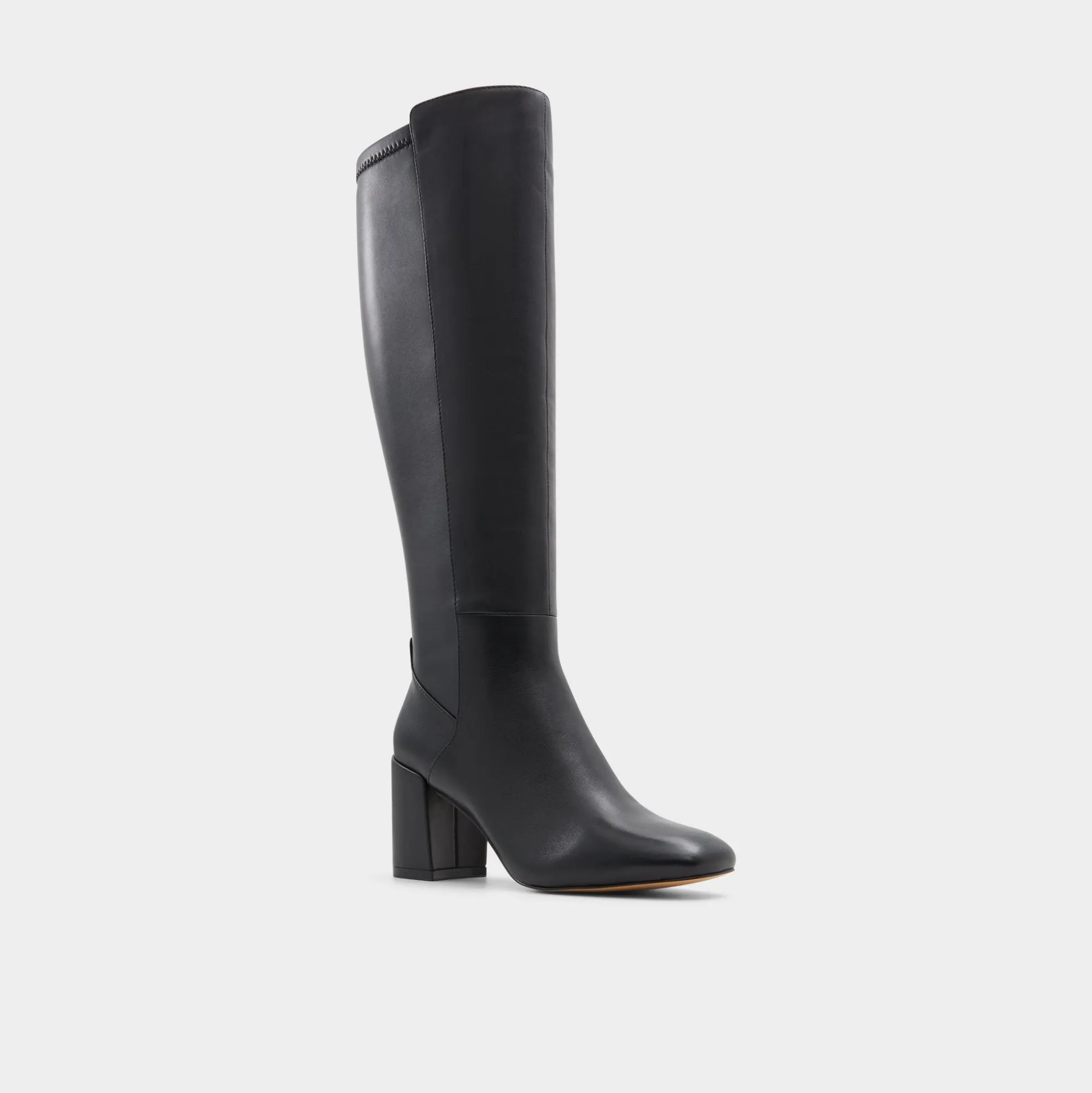 Knee-high black leather hugs the leg in a polished sweep, pairing a chunky block heel with a sleek almond toe for steady lift and city-ready polish. Pair with a ribbed sweater dress for commute mornings, or ground tailored shorts for city errands that demand both polish and ease.