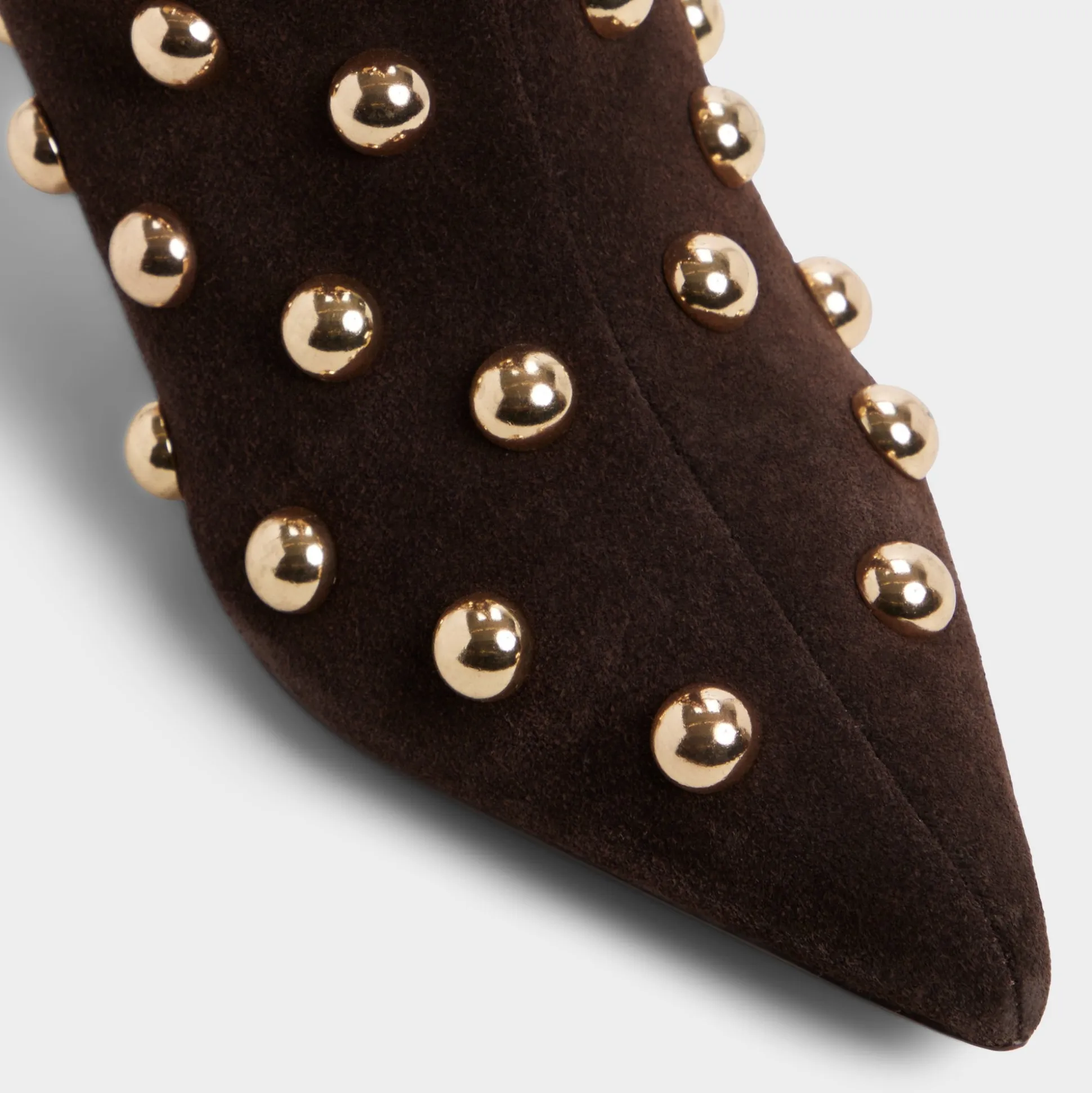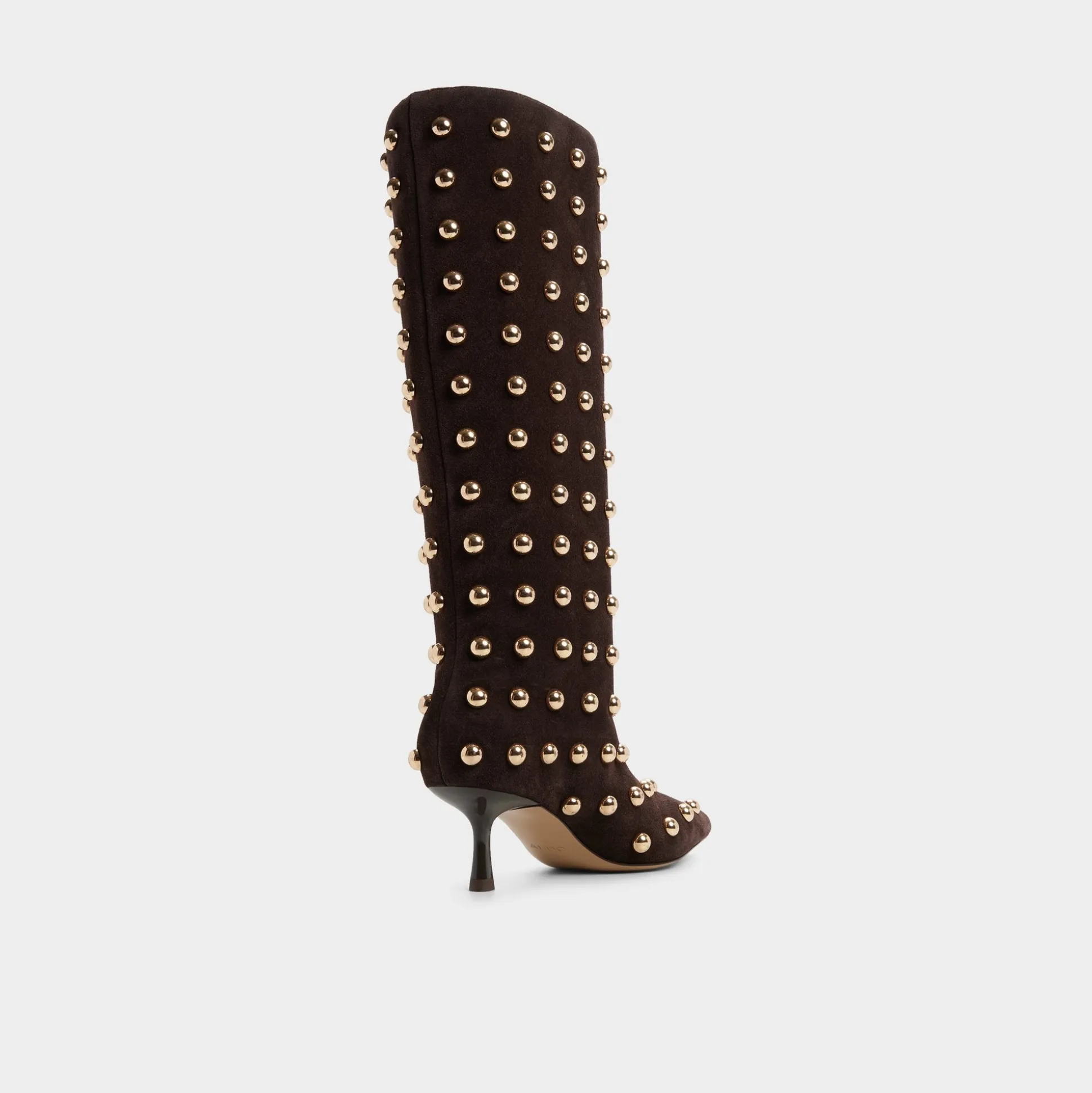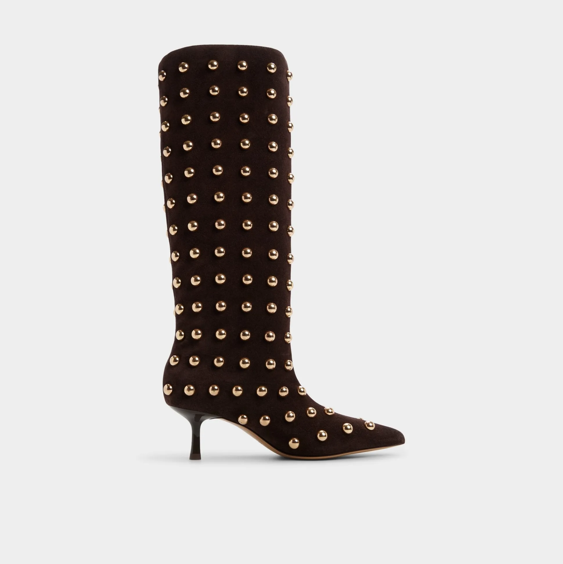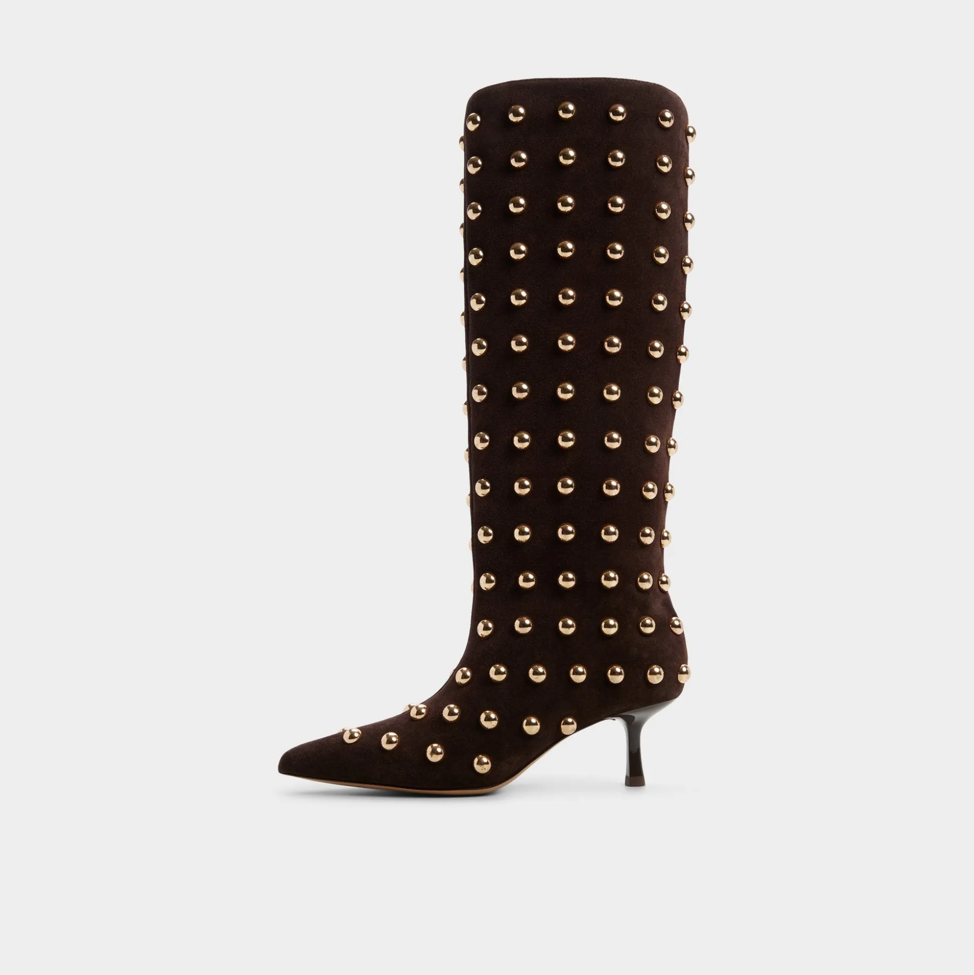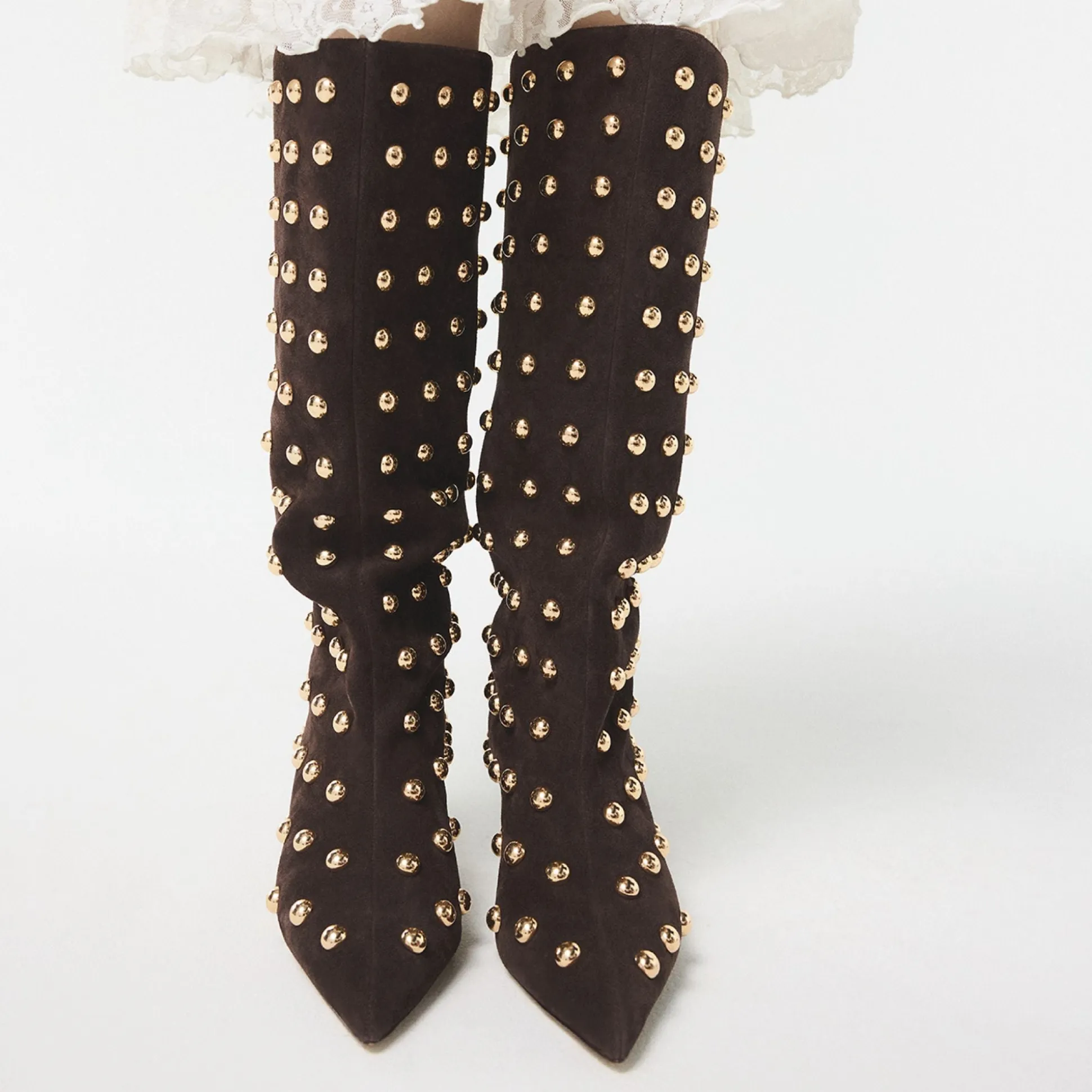 Velvety suede rises to the knee adorned with rows of gleaming gold studs that catch every sidelight, while a sleek kitten heel lets you linger comfortably at exclusive events. Pair with a leather mini for rooftop concerts, or ground a slim turtleneck-and-denim combo when errands call for quiet drama.