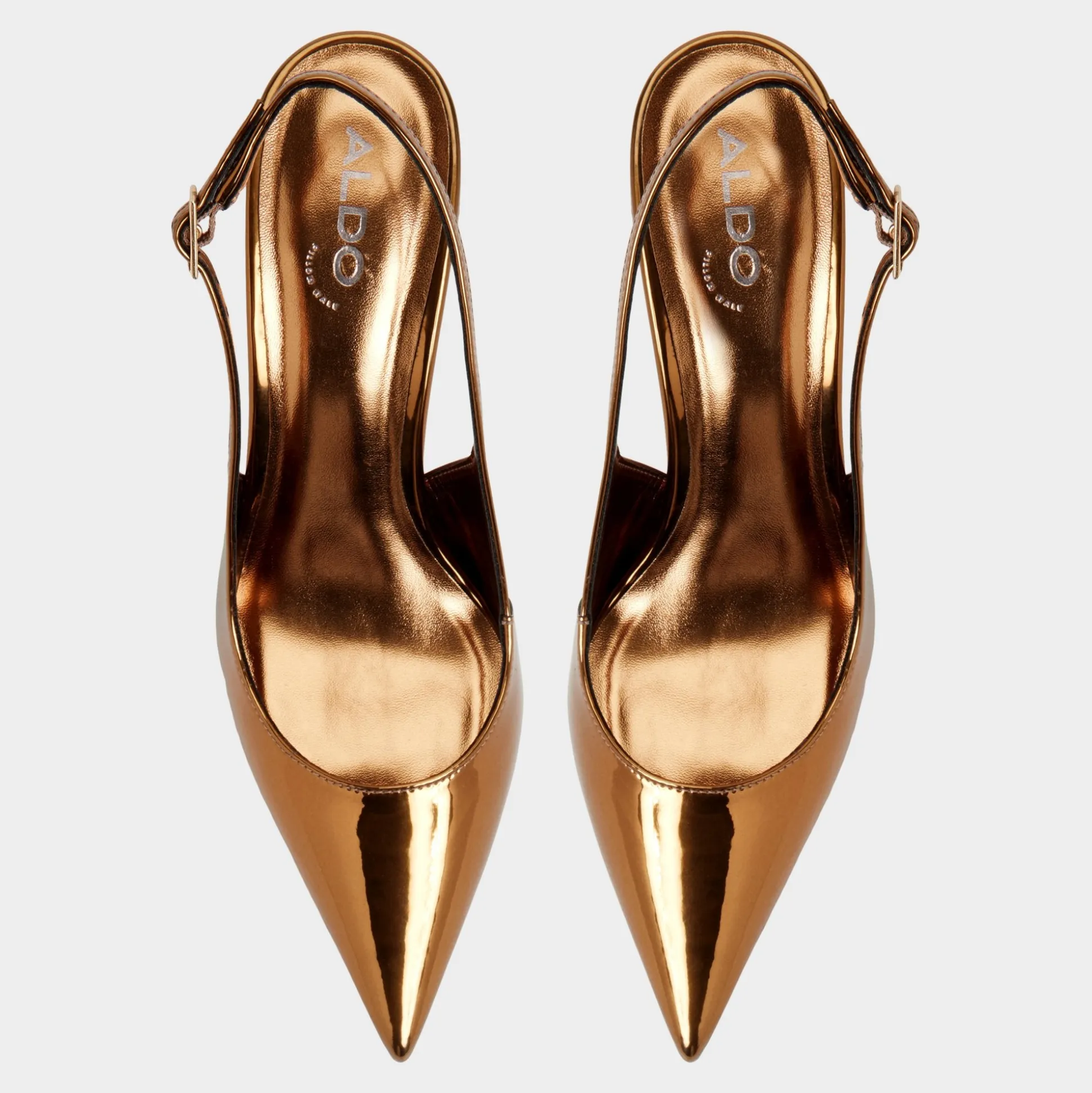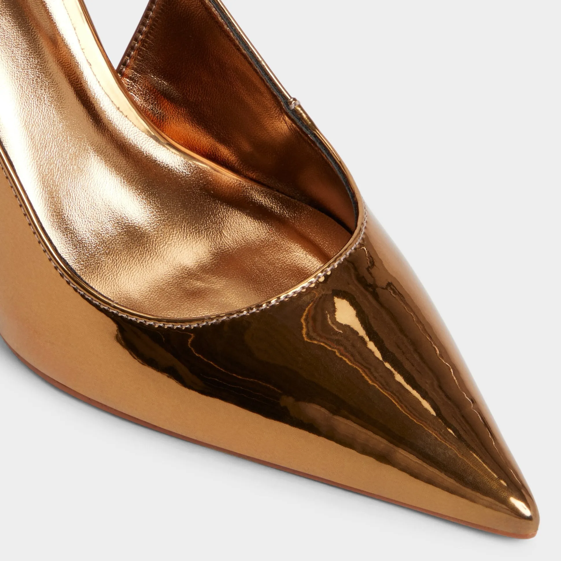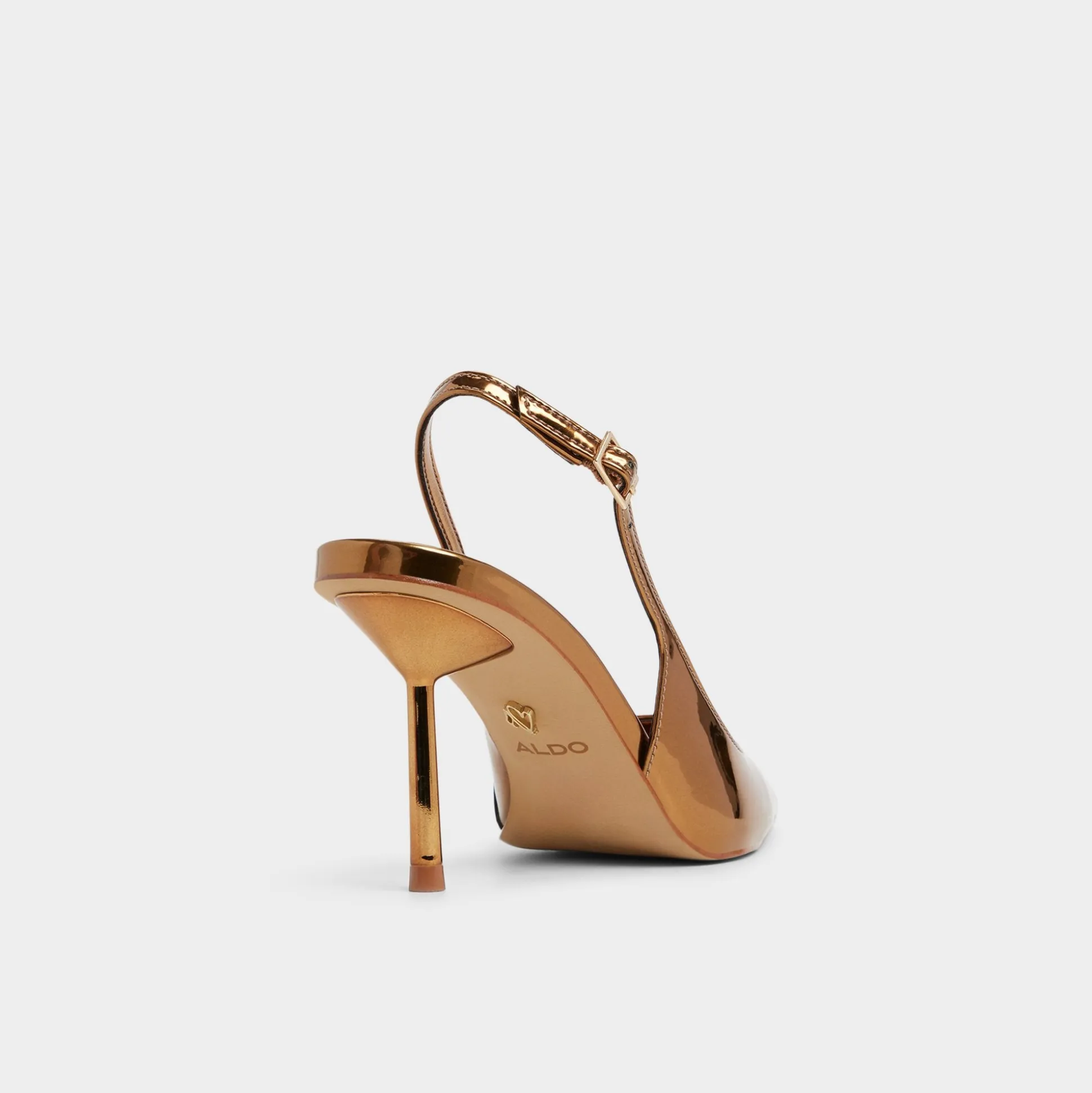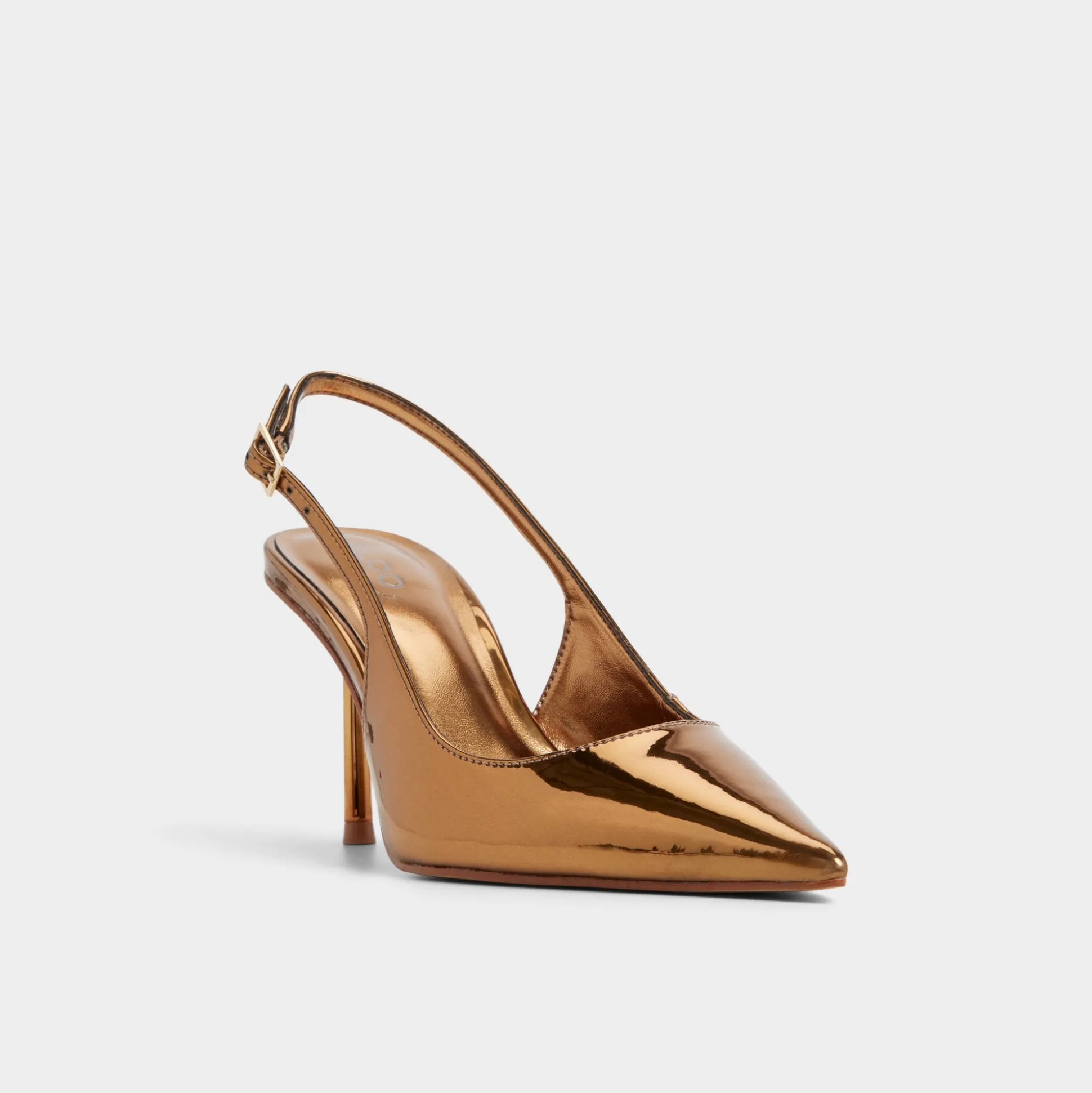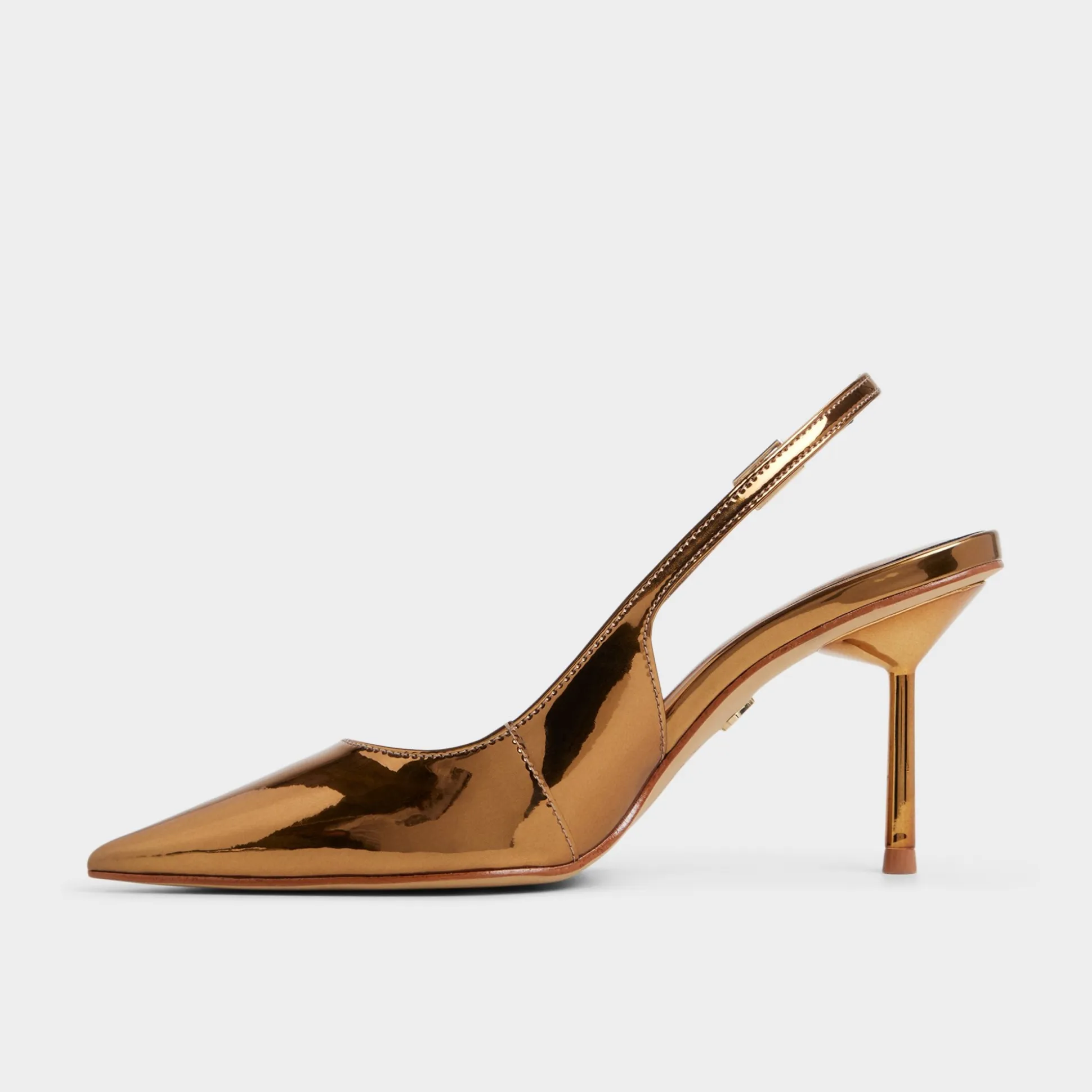 Molten metallic leather covers this razor-sharp point-toe slingback, pairing a slim stiletto with an adjustable buckle to give your stride edge as neon lights sweep every confident step through the city. Pair with sleek suiting for presentation mornings, or swap in a satin mini for nights out.