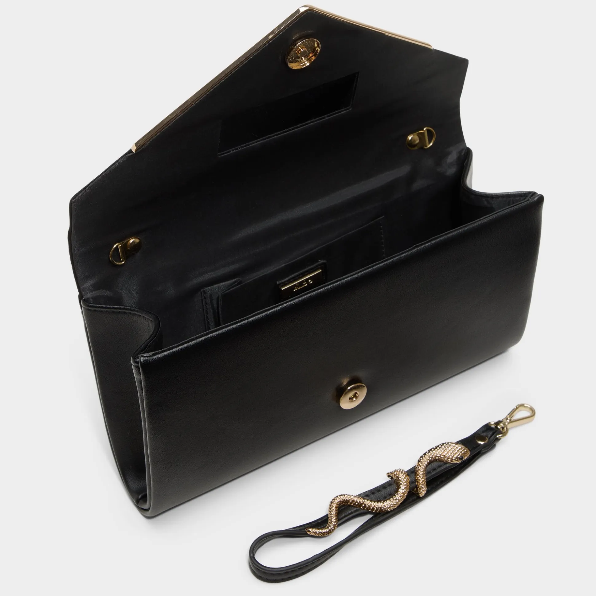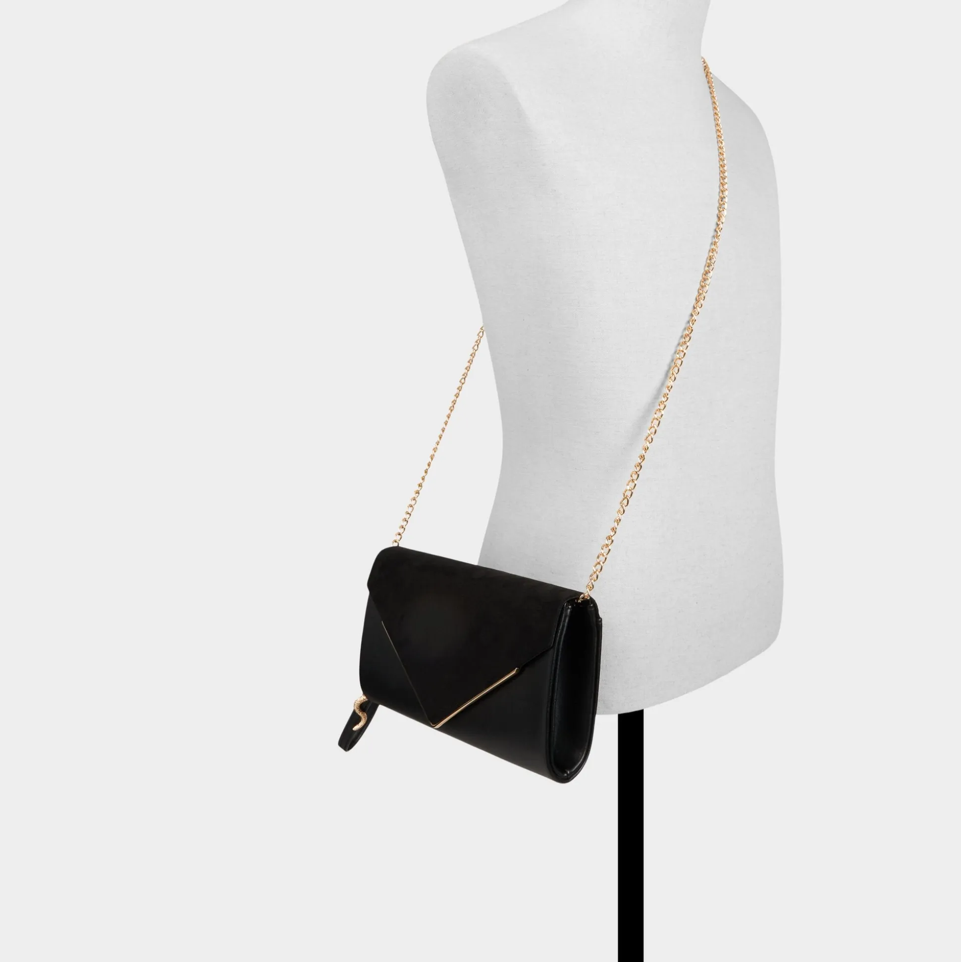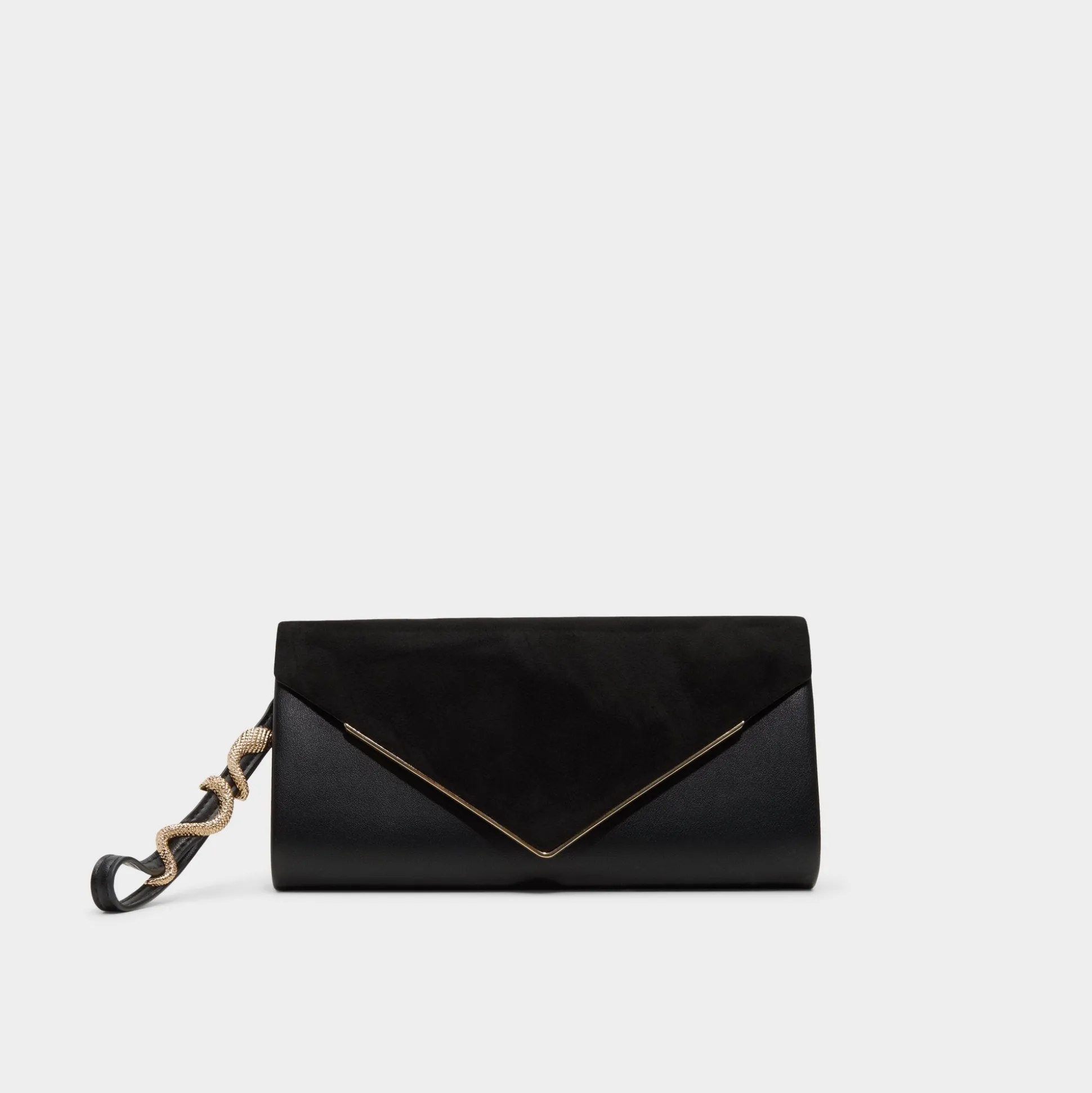 Velvety suede folds into a sharp envelope over smooth black leather, edged in gold with a sculptural snake-link strap that snaps off, flipping the clutch from hand hero to effortless shoulder swing. Carry it with a satin slip at rooftop drinks or sling it over a blazer-and-jeans brunch look, pulling every outfit together with subtle rebel polish.