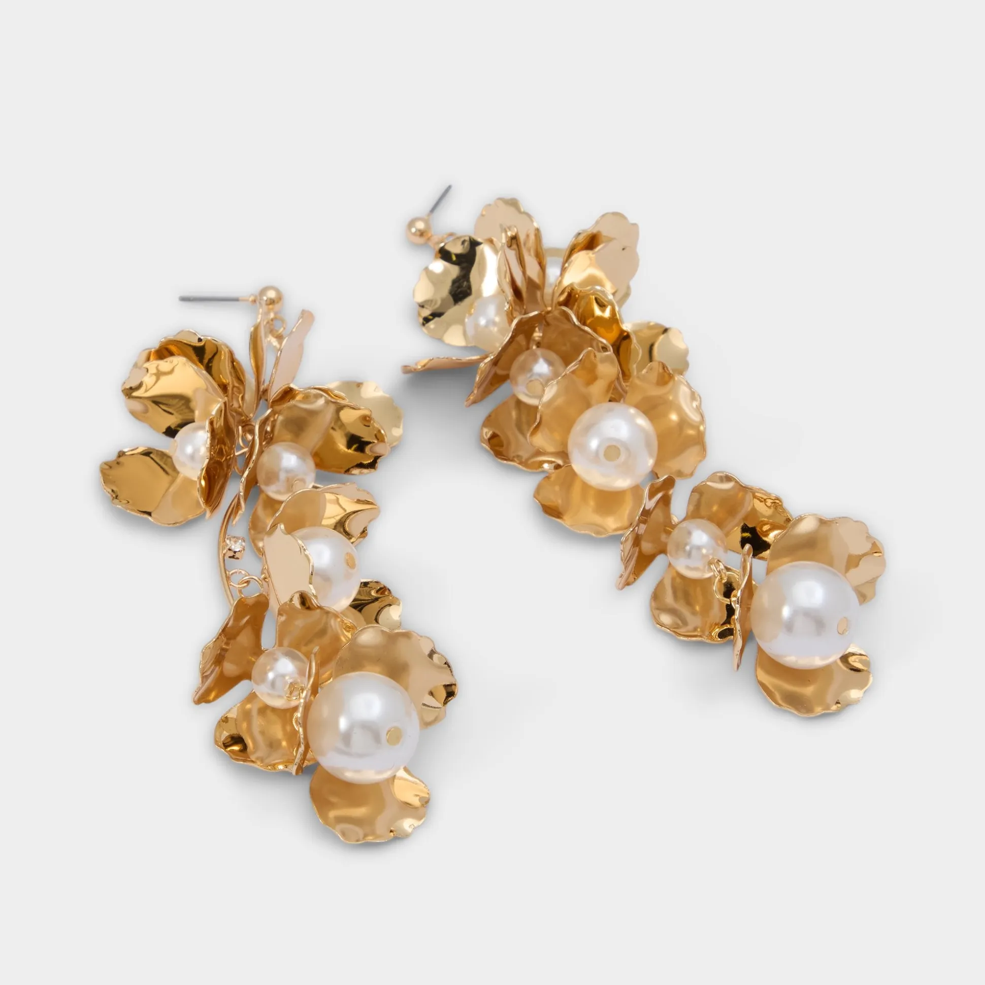 Sculptural earrings feature layered gold petals cradling pearls at their centre, catching light with drama. Top them with blouses at weddings, or pair them with a blazer dress for nights out, and switch to a look with the studs during fittings, photos, and celebrations.