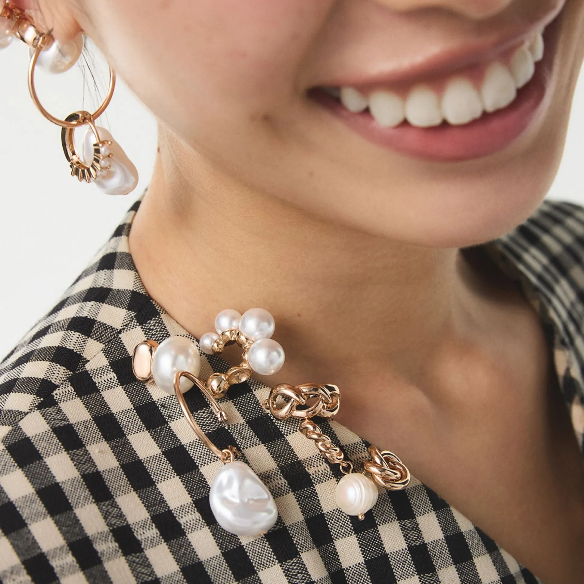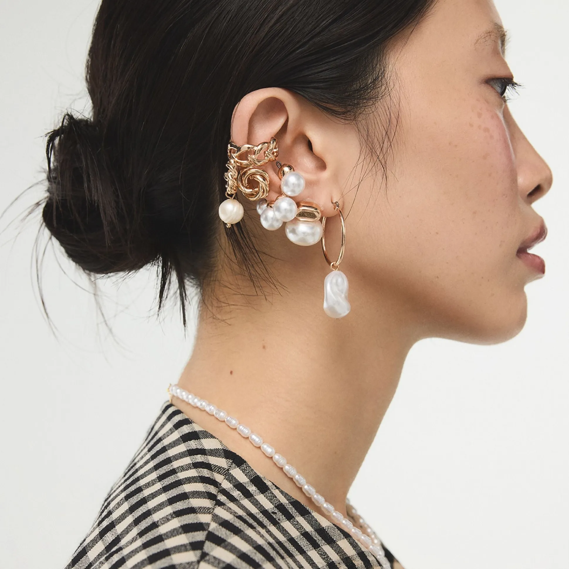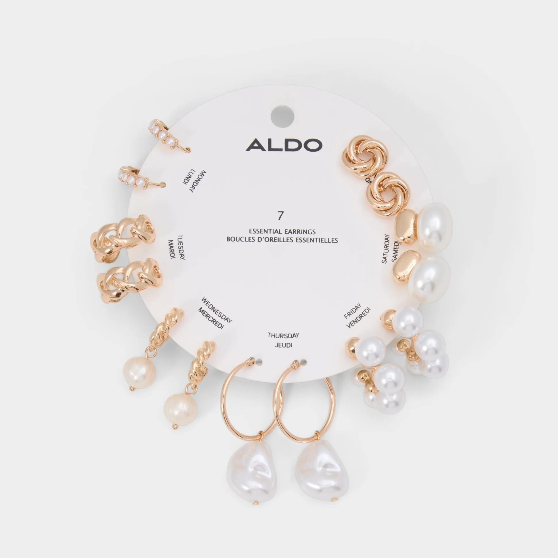 Seven mix-and-match earrings-knot studs, faux pearls, sculpted hoops and sparkly minis-line up like a weekly mood board, letting you shift from subtle shimmer to bold swing instantly. Stack a pearl drop with a slip dress for rooftop brunch, or pair the twisted knot with a blazer and denim on presentation days.