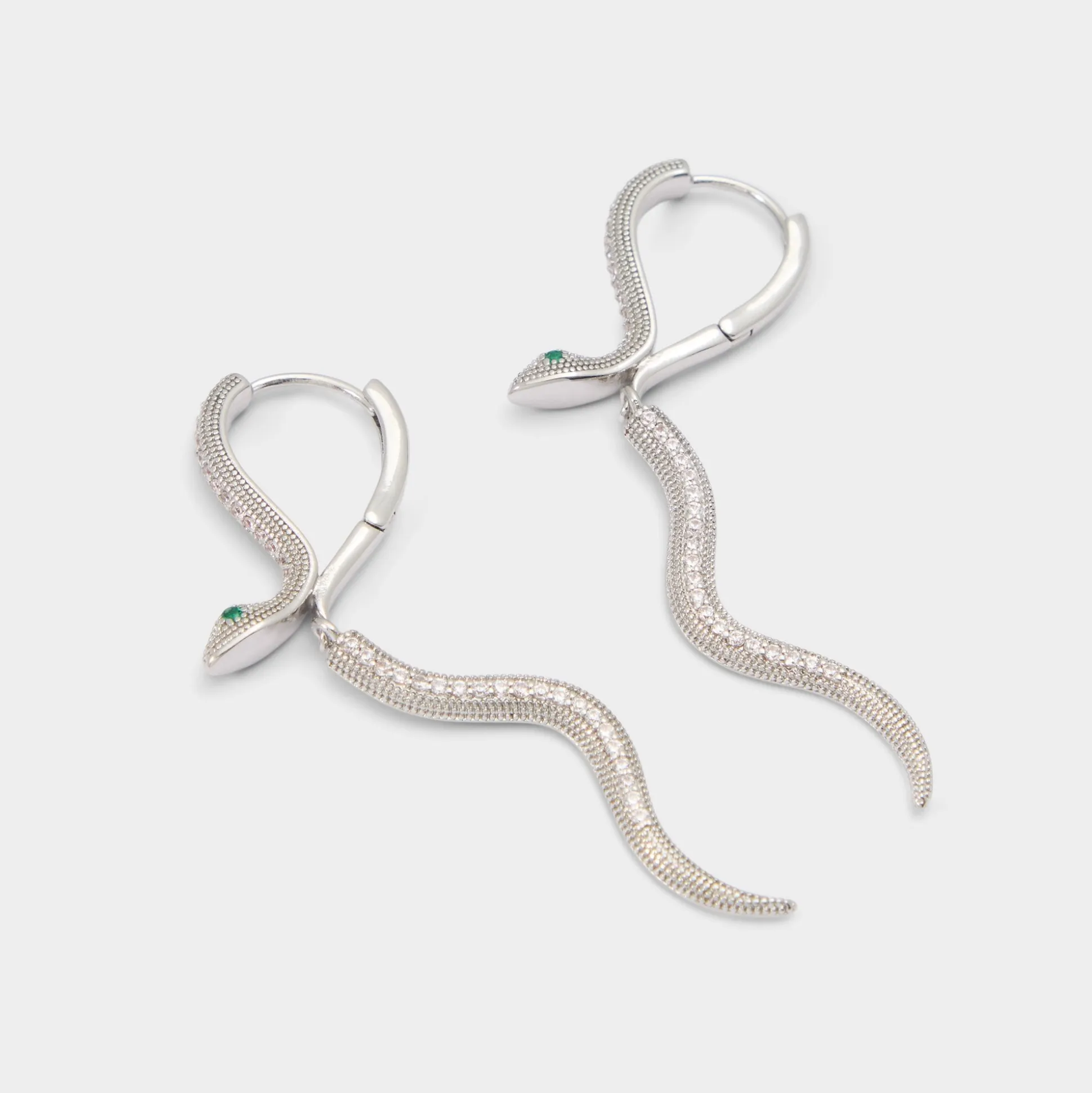 Snake silhouettes coil into drops from hinged hoops, with pavé zirconia scales catching flashes as you turn your head again and again in motion every moment. Frame them with a slip for cocktails on rooftops, or stack beside a jacket for gigs.