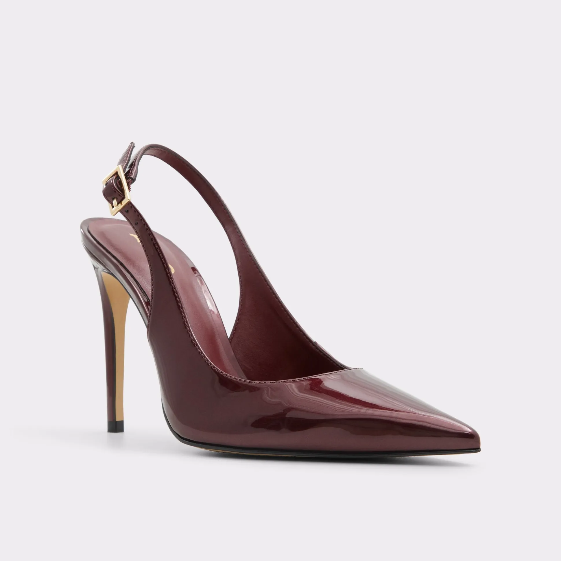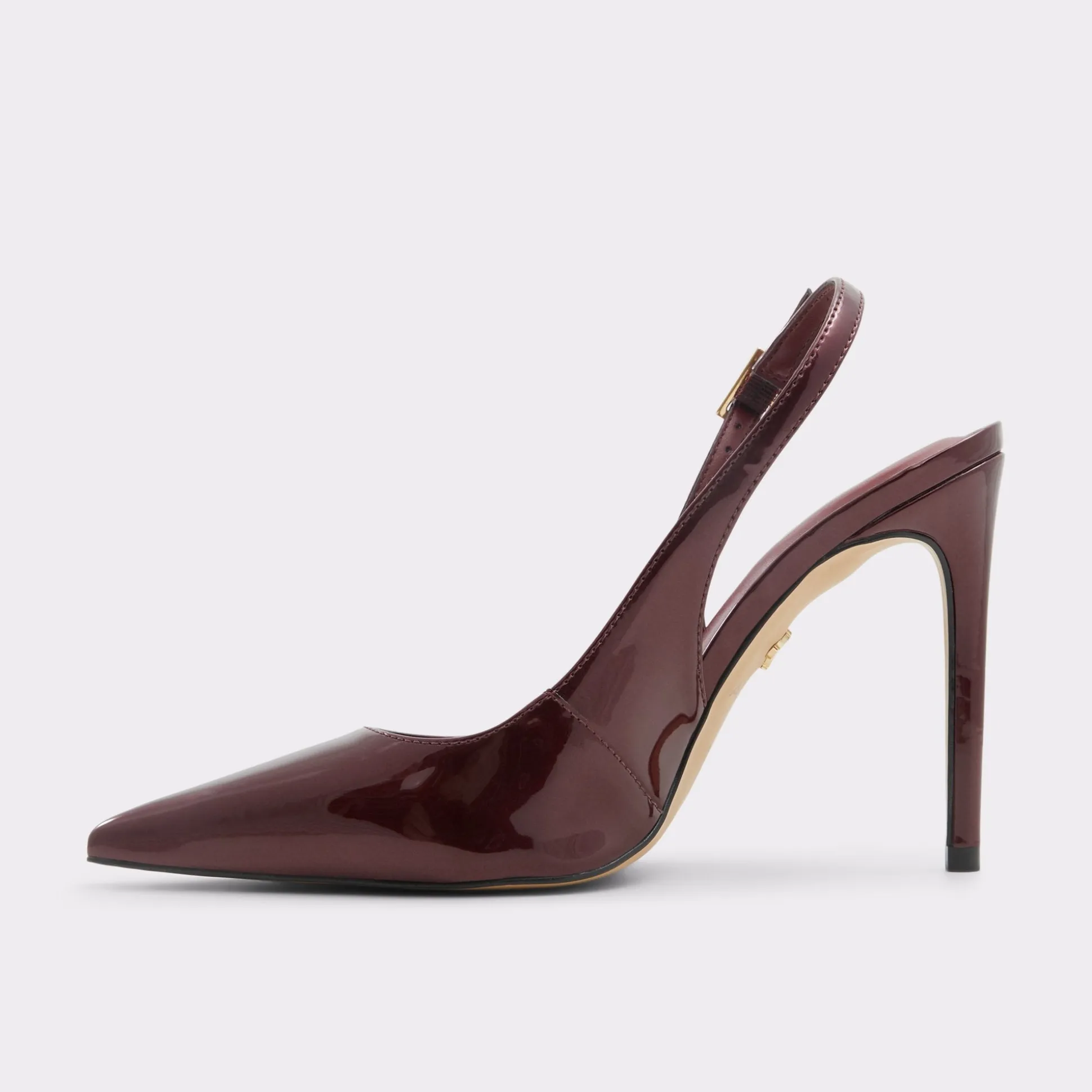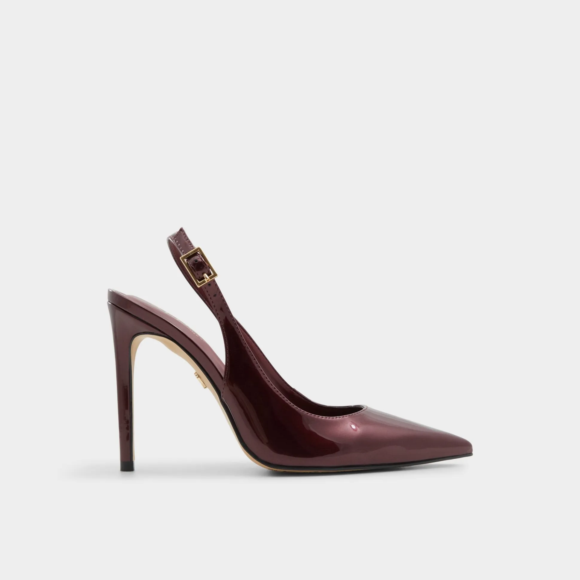 Velvety patent shine wraps this scarlet slingback, and a sharp stiletto adds clean altitude, turning each step into a spark, with an adjustable buckle keeping the fit secure. Pair with a tailored jumpsuit for networking hours, or slip under a slinky dress when date-night desserts become rooftop views.