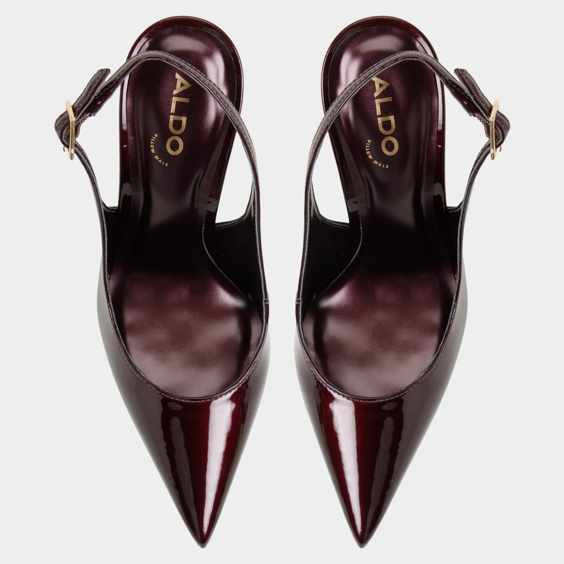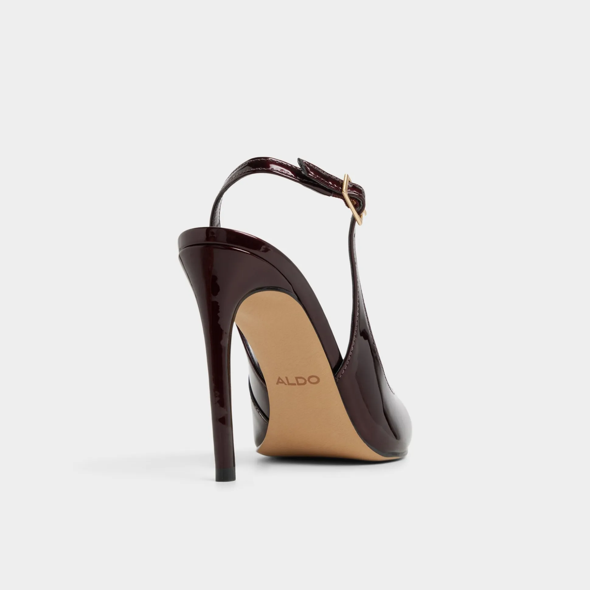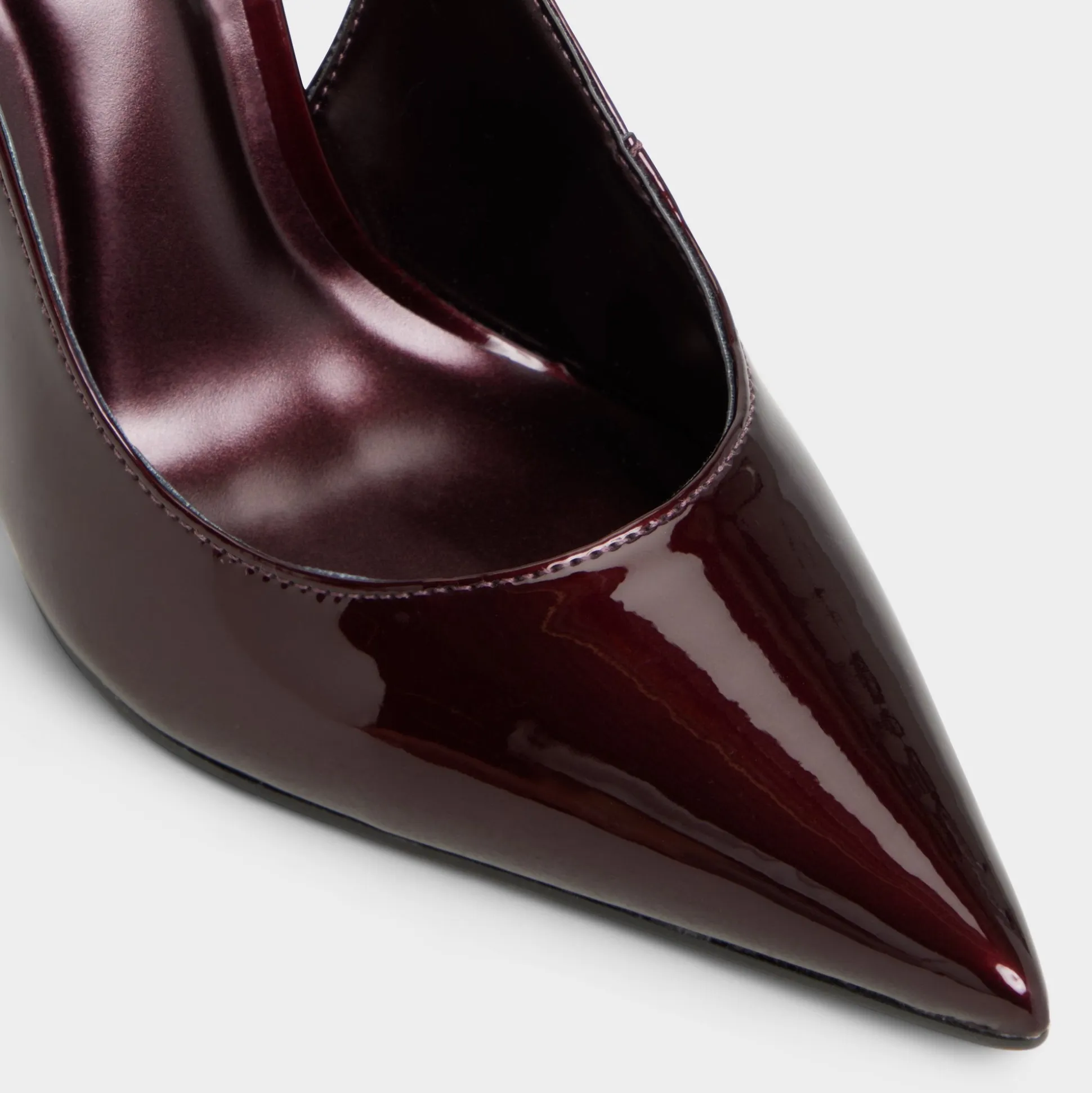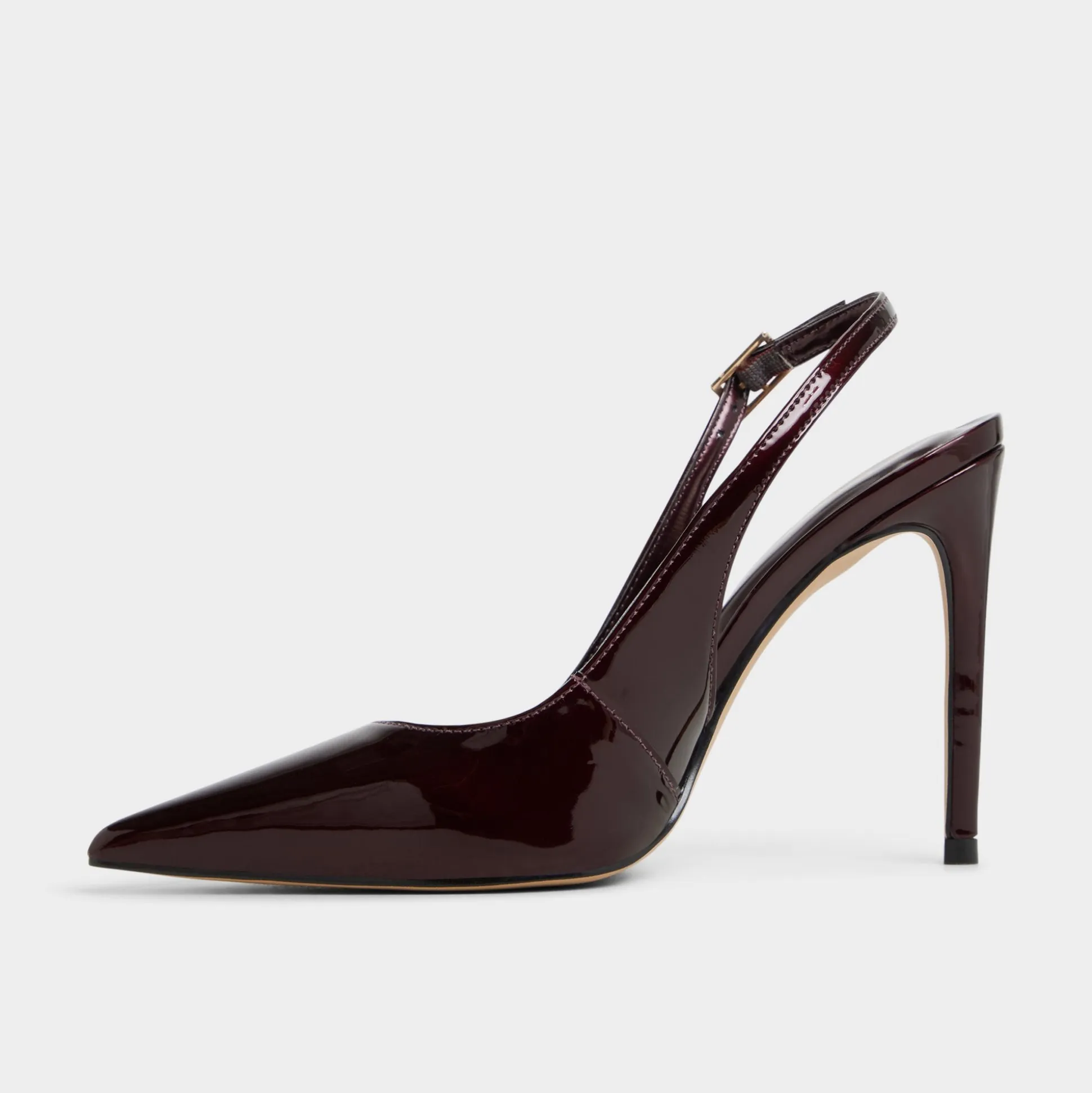 Burgundy patent wraps pointed slingbacks, soaring on razor stilettos that deliver after-dark confidence, while soft footbeds cushion every stride and the gleam of this heel height anchors the look in elegant, city-ready attitude. Pair with tailored trousers for gallery openings, or slip into a sleek slip dress for after-dark city strolls.