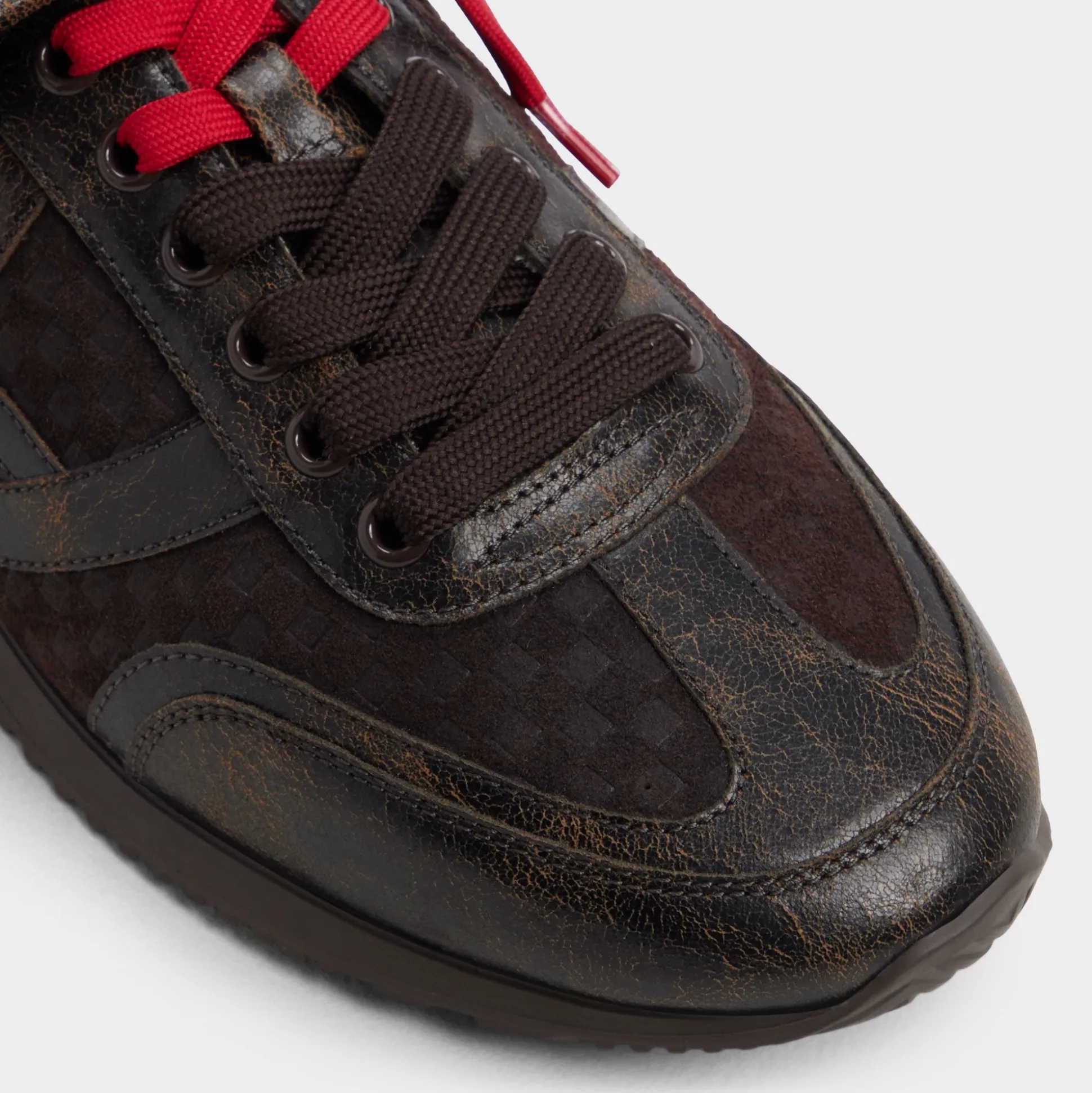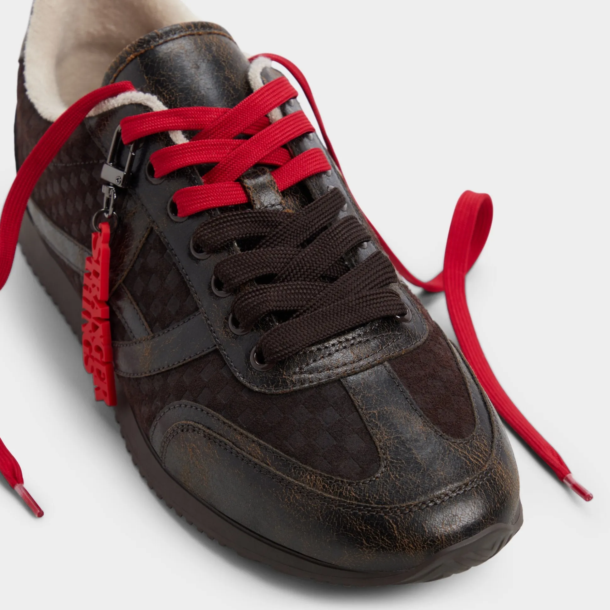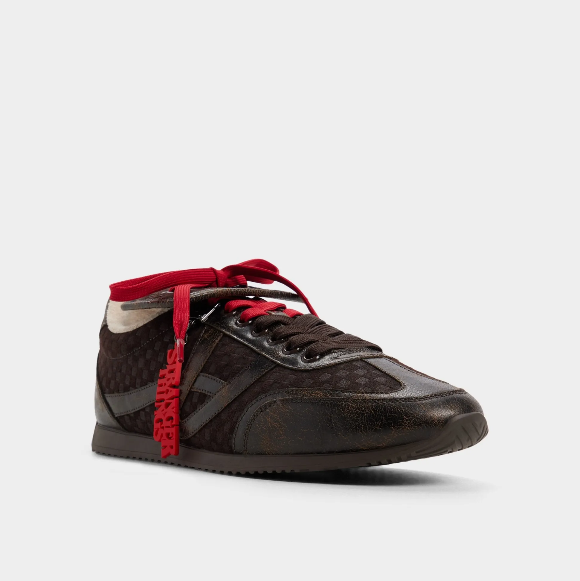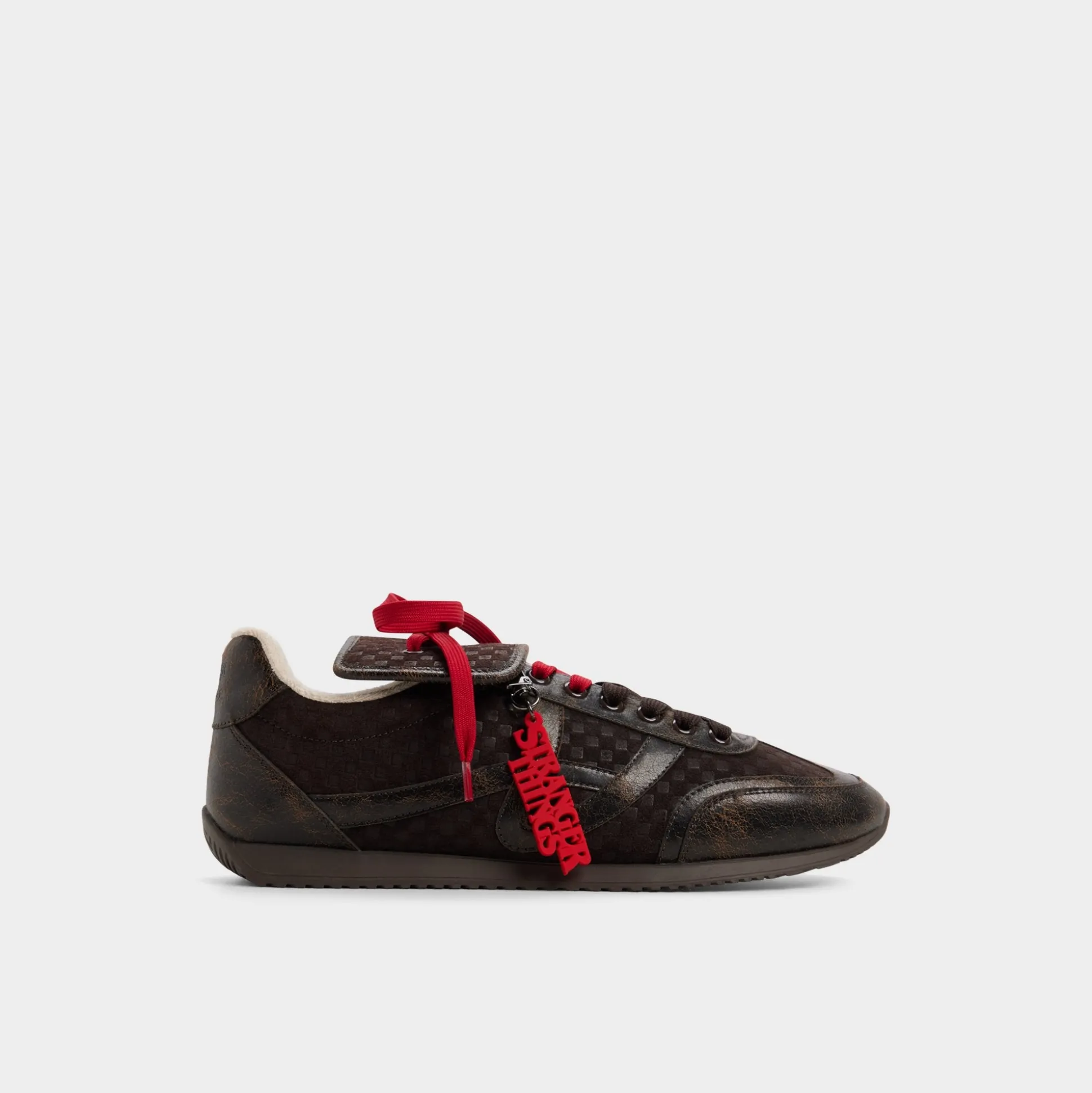 Rally the troops and return to the Upside Down with these Stranger Things x ALDO distressed, waffle-embossed brown leather runners. The red hang tag, terry cloth lining, and Hawkins tunnels on the sock plunge you deeper into the Stranger universe. And hidden on the tongue is an all-important reminder: Friends don’t lie.