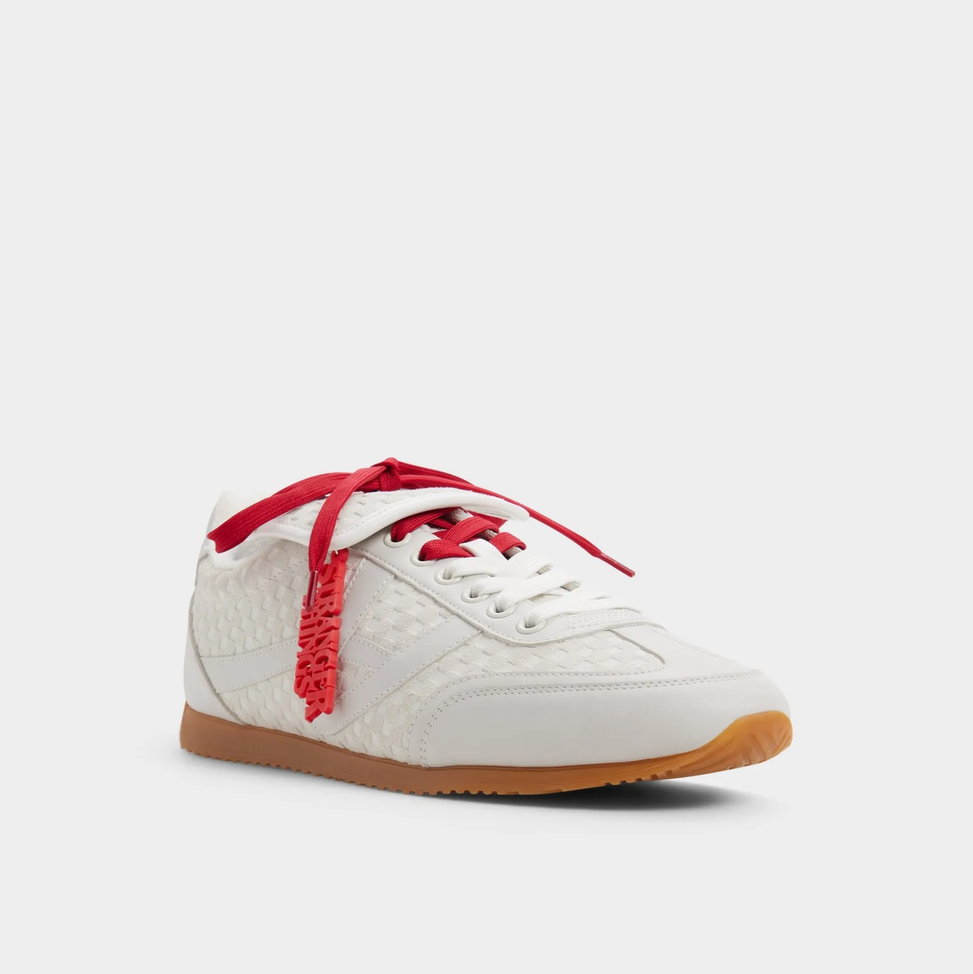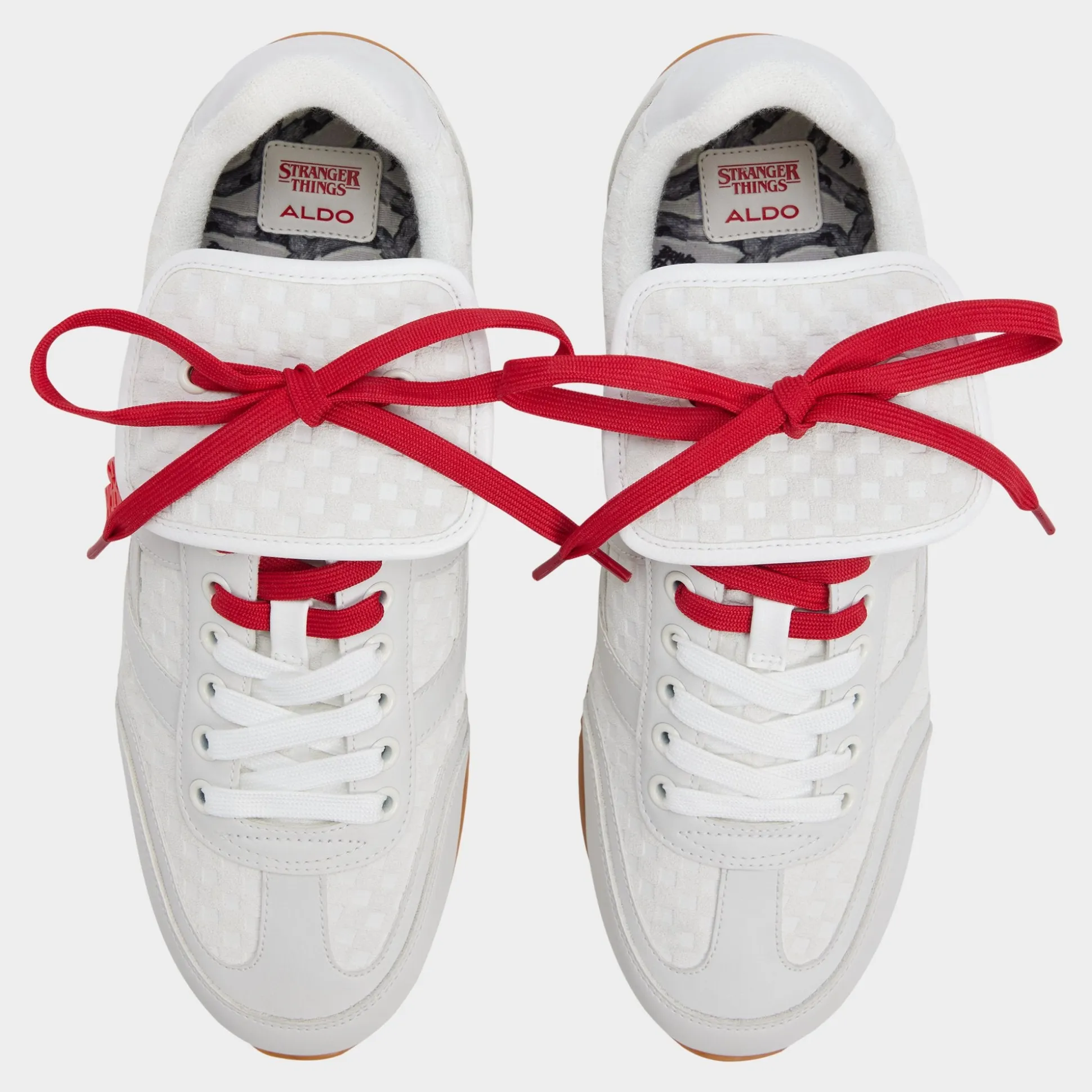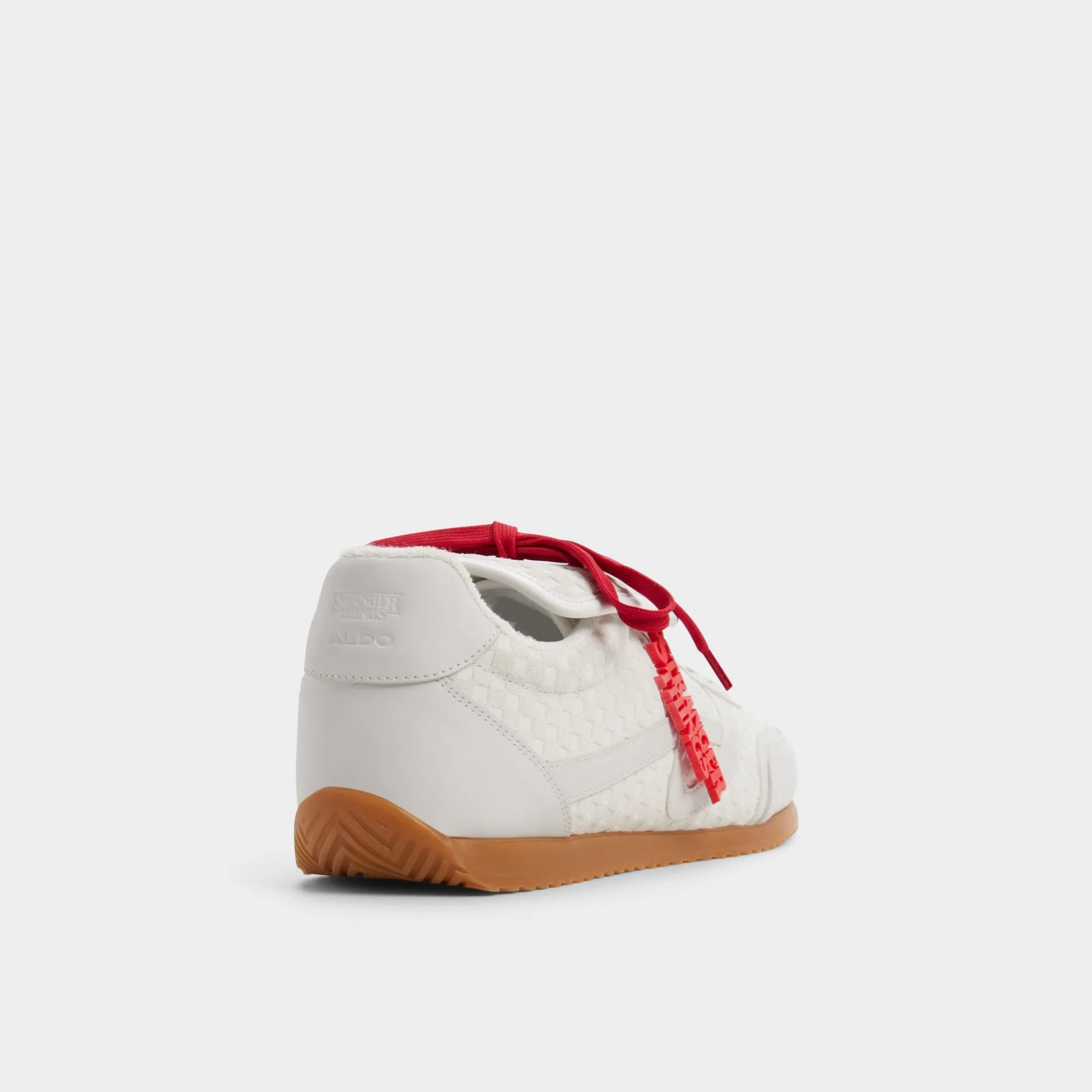 Rally the troops and step into a new dimension in these Stranger Things x ALDO waffle-embossed white leather runners. The retro terry lining, bold red hang tag, and Hawkins tunnels printed on the sock will plunge you deep into the Stranger universe. The quote hidden on the tongue says it all: Friends don’t lie.