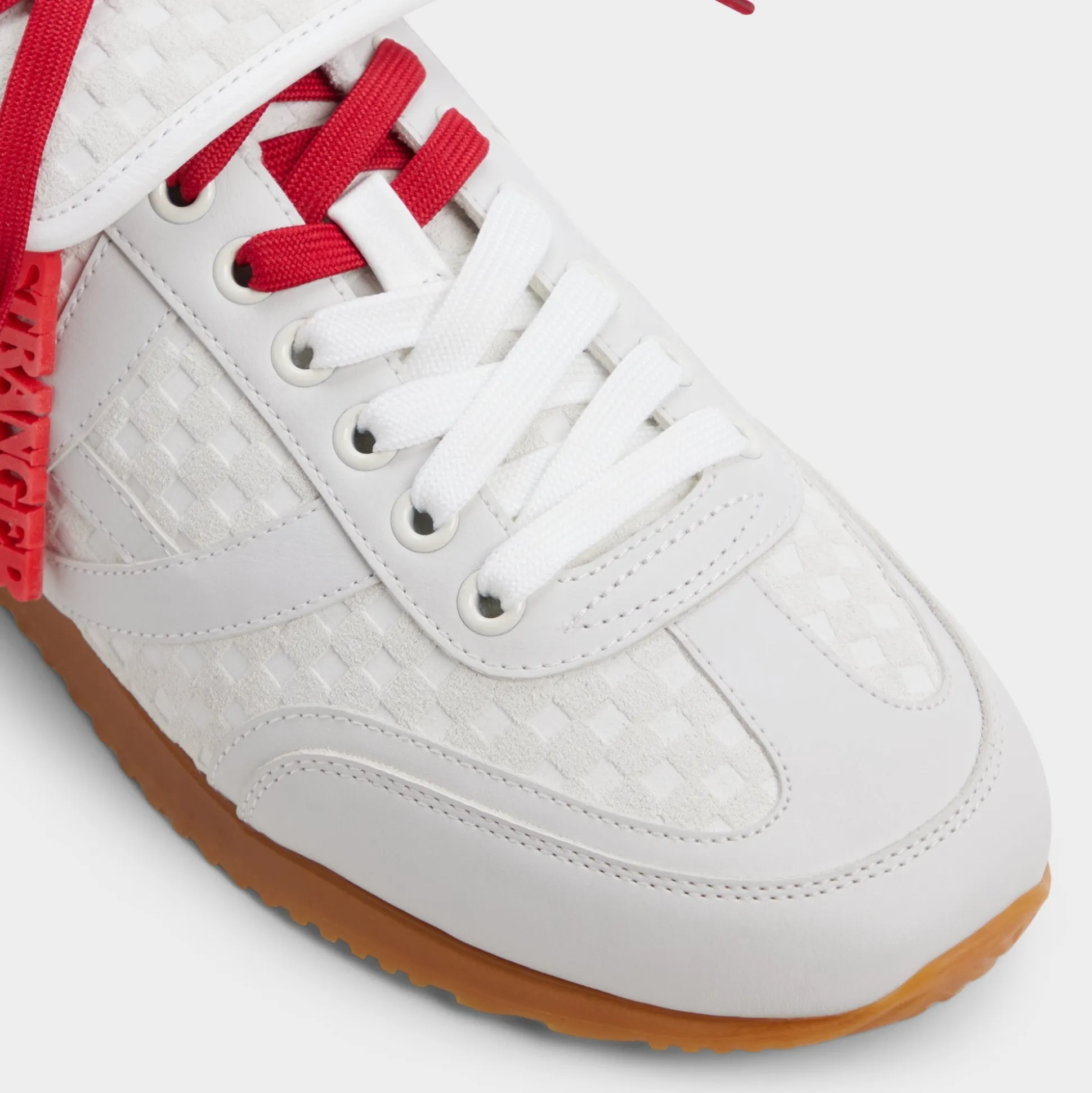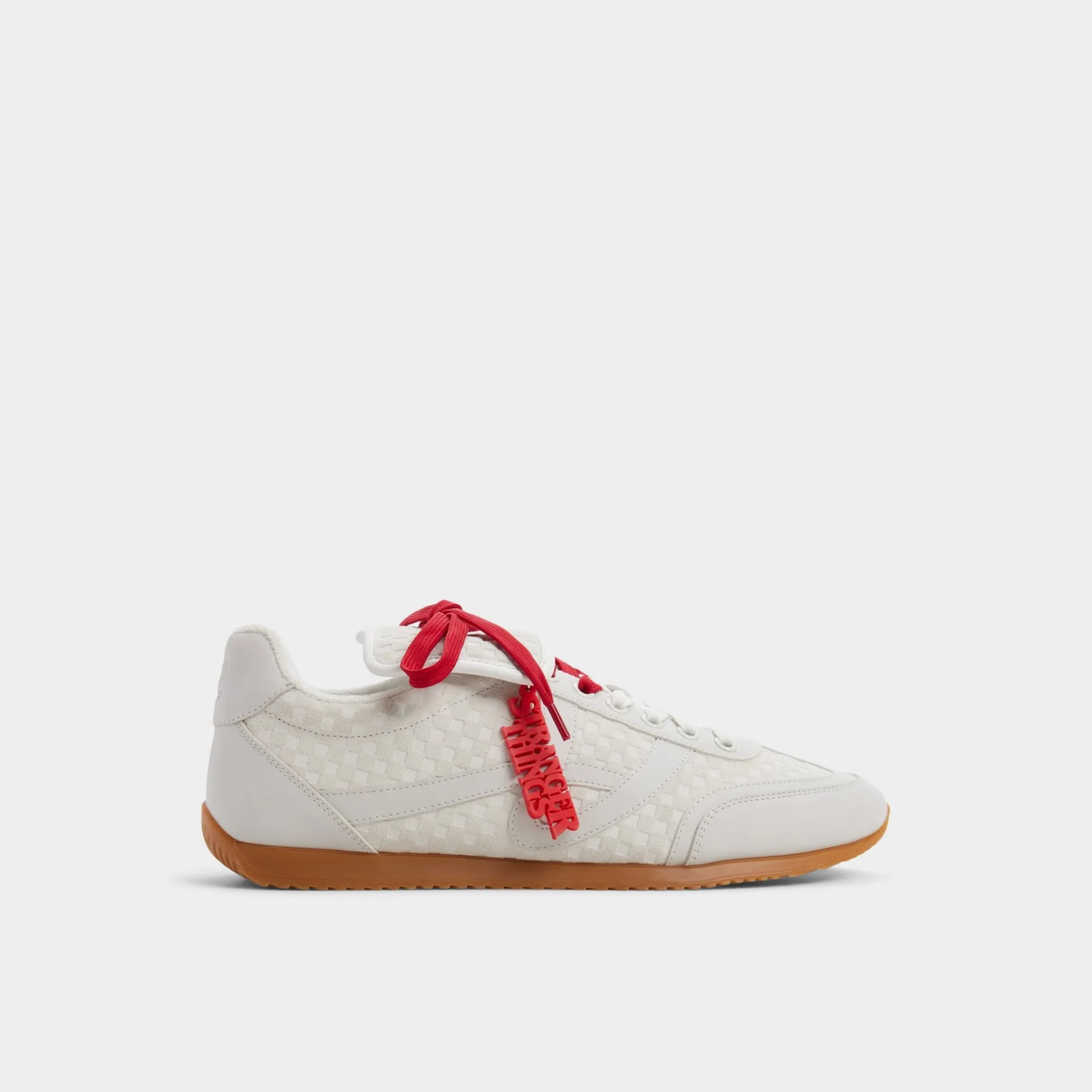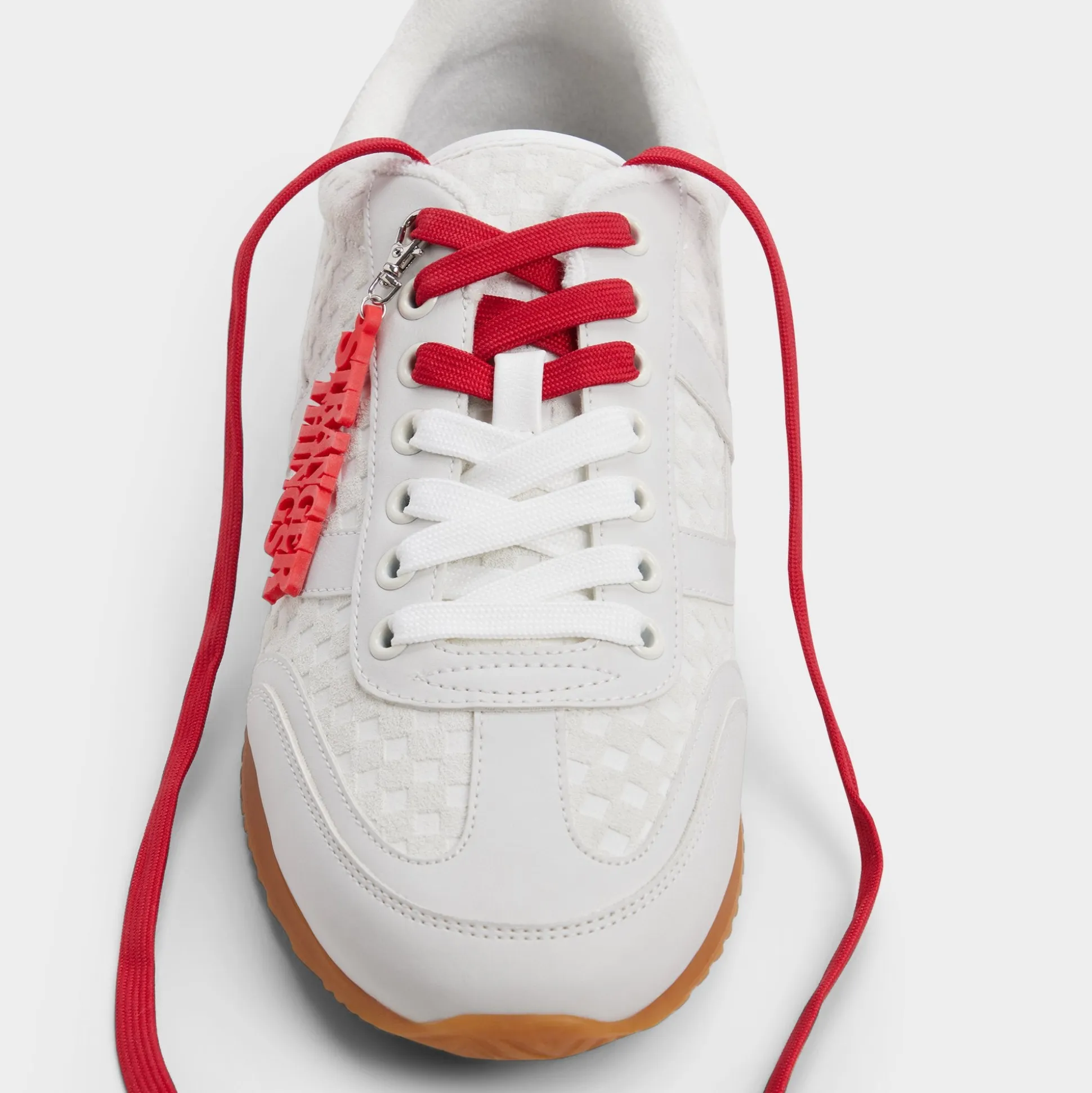Rally the troops and step into a new dimension in these Stranger Things x ALDO waffle-embossed white leather runners. The retro terry lining, bold red hang tag, and Hawkins tunnels printed on the sock will plunge you deep into the Stranger universe. The quote hidden on the tongue says it all: Friends don’t lie.