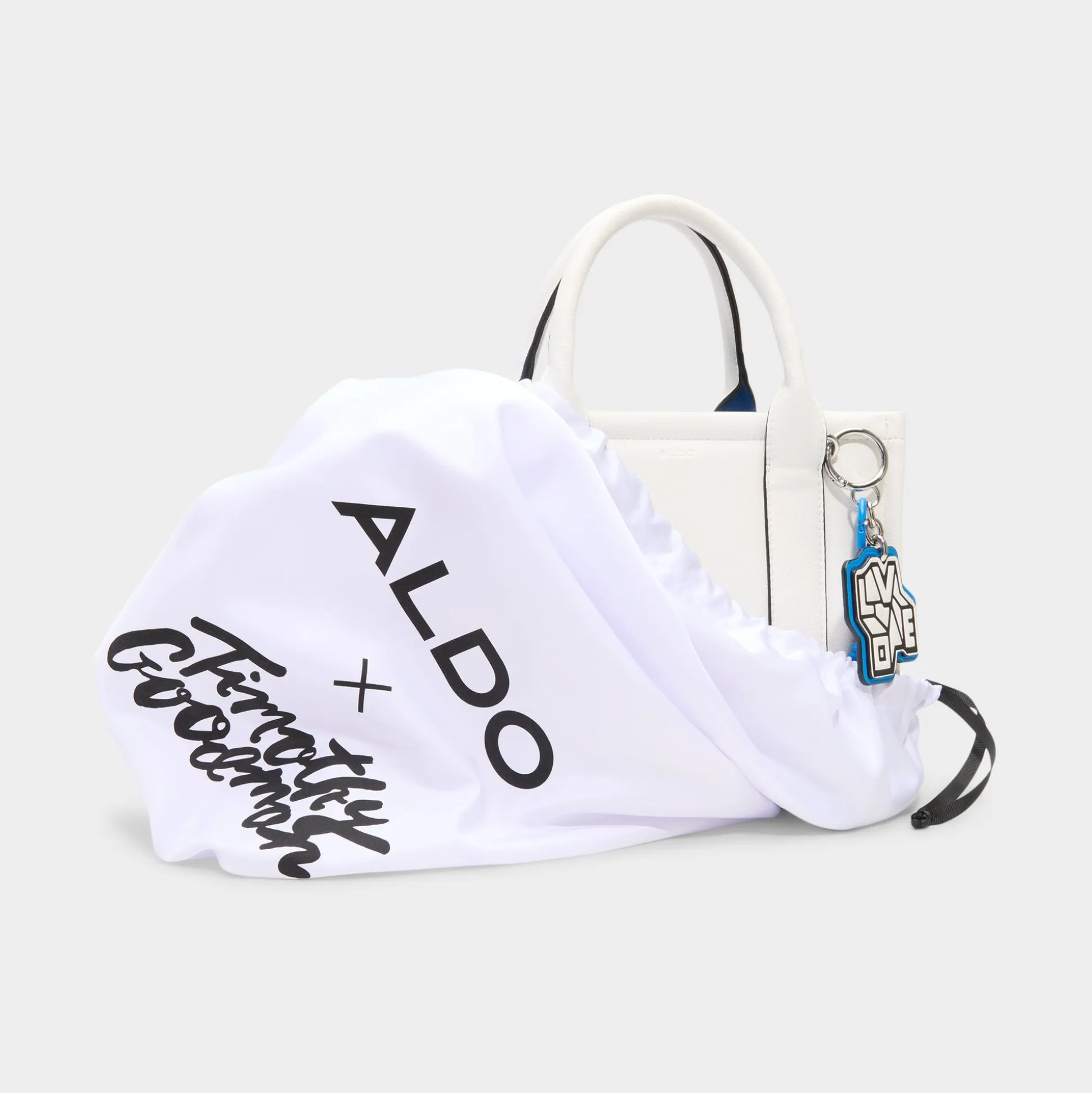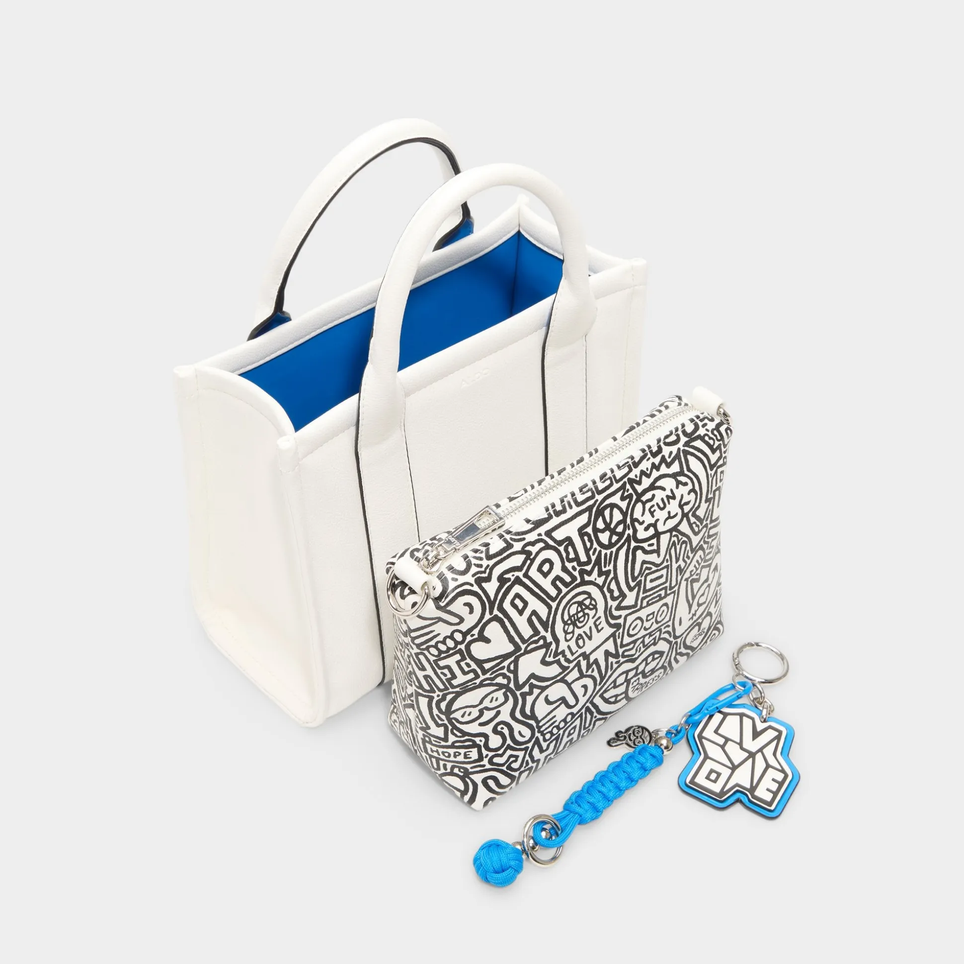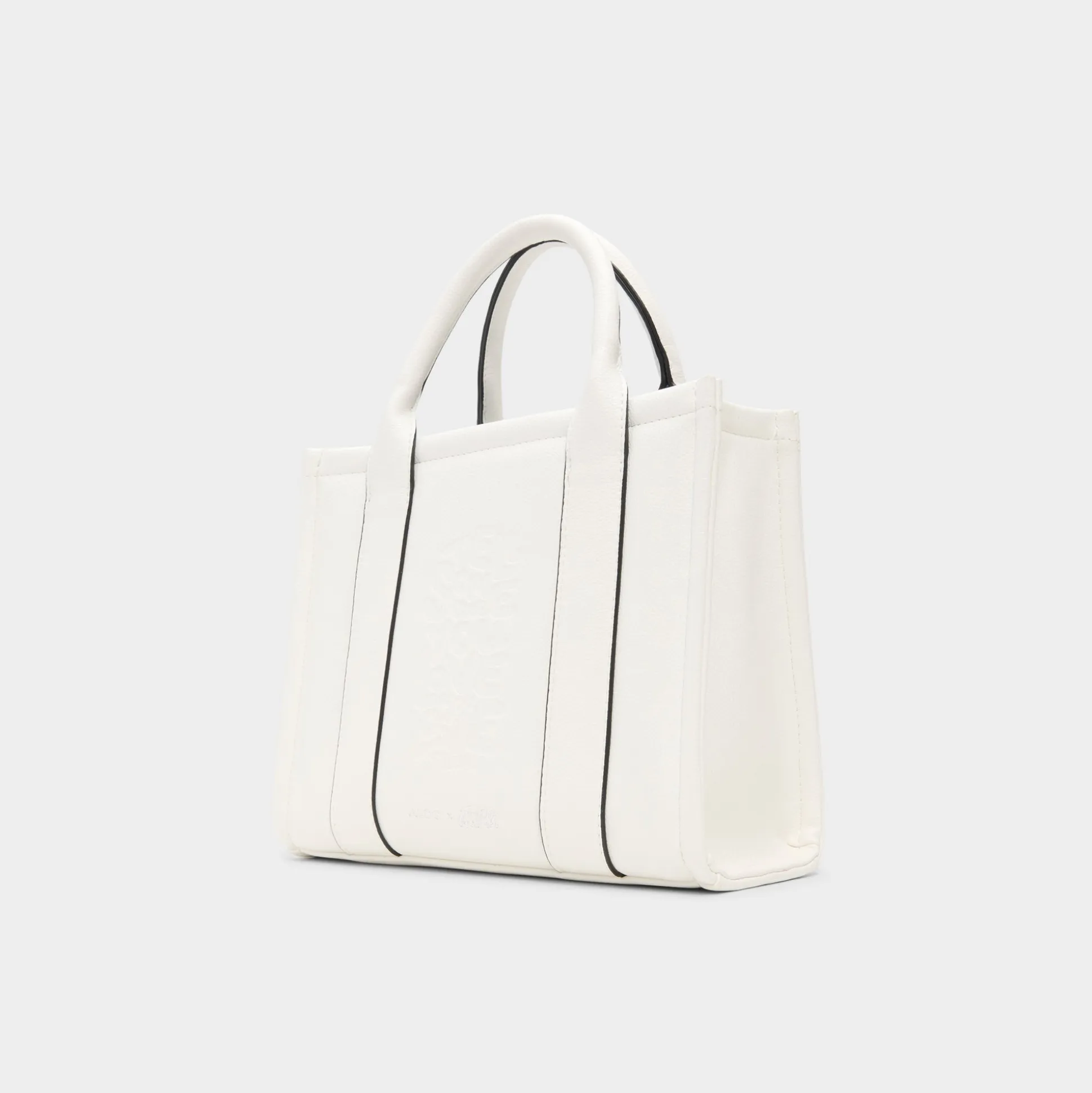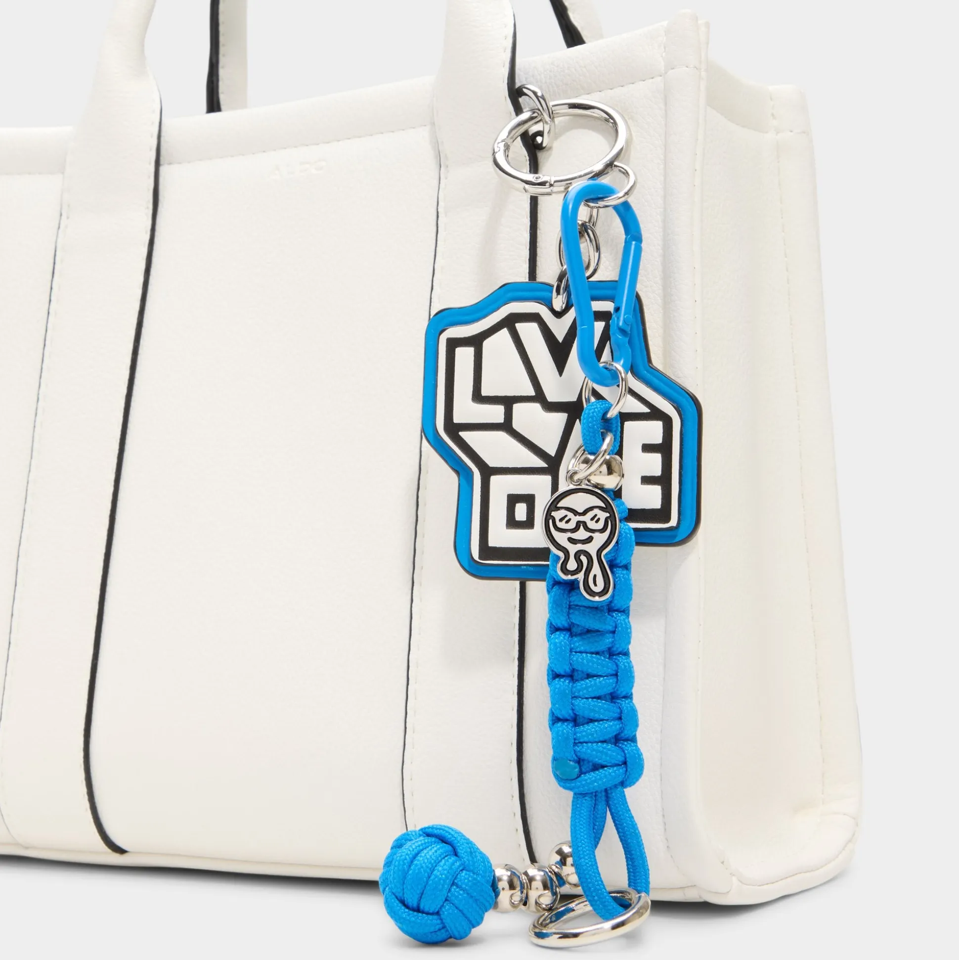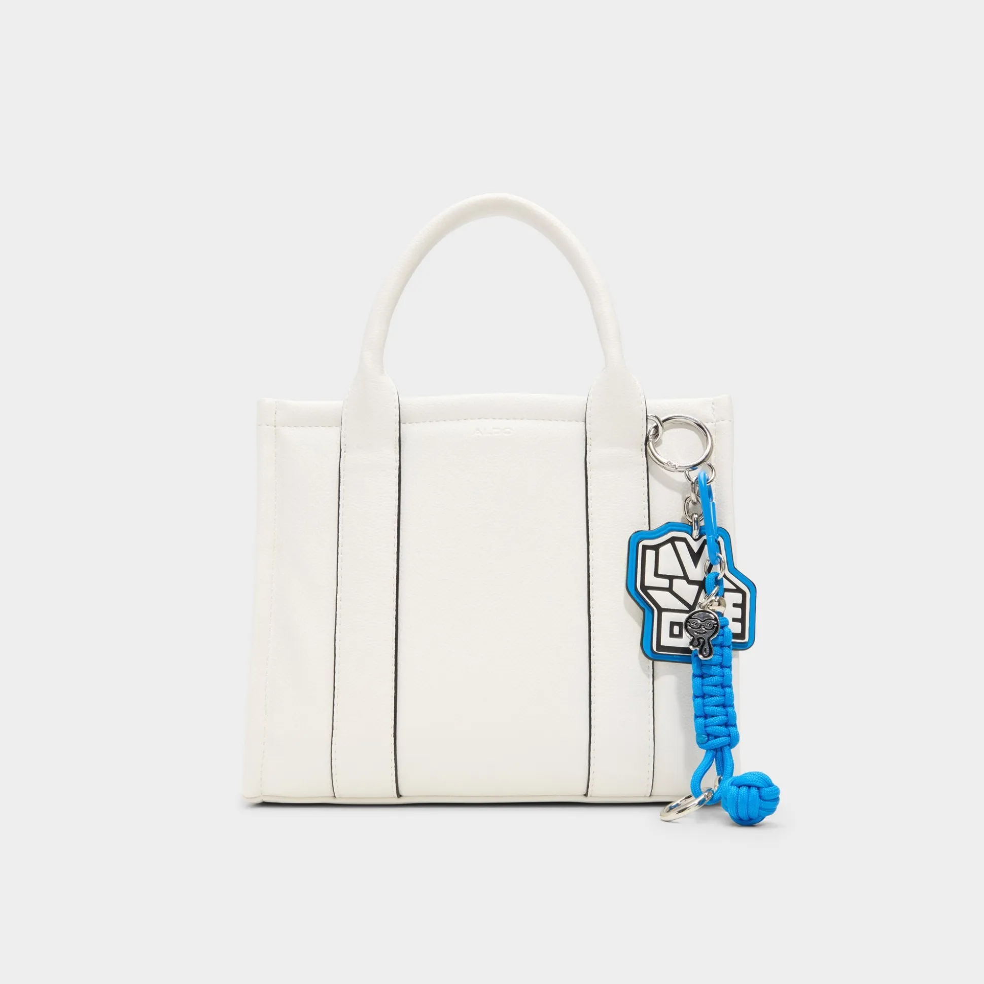 Clean-cut white leather with racer-black piping gives this mini tote modern edge, while a clip-off electric-blue paracord charm adds a playful pop to the open-top silhouette that’s made for quick grabs on the move. Carry it with an oversized linen blazer for coffee meetings or tuck next to denim cut-offs for festival days, finishing looks with crisp confidence.