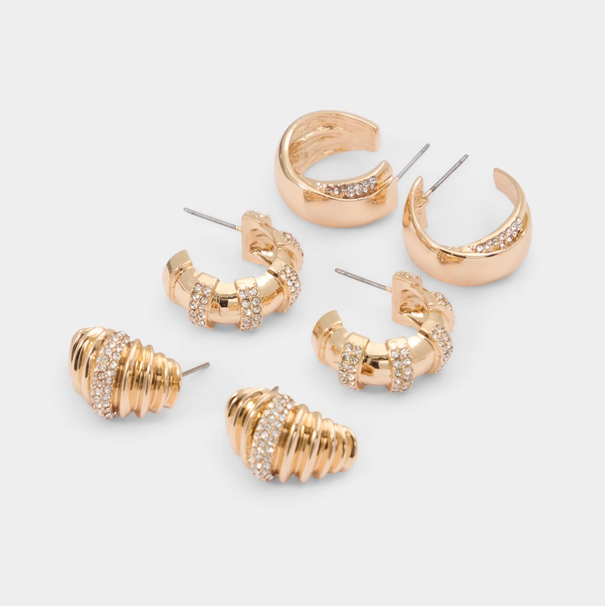 Croissant-curved hoops gleam with stripes, a trio that brings shine and mix-and-match freedom to every look, from coffee runs to rooftop drinks. Layer them with a slip for glam, or stack with a denim jacket and tee for casual ease.