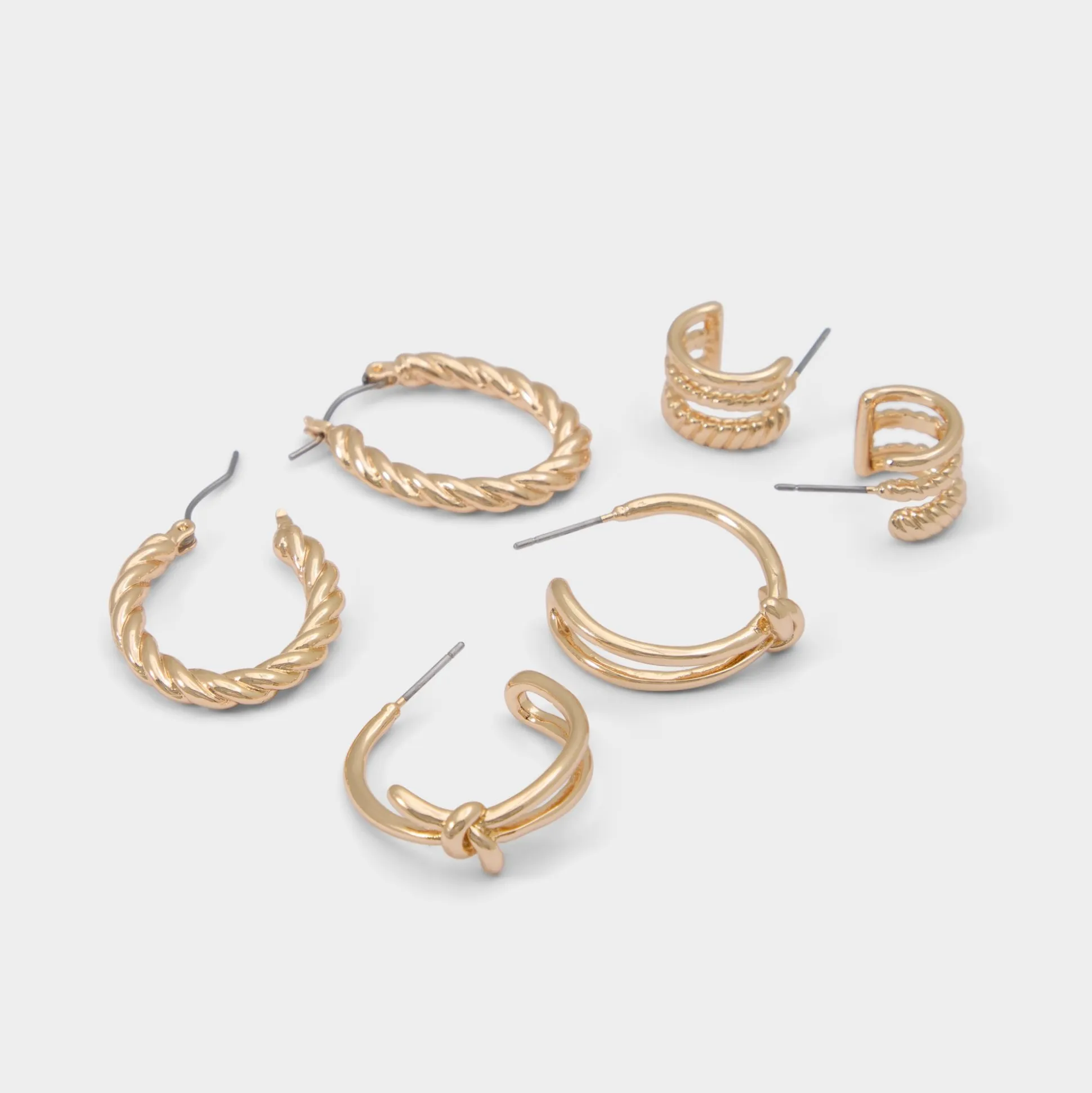 Rope-twist texture meets smooth knots across six mini hoops and cuffs in glossy stainless steel for everyday shine. Layer the rope pair with the cuff to frame a crisp shirt at study sessions, or stack every piece with beachy waves for parties.